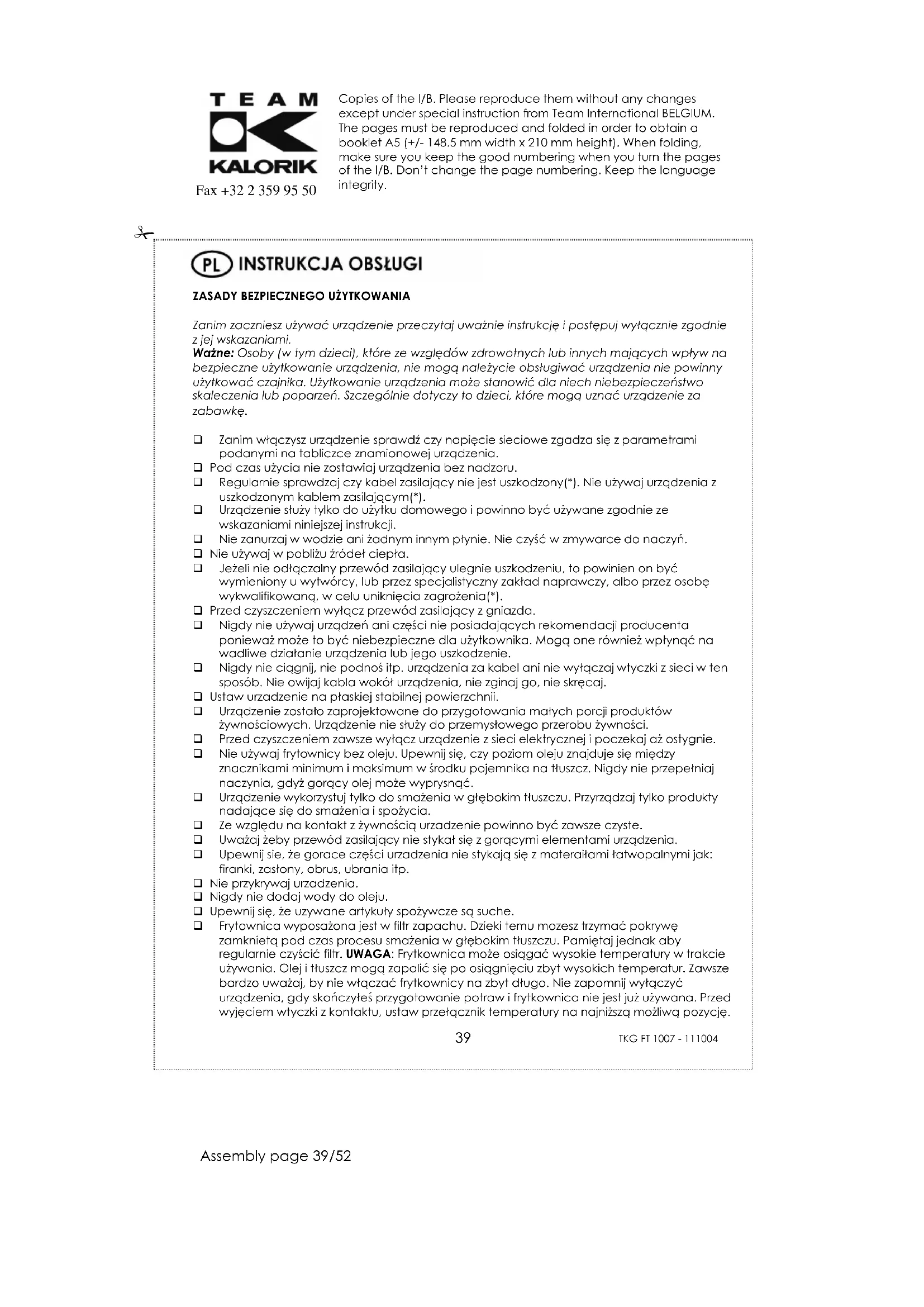 Zanim zaczniesz używać urządzenie przeczytaj uważnie instrukcję i postępuj wyłącznie zgodnie z jej wskazaniami. Ważne: Osoby (w tym dzieci), które ze względów zdrowotnych lub innych mających wpływ na bezpieczne użytkowanie urządzenia, nie mogą należycie obsługiwać urządzenia nie powinny użytkować czajnika. Użytkowanie urządzenia może stanowić dla niech niebezpieczeństwo skaleczenia lub poparzeń. Szczególnie dotyczy to dzieci, które mogą uznać urządzenie za zabawkę. Zanim włączysz urządzenie sprawdź czy napięcie sieciowe zgadza się z parametrami podanymi na tabliczce znamionowej urządzenia. Pod czas użycia nie zostawiaj urządzenia bez nadzoru. Regularnie sprawdzaj czy kabel zasilający nie jest uszkodzony(*). Nie używaj urządzenia z uszkodzonym kablem zasilającym(*). Urządzenie służy tylko do użytku domowego i powinno być używane zgodnie ze wskazaniami niniejszej instrukcji. Nie zanurzaj w wodzie ani żadnym innym płynie. Nie czyść w zmywarce do naczyń. Nie używaj w pobliżu źródeł ciepła. Jeżeli nie odłączalny przewód zasilający ulegnie uszkodzeniu, to powinien on być wymieniony u wytwórcy, lub przez specjalistyczny zakład naprawczy, albo przez osobę wykwalifikowaną, w celu uniknięcia zagrożenia(*). Przed czyszczeniem wyłącz przewód zasilający z gniazda. Nigdy nie używaj urządzeń ani części nie posiadających rekomendacji producenta ponieważ może to być niebezpieczne dla użytkownika. Mogą one również wpłynąć na wadliwe działanie urządzenia lub jego uszkodzenie. Nigdy nie ciągnij, nie podnoś itp. urządzenia za kabel ani nie wyłączaj wtyczki z sieci w ten sposób. Nie owijaj kabla wokół urządzenia, nie zginaj go, nie skręcaj. Ustaw urzadzenie na płaskiej stabilnej powierzchnii. Urządzenie zostało zaprojektowane do przygotowania małych porcji produktów żywnościowych. Urządzenie nie służy do przemysłowego przerobu żywności. Przed czyszczeniem zawsze wyłącz urządzenie z sieci elektrycznej i poczekaj aż ostygnie. Nie używaj frytownicy bez oleju. Upewnij się, czy poziom oleju znajduje się między znacznikami minimum i maksimum w środku pojemnika na tłuszcz. Nigdy nie przepełniaj naczynia, gdyż gorący olej może wyprysnąć. Urządzenie wykorzystuj tylko do smażenia w głębokim tłuszczu. Przyrządzaj tylko produkty nadające się do smażenia i spożycia. Ze względu na kontakt z żywnością urzadzenie powinno być zawsze czyste. Uważaj żeby przewód zasilający nie stykał się z gorącymi elementami urządzenia. Upewnij sie, że gorace części urzadzenia nie stykają się z materaiłami łatwopalnymi jak: firanki, zasłony, obrus, ubrania itp. Nie przykrywaj urzadzenia. Nigdy nie dodaj wody do oleju. Upewnij się, że uzywane artykuły spożywcze są suche. Frytownica wyposażona jest w filtr zapachu. Dzieki temu mozesz trzymać pokrywę zamknietą pod czas procesu smażenia w głębokim tłuszczu. Pamiętaj jednak aby regularnie czyścić filtr. UWAGA: Frytkownica może osiągać wysokie temperatury w trakcie używania. Olej i tłuszcz mogą zapalić się po osiągnięciu zbyt wysokich temperatur. Zawsze bardzo uważaj, by nie włączać frytkownicy na zbyt długo. Nie zapomnij wyłączyć urządzenia, gdy skończyłeś przygotowanie potraw i frytkownica nie jest już używana. Przed wyjęciem wtyczki z kontaktu, ustaw przełącznik temperatury na najniższą możliwą pozycję.Copies of the I/B. Please reproduce them without any changes except under special instruction from Team International BELGIUM. The pages must be reproduced and folded in order to obtain a booklet A5 (+/- 148.5 mm width x 210 mm height). When folding, make sure you keep the good numbering when you turn the pages of the I/B. Don’t change the page numbering. Keep the language integrity.