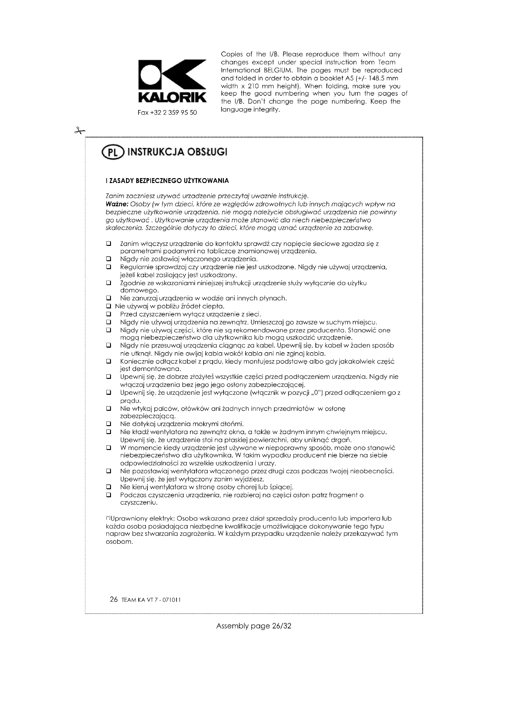Przed przeniesieniem albo czyszczeniem zawsze odłączaj kabel zasilania z prądu. Aby usunąć brud z plastikowych powierzchni, używaj lekko wilgotnej szmatki. Nigdy nie używaj szorstkich substancji, które mogłyby uszkodzić urządzenie. Użyj odkurzacza, by usunąć kurz z kraty wentylatora bez potrzeby rozmontowywania urządzenia. Nigdy nie zanurzaj wentylatora w wodzie ani innej cieczy. Copies of the I/B. Please reproduce them without any changes except under special instruction from Team International BELGIUM. The pages must be reproduced and folded in order to obtain a booklet A5 (+/- 148.5 mm width x 210 mm height). When folding, make sure you keep the good numbering when you turn the pages of the I/B. Don’t change the page numbering. Keep the language integrity.