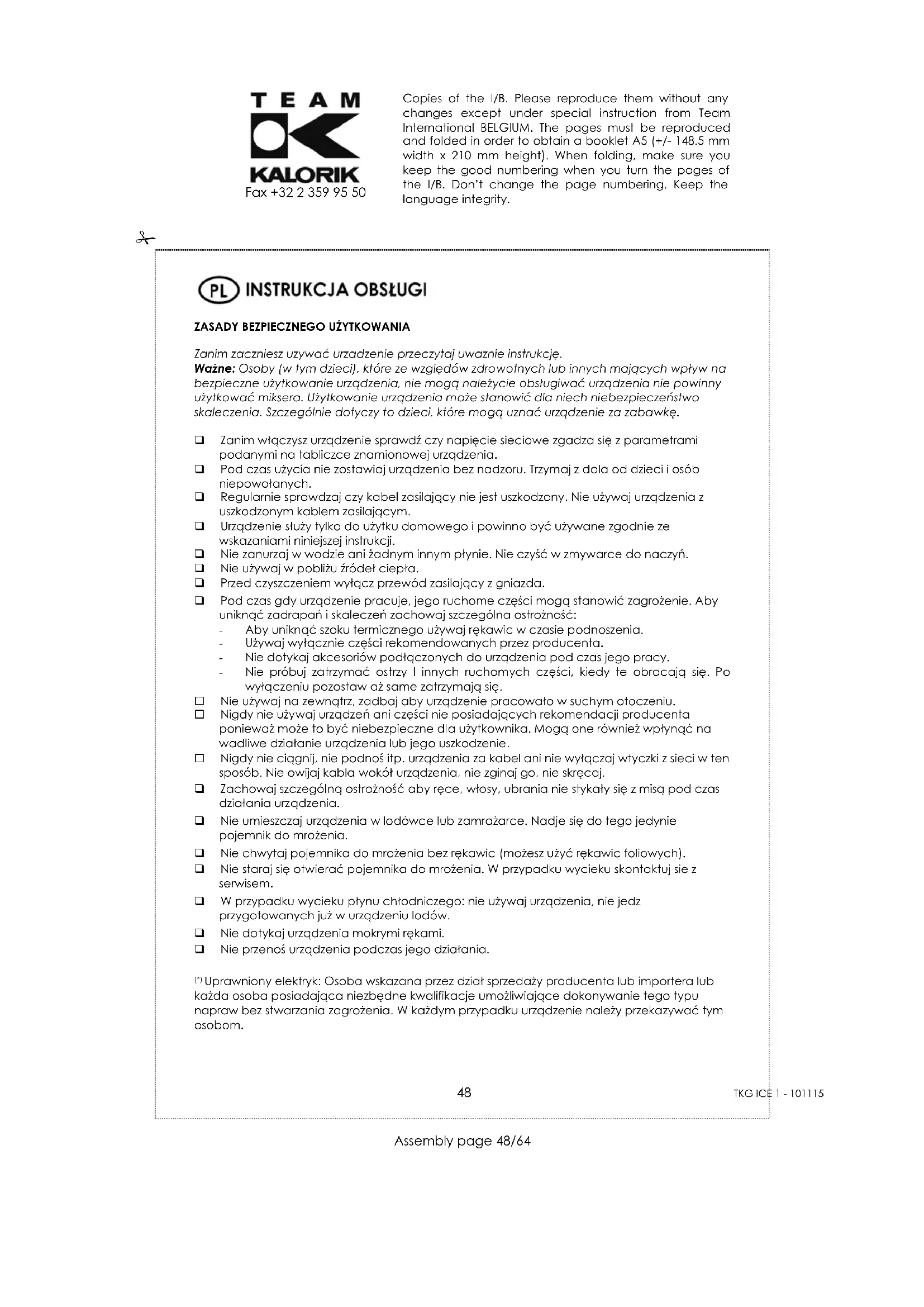 Assembly page 50/64 Copies of the I/B. Please reproduce them without any changes except under special instruction from Team International BELGIUM. The pages must be reproduced and folded in order to obtain a booklet A5 (+/- 148.5 mm width x 210 mm height). When folding, make sure you keep the good numbering when you turn the pages of the I/B. Don’t change the page numbering. Keep the language integrity. Fax +32 2 359 95 50 Bananowe 150g cukru - 150ml mleka - 300g pulpy bananowej - odrobina soku z cytryny Obierz banany I pokrój w niewielkie kawałki. Dodaj sok z cytryny i cukier. Mieszając dodaj mleko i dokładnie wymieszaj. Przelej do pojemnika. Czekoladowe 200g cukru – 400ml mleka – 200ml śmietanki – 2 jaja – 100g czekolady Pokrusz czekoladę I wymieszaj z odrobina mleka i wanilią. Ubij jaja z cukrem I wymieszaj z reszta mleka, dodaj czekoladę (całość musi być zimna). Wymieszaj i wlej do pojemnika. Jagodowe 200g cukru - 250g of śmietanki - 400g mrożonych jagód - ½ cytryny Rozmroź jagody I pozostaw aż uzyskasz syrop. Dodaj sok z cytryny, śmietankę i cukier. Wymieszaj dokładnie i wlej do pojemnika. Truskawkowe 150g cukru - 250ml mleka - 200g śmietanki - 1 jajo - 300g truskawek Ubij jajko z cukrem, dodaj truskawki pokrojone w małe kawałki I reszte składników. Dokładnie wymieszaj i przelej do pojemnika.