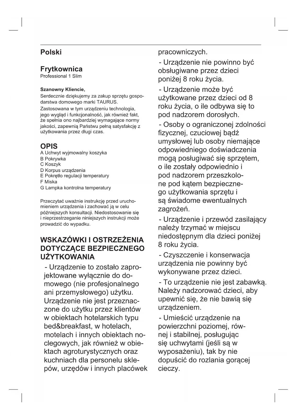 Professional 1 Slim - Frytkownica TAURUS - Bezpłatna instrukcja obsługi