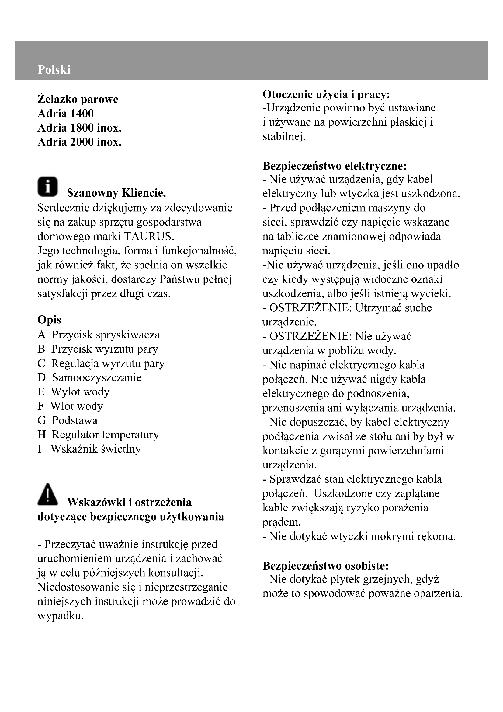 Adria 1400 - żelazko TAURUS - Bezpłatna instrukcja obsługi