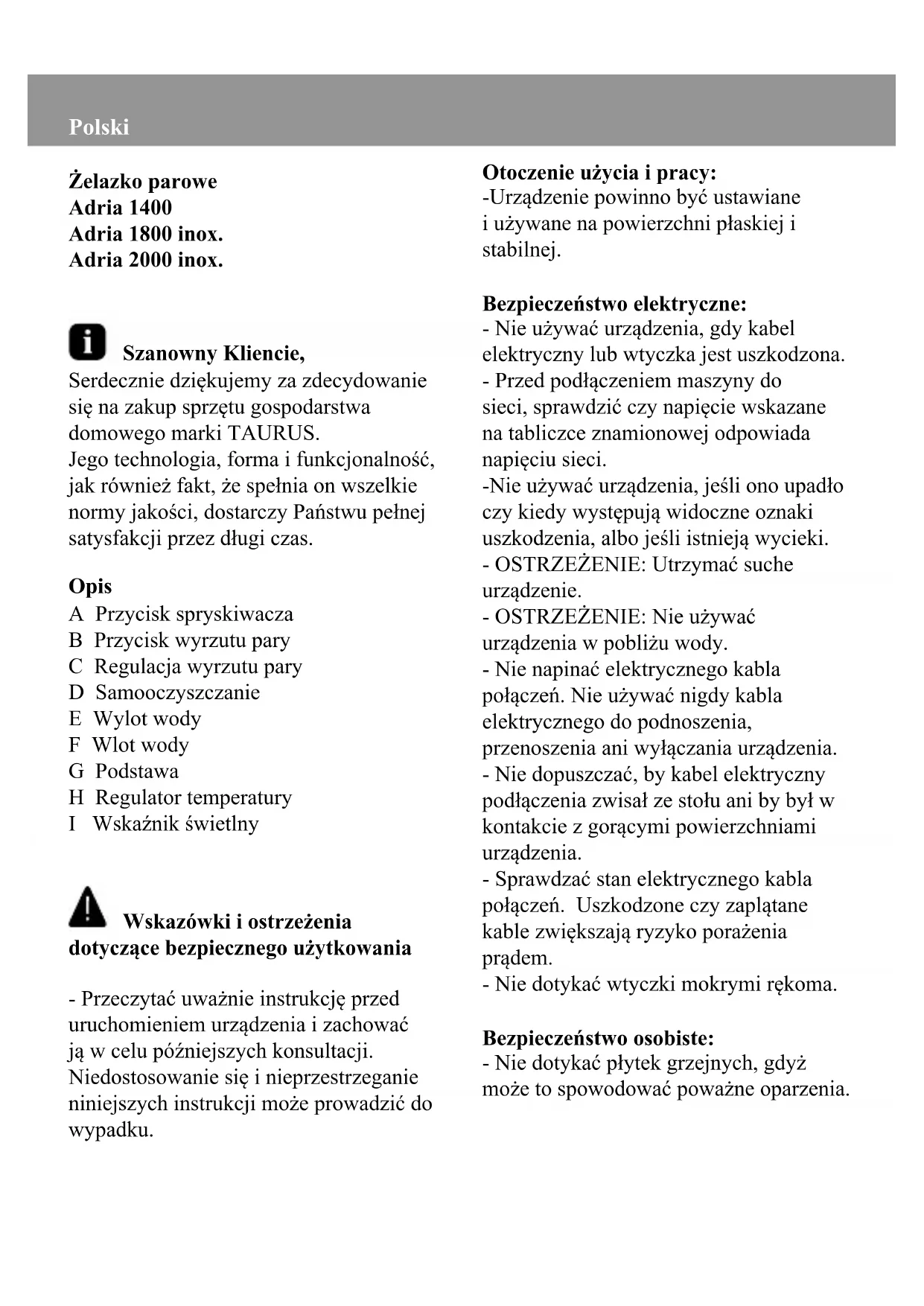 Adria 1800 inox - żelazko TAURUS - Bezpłatna instrukcja obsługi