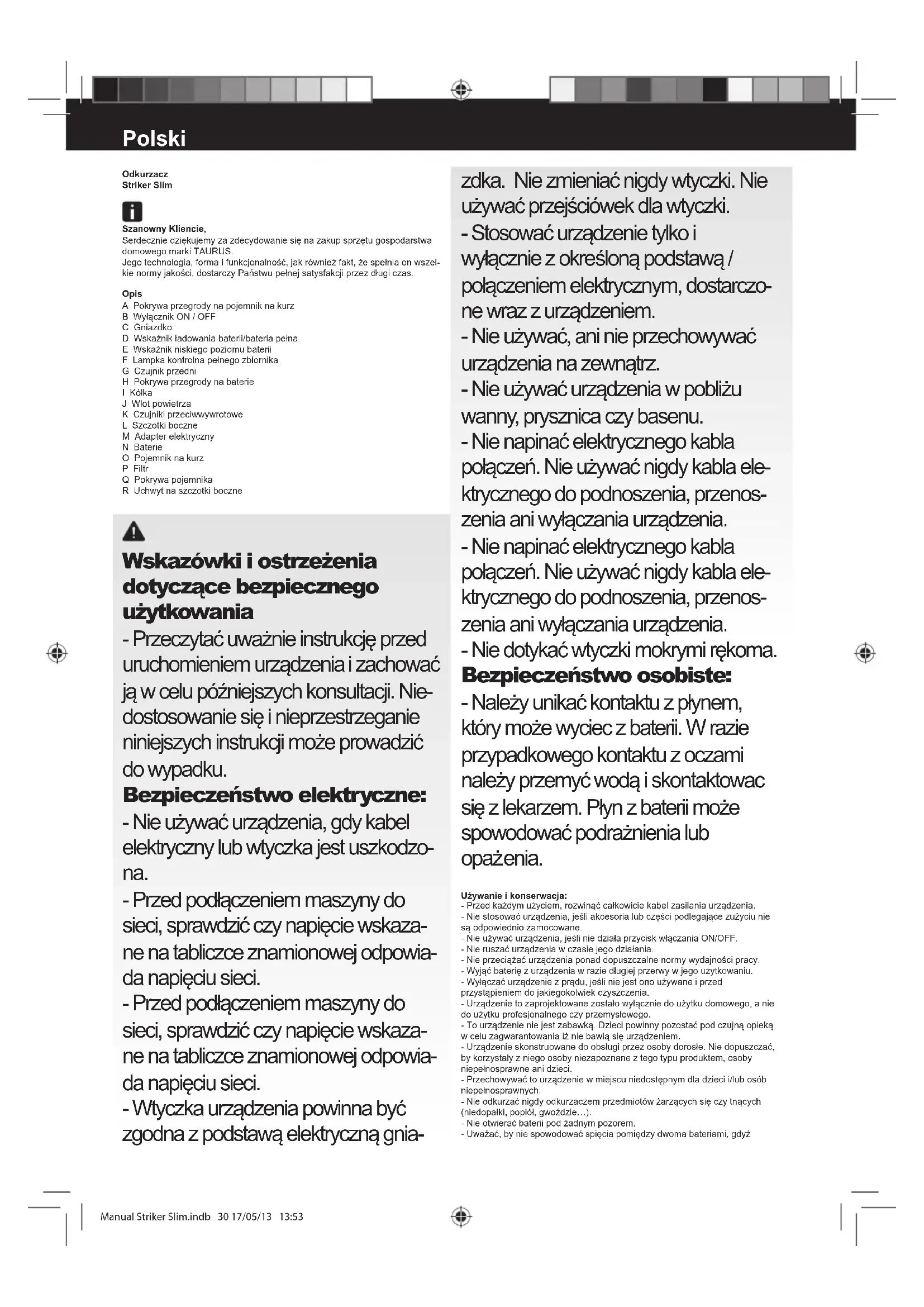 Het apparaat beweegt naar achteren als u het aanzet. U gebruikt het apparaat op een donker oppervlak (het licht weerkaatst op de grond). Zet de twee hoogtesensoren op positie 2 of 3 (Abf.10). Manual Striker Slim.indb 28 17/05/13 13:53- Bij beschadiging dient u contact op te nemen met de klantendienst. Het nummer staat vermeld op het garantiebewijs. Probeer het apparaat niet zelf te demonteren of herstellen. Dit kan gevaarlijk zijn. - Als de elektriciteitsaansluiting beschadigd is, moet deze vervangen worden zoals bij een defect. Voor produkten afkomstig uit de Europese Unie en/of indien de wetgeving van het land waaruit het produkt afkomstig is dit vereist: Milieuvriendelijkheid en recycleerbaarheid van het product - De verpakking van dit apparaat bestaat uit gerecycleerd materiaal. Als u zich van dit materiaal wenst te ontdoen, kunt u gebruik maken van de openbare containers die voor ieder type materiaal geschikt zijn. - Het product bevat geen concentraties materialen die schadelijk zijn voor het milieu. Dit symbool betekent dat indien u zich van dit product wilt ontdoen als het eenmaal versleten is, het product naar een erkende afvalverwerker dient te brengen die voor de selectieve ophaling van Afgedankte Elektrische en Elektronische Apparatuur (AEEA). Dit symbool betekent dat het product batterijen of accu’s kan bevatten die uit het product gehaald moeten worden als het product verwijderd wordt. Denk eraan dat de batterijen/accu’s in speciaal daarvoor voorziene containers gegooid moeten worden en dat ze nooit in het vuur gegooid mogen worden. Hoe haalt U de batterijen uit het apparaat: WAARSCHUWING: Het is belangrijk dat de batterijen helemaal leeg zijn, voor U ze uit het apparaat haalt. Indien het apparaat versleten is dient u de accu’s te verwijderen voordat u het apparaat weggooit. Hiervoor moet u: - Verwijder het dekseltje van het batterijvak. - Verwijder de batterij uit het batterijvak. - Verwijder het dekseltje van het batterijvak. Dit apparaat voldoet aan de Laagspanningsrichtlijn 2006/95/EG en de richtlijn 2004/108/EG inzake elektromagnetische compatibiliteit. Manual Striker Slim.indb 29 17/05/13 13:53Polski Odkurzacz Striker Slim Szanowny Kliencie, Serdecznie dziękujemy za zdecydowanie się na zakup sprzętu gospodarstwa domowego marki TAURUS. Jego technologia, forma i funkcjonalność, jak również fakt, że spełnia on wszel- kie normy jakości, dostarczy Państwu pełnej satysfakcji przez długi czas. Opis A Pokrywa przegrody na pojemnik na kurz B Wyłącznik ON / OFF C Gniazdko D Wskaźnik ładowania baterii/bateria pełna E Wskaźnik niskiego poziomu baterii F Lampka kontrolna pełnego zbiornika G Czujnik przedni H Pokrywa przegrody na baterie I Kółka J Wlot powietrza K Czujniki przeciwwywrotowe L Szczotki boczne M Adapter elektryczny N Baterie O Pojemnik na kurz P Filtr Q Pokrywa pojemnika R Uchwyt na szczotki boczne Wskazówki i ostrzeżenia dotyczące bezpiecznego użytkowania - Przeczytać uważnie instrukcję przed uruchomieniem urządzenia i zachować ją w celu późniejszych konsultacji. Nie- dostosowanie się i nieprzestrzeganie niniejszych instrukcji może prowadzić do wypadku. Bezpieczeństwo elektryczne: - Nie używać urządzenia, gdy kabel elektryczny lub wtyczka jest uszkodzo- na. - Przed podłączeniem maszyny do sieci, sprawdzić czy napięcie wskaza- ne na tabliczce znamionowej odpowia- da napięciu sieci. - Przed podłączeniem maszyny do sieci, sprawdzić czy napięcie wskaza- ne na tabliczce znamionowej odpowia- da napięciu sieci. - Wtyczka urządzenia powinna być zgodna z podstawą elektryczną gnia- zdka. Nie zmieniać nigdy wtyczki. Nie używać przejściówek dla wtyczki. - Stosować urządzenie tylko i wyłącznie z okre śloną podstawą / połączeniem elektrycznym, dostarczo- ne wraz z urządzeniem. - Nie używać, ani nie przechowywać urządzenia na zewnątrz. - Nie używać urządzenia w pobliżu wanny, prysznica czy basenu. - Nie napinać elektrycznego kabla połączeń. Nie używać nigdy kabla ele- ktrycznego do podnoszenia, przenos- zenia ani wyłączania urządzenia. - Nie napinać elektrycznego kabla połączeń. Nie używać nigdy kabla ele- ktrycznego do podnoszenia, przenos- zenia ani wyłączania urządzenia. - Nie dotykać wtyczki mokrymi rękoma. Bezpieczeństwo osobiste: - Należy unikać kontaktu z płynem, który może wyciec z baterii. W razie przypadkowego kontaktu z oczami należy przemyć wodą i skontaktowac się z lekarzem. Płyn z baterii może spowodować podrażnienia lub opażenia. Używanie i konserwacja: - Przed każdym użyciem, rozwinąć całkowicie kabel zasilania urządzenia. - Nie stosować urządzenia, jeśli akcesoria lub części podlegające zużyciu nie są odpowiednio zamocowane. - Nie używać urządzenia, jeśli nie działa przycisk włączania ON/OFF. - Nie ruszać urządzenia w czasie jego działania. - Nie przeciążać urządzenia ponad dopuszczalne normy wydajności pracy. - Wyjąć baterię z urządzenia w razie długiej przerwy w jego użytkowaniu. - Wyłączać urządzenie z prądu, jeśli nie jest ono używane i przed przystąpieniem do jakiegokolwiek czyszczenia. - Urządzenie to zaprojektowane zostało wyłącznie do użytku domowego, a nie do użytku profesjonalnego czy przemysłowego. - To urządzenie nie jest zabawką. Dzieci powinny pozostać pod czujną opieką w celu zagwarantowania iż nie bawią się urządzeniem. - Urządzenie skonstruowane do obsługi przez osoby dorosłe. Nie dopuszczać, by korzystały z niego osoby niezapoznane z tego typu produktem, osoby niepełnosprawne ani dzieci. - Przechowywać to urządzenie w miejscu niedostępnym dla dzieci i/lub osób niepełnosprawnych. - Nie odkurzać nigdy odkurzaczem przedmiotów żarzących się czy tnących (niedopałki, popiół, gwoździe…). - Nie otwierać baterii pod żadnym pozorem. - Uważać, by nie spowodować spięcia pomiędzy dwoma bateriami, gdyż Manual Striker Slim.indb 30 17/05/13 13:53istnieje ry
