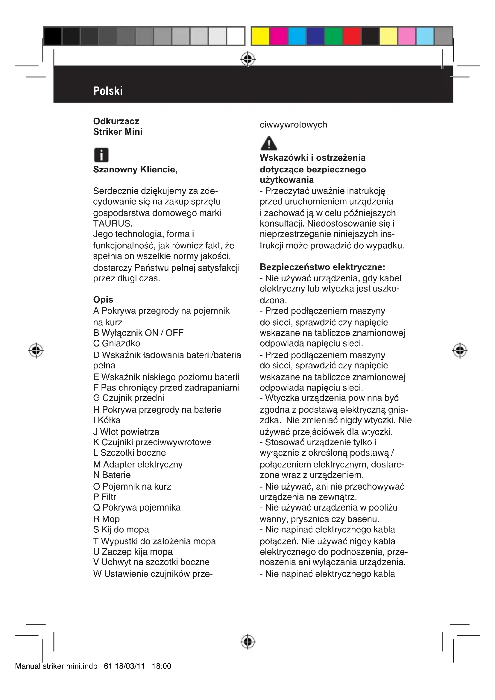 8 Het apparaat beweegt naar achteren als u het aanzet. U gebruikt het appa- raat op een donker oppervlak (het licht weerkaatst op de grond). Zet de twee hoogte- sensoren op positie 2 of 3 (Abf.10). - Bij beschadiging dient u contact op te nemen met de klantendienst. Het nummer staat vermeld op het garantiebewijs. Probeer het apparaat niet zelf te demonteren of herstellen. Dit kan gevaarlijk zijn. - Als de elektriciteitsaansluiting beschadigd is, moet deze vervangen worden zoals bij een defect. Voor produkten afkomstig uit de Europe- se Unie en/of indien de wetgeving van het land waaruit het produkt afkomstig is dit vereist: Milieuvriendelijkheid en recycleerbaar- heid van het product - De verpakking van dit apparaat bestaat uit gerecycleerd materiaal. Als u zich van dit materiaal wenst te ontdoen, kunt u gebruik maken van de openbare containers die voor ieder type materiaal geschikt zijn. - Het product bevat geen concentra- ties materialen die schadelijk zijn voor het milieu. - Dit symbool betekent dat indien u zich van dit product wilt ontdoen als het eenmaal versleten is, het product naar een erkende afvalverwerker dient te brengen die voor de selectieve ophaling van Afgedankte Elektrische en Elektronische Apparatuur (AEEA). - Dit symbool betekent dat het product batterijen of accu’s kan bevatten die uit het product gehaald moeten worden als het product verwijderd wordt. Denk eraan dat de batterijen/accu’s in speciaal daarvoor voorziene containers gegooid moeten worden en dat ze nooit in het vuur gegooid mogen worden. Manual striker mini.indb 59 18/03/11 18:00Hoe haalt U de batterijen uit het apparaat: WAARSCHUWING: Het is belangrijk dat de batterijen helemaal leeg zijn, voor U ze uit het apparaat haalt. Indien het apparaat versleten is dient u de accu’s te verwijderen voordat u het apparaat weggooit. Hiervoor moet u: - Verwijder het dekseltje van het batterijvak. - Verwijder de batterij uit het batte- rijvak. - Verwijder het dekseltje van het batterijvak. Dit apparaat voldoet aan de Laags- panningsrichtlijn 2006/95/EG en de richtlijn 2004/108/EG inzake elektro- magnetische compatibiliteit. Manual striker mini.indb 60 18/03/11 18:00Polski Odkurzacz Striker Mini Szanowny Kliencie, Serdecznie dziękujemy za zde- cydowanie się na zakup sprzętu gospodarstwa domowego marki TAURUS. Jego technologia, forma i funkcjonalność, jak również fakt, że spełnia on wszelkie normy jakości, dostarczy Państwu pełnej satysfakcji przez długi czas. Opis A Pokrywa przegrody na pojemnik na kurz B Wyłącznik ON / OFF C Gniazdko D Wskaźnik ładowania baterii/bateria pełna E Wskaźnik niskiego poziomu baterii F Pas chroniący przed zadrapaniami G Czujnik przedni H Pokrywa przegrody na baterie I Kółka J Wlot powietrza K Czujniki przeciwwywrotowe L Szczotki boczne M Adapter elektryczny N Baterie O Pojemnik na kurz P Filtr Q Pokrywa pojemnika R Mop S Kij do mopa T Wypustki do założenia mopa U Zaczep kija mopa V Uchwyt na szczotki boczne W Ustawienie czujników prze- ciwwywrotowych Wskazówki i ostrzeżenia dotyczące bezpiecznego użytkowania - Przeczytać uważnie instrukcję przed uruchomieniem urządzenia i zachować ją w celu późniejszych konsultacji. Niedostosowanie się i nieprzestrzeganie niniejszych ins- trukcji może prowadzić do wypadku. Bezpieczeństwo elektryczne: - Nie używać urządzenia, gdy kabel elektryczny lub wtyczka jest uszko- dzona. - Przed podłączeniem maszyny do sieci, sprawdzić czy napięcie wskazane na tabliczce znamionowej odpowiada napięciu sieci. - Przed podłączeniem maszyny do sieci, sprawdzić czy napięcie wskazane na tabliczce znamionowej odpowiada napięciu sieci. - Wtyczka urządzenia powinna być zgodna z podstawą elektryczną gnia- zdka. Nie zmieniać nigdy wtyczki. Nie używać przejściówek dla wtyczki. - Stosować urządzenie tylko i wyłącznie z określoną podstawą / połączeniem elektrycznym, dostarc- zone wraz z urządzeniem. - Nie używać, ani nie przechowywać urządzenia na zewnątrz. - Nie używać urządzenia w pobliżu wanny, prysznica czy basenu. - Nie napinać elektrycznego kabla połączeń. Nie używać nigdy kabla elektrycznego do podnoszenia, prze- noszenia ani wyłączania urządzenia. - Nie napinać elektrycznego kabla Manual striker mini.indb 61 18/03/11 18:00połączeń. Nie używać nigdy kabla elektrycznego do podnoszenia, prze- noszenia ani wyłączania urządzenia. - Nie dotykać wtyczki mokrymi rękoma. Bezpieczeństwo osobiste: - Należy unikać kontaktu z płynem, który może wyciec z baterii. W razie przypadkowego kontaktu z oczami należy przemyć wodą i skontaktowac się z lekarzem. Płyn z baterii może spowodować podrażnienia lub opażenia. Używanie i konserwacja: - Przed każdym użyciem, rozwinąć całkowicie kabel zasilania urządzenia. - Nie stosować urządzenia, jeśli akce- soria lub części podlegające zużyciu nie są odpowiednio zamocowane. - Nie używać urządzenia, jeśli nie działa przycisk włączania ON/OFF. - Nie ruszać urządzenia w czasie jego działania. - Nie przeciążać urządzenia ponad dopuszczalne normy wydajności pracy. - Wyjąć baterię z urządzenia w razie długiej przerwy w jego użytkowaniu. - Wyłączać urządzenie z prądu, jeśli nie jest ono używane i przed przystąpieniem do jakiegokolwiek czyszczenia. - Urządzenie to zaprojektowane zostało wyłącznie do użytku domowe- go, a nie do użytku profesjonalnego czy przemysłowego. - To urządzenie nie jest zabawką. Dzieci powinny pozostać pod czujną opieką w celu zagwarantowania iż nie bawią się urządzeniem. - Urządzenie skonstruowane do obsługi przez osoby dorosłe. Nie dopuszczać, by korzystały z niego osoby niezapoznane z tego typu produktem, osoby niepełnosprawne ani dzieci. - Przechowywać to urządzenie w miejscu niedostępnym dla dzieci i/lub osób niepełnosprawnych. - Nie odkurzać nigdy odkurzaczem pr- zedmiotów żarzących się czy tnących (niedopałki, popiół, gwoździe…). -