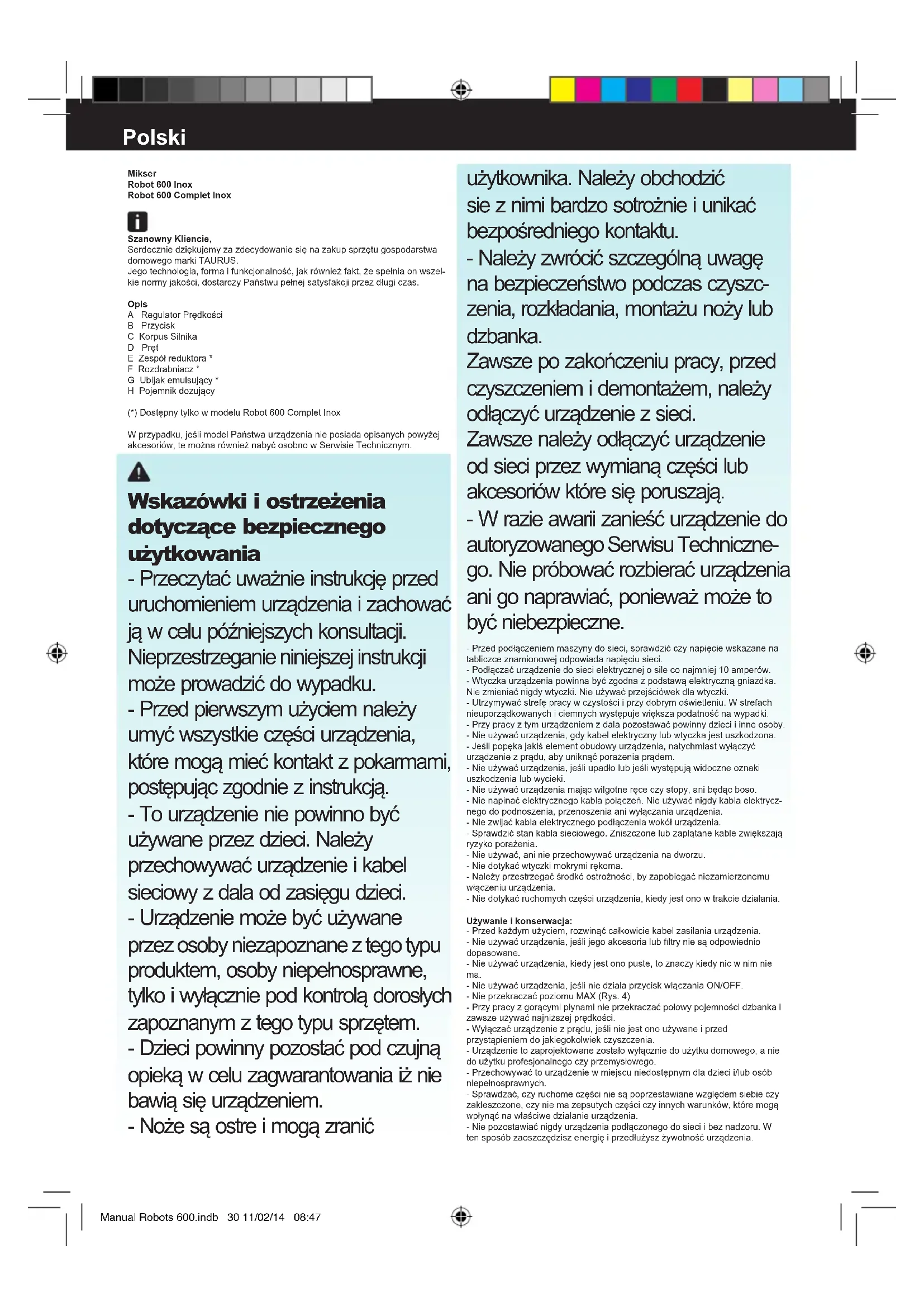 INSTRUKCJA OBSŁUGI Robot 600 Complet Inox TAURUS
