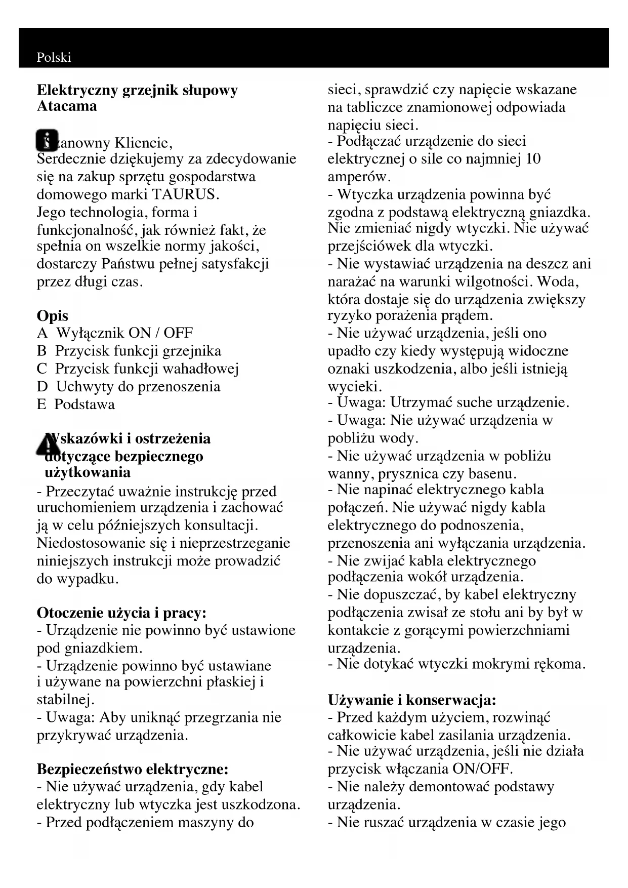 ONDERDOMPELEN. - Maak het apparaat schoon met een vochtige doek met een paar druppels afwasmiddel en maak het apparaat daarna goed droog. - Gebruik geen oplosmiddelen of producten met een zure of basisch ph, zoals bleekwater, noch schuurmiddelen, om het apparaat schoon te maken. - Dompel het apparaat niet onder in water of een andere vloeistof en houd het niet onder de kraan. Defecten en reparatie - Bij een defect, moet u het apparaat naar een erkende technische dienst brengen. Probeer het apparaat niet zelf te demonteren of te repareren, want dit kan gevaarlijk zijn. - Als de elektriciteitsaansluiting beschadigd is, moet deze vervangen worden zoals bij een defect. Voor produkten afkomstig uit de Europese Unie en/of indien de wetgeving van het land waaruit het produkt afkomstig is dit vereist: Milieuvriendelijkheid en recycleerbaarheid van het product - De verpakking van dit apparaat bestaat uit gerecycleerd materiaal. Als u zich van dit materiaal wenst te ontdoen, kunt u gebruik maken van de openbare containers die voor ieder type materiaal geschikt zijn. - Het product bevat geen concentraties materialen die schadelijk zijn voor het milieu. Dit apparaat voldoet aan de Laagspanningsrichtlijn 2006/95/EG en de richtlijn 2004/108/EG inzake elektromagnetische compatibiliteit. - Dit symbool betekent dat indien u zich van dit product wilt ontdoen als het eenmaal versleten is, het product naar een erkende afvalverwerker dient te brengen die voor de selectieve ophaling van Afgedankte Elektrische en Elektronische Apparatuur (AEEA).Polski Elektryczny grzejnik słupowy Atacama Szanowny Kliencie, Serdecznie dziękujemy za zdecydowanie się na zakup sprzętu gospodarstwa domowego marki TAURUS. Jego technologia, forma i funkcjonalność, jak również fakt, że spełnia on wszelkie normy jakości, dostarczy Państwu pełnej satysfakcji przez długi czas. Opis A Wyłącznik ON / OFF B Przycisk funkcji grzejnika C Przycisk funkcji wahadłowej D Uchwyty do przenoszenia E Podstawa Wskazówki i ostrzeżenia dotyczące bezpiecznego użytkowania - Przeczytać uważnie instrukcję przed uruchomieniem urządzenia i zachować ją w celu późniejszych konsultacji. Niedostosowanie się i nieprzestrzeganie niniejszych instrukcji może prowadzić do wypadku. Otoczenie użycia i pracy: - Urządzenie nie powinno być ustawione pod gniazdkiem. - Urządzenie powinno być ustawiane i używane na powierzchni płaskiej i stabilnej. - Uwaga: Aby uniknąć przegrzania nie przykrywać urządzenia. Bezpieczeństwo elektryczne: - Nie używać urządzenia, gdy kabel elektryczny lub wtyczka jest uszkodzona. - Przed podłączeniem maszyny do sieci, sprawdzić czy napięcie wskazane na tabliczce znamionowej odpowiada napięciu sieci. - Podłączać urządzenie do sieci elektrycznej o sile co najmniej 10 amperów. - Wtyczka urządzenia powinna być zgodna z podstawą elektryczną gniazdka. Nie zmieniać nigdy wtyczki. Nie używać przejściówek dla wtyczki. - Nie wystawiać urządzenia na deszcz ani narażać na warunki wilgotności. Woda, która dostaje się do urządzenia zwiększy ryzyko porażenia prądem. - Nie używać urządzenia, jeśli ono upadło czy kiedy występują widoczne oznaki uszkodzenia, albo jeśli istnieją wycieki. - Uwaga: Utrzymać suche urządzenie. - Uwaga: Nie używać urządzenia w pobliżu wody. - Nie używać urządzenia w pobliżu wanny, prysznica czy basenu. - Nie napinać elektrycznego kabla połączeń. Nie używać nigdy kabla elektrycznego do podnoszenia, przenoszenia ani wyłączania urządzenia. - Nie zwijać kabla elektrycznego podłączenia wokół urządzenia. - Nie dopuszczać, by kabel elektryczny podłączenia zwisał ze stołu ani by był w kontakcie z gorącymi powierzchniami urządzenia. - Nie dotykać wtyczki mokrymi rękoma. Używanie i konserwacja: - Przed każdym użyciem, rozwinąć całkowicie kabel zasilania urządzenia. - Nie używać urządzenia, jeśli nie działa przycisk włączania ON/OFF. - Nie należy demontować podstawy urządzenia. - Nie ruszać urządzenia w czasie jegodziałania. - Jeśli urządzenie jest używane w łazience lub podobnym miejscu, wyłączać urządzenie z prądu, kiedy nie jest ono używane, nawet jeśli ma to miejsce na krótki okres czasu, ponieważ bliskość wody stanowi zagrożenie, nawet jeśli urządzenie jest wyłączone. - Wyłączać urządzenie z prądu, jeśli nie jest ono używane i przed przystąpieniem do jakiegokolwiek czyszczenia. - Urządzenie to zaprojektowane zostało wyłącznie do użytku domowego, a nie do użytku profesjonalnego czy przemysłowego. - To urządzenie nie jest zabawką. Dzieci powinny pozostać pod czujną opieką w celu zagwarantowania iż nie bawią się urządzeniem. - Urządzenie skonstruowane do obsługi przez osoby dorosłe. Nie dopuszczać, by korzystały z niego osoby niezapoznane z tego typu produktem, osoby niepełnosprawne ani dzieci. - Przechowywać to urządzenie w miejscu niedostępnym dla dzieci i/lub osób niepełnosprawnych. - Urządzenie nie jest wyposażone w instrument kontrolujący temperaturę otoczenia. Nie należy używać w małych pomieszczeniach w obecności osób niepełnosprawnych pozostawionych bez opieki, które w razie zagrożenia nie mogłyby opuścić pomieszczenia. - Nie wystawiać urządzenia na wysokie temperatury. - Wszelkie niewłaściwe użycie lub niezgodne z instrukcją obsługi może doprowadzić do niebezpieczeństwa, anulując przy tym gwarancję i odpowiedzialność producenta. Instalacja - Wtyczka powinna być zawsze w miejscu łatwo dostępnym, aby w razie zagrożenia można ją było szybko wyciągnąć z kontaktu. - Urządzenie powinno zawsze działać z dobrze dopasowaną podstawą dolną. Montaż podstawy: - Aby zmontować podstawę, należy umieścić urządzenie do góry dnem. - Złączyć podstawę z bazą. - Zamocować przy pomocy nakrętek skrzydełkowych. Postawić urządzenie i sprawdzić czy baza jest dobrze zamontowana. Instrukcja obsługi Użycie: 