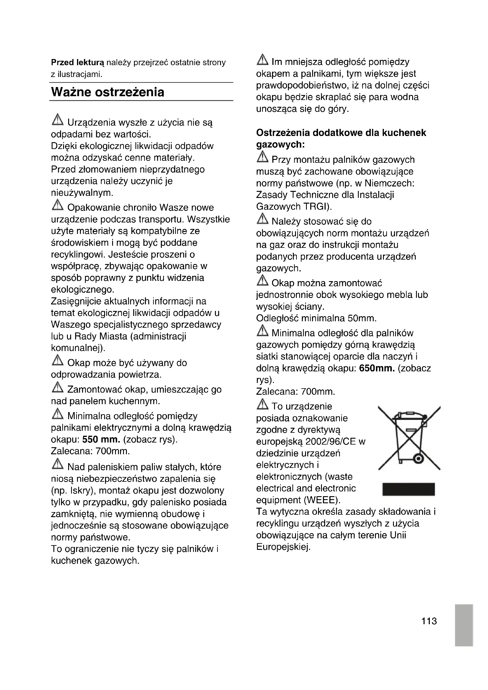 Przed lekturą należy przejrzeć ostatnie strony z ilustracjami. Ważne ostrzeżenia Urządzenia wyszłe z użycia nie są odpadami bez wartości. Dzięki ekologicznej likwidacji odpadów można odzyskać cenne materiały. Przed złomowaniem nieprzydatnego urządzenia należy uczynić je nieużywalnym. Opakowanie chroniło Wasze nowe urządzenie podczas transportu. Wszystkie użyte materiały są kompatybilne ze środowiskiem i mogą być poddane recyklingowi. Jesteście proszeni o współpracę, zbywając opakowanie w sposób poprawny z punktu widzenia ekologicznego. Zasięgnijcie aktualnych informacji na temat ekologicznej likwidacji odpadów u Waszego specjalistycznego sprzedawcy lub u Rady Miasta (administracji komunalnej). Okap może być używany do odprowadzania powietrza. Zamontować okap, umieszczając go nad panelem kuchennym. Minimalna odległość pomiędzy palnikami elektrycznymi a dolną krawędzią okapu: 550 mm. (zobacz rys). Zalecana: 700mm. Nad paleniskiem paliw stałych, które niosą niebezpieczeństwo zapalenia się (np. Iskry), montaż okapu jest dozwolony tylko w przypadku, gdy palenisko posiada zamkniętą, nie wymienną obudowę i jednocześnie są stosowane obowiązujące normy państwowe. To ograniczenie nie tyczy się palników i kuchenek gazowych. Im mniejsza odległość pomiędzy okapem a palnikami, tym większe jest prawdopodobieństwo, iż na dolnej części okapu będzie skraplać się para wodna unosząca się do góry. Ostrzeżenia dodatkowe dla kuchenek gazowych: Przy montażu palników gazowych muszą być zachowane obowiązujące normy państwowe (np. w Niemczech: Zasady Techniczne dla Instalacji Gazowych TRGI). Należy stosować się do obowiązujących norm montażu urządzeń na gaz oraz do instrukcji montażu podanych przez producenta urządzeń gazowych. Okap można zamontować jednostronnie obok wysokiego mebla lub wysokiej ściany. Odległość minimalna 50mm. Minimalna odległość dla palników gazowych pomiędzy górną krawędzią siatki stanowiącej oparcie dla naczyń i dolną krawędzią okapu: 650mm. (zobacz rys). Zalecana: 700mm. To urządzenie posiada oznakowanie zgodne z dyrektywą europejską 2002/96/CE w dziedzinie urządzeń elektrycznych i elektronicznych (waste electrical and electronic equipment (WEEE). Ta wytyczna określa zasady składowania i recyklingu urządzeń wyszłych z użycia obowiązujące na całym terenie Unii Europejskiej.114