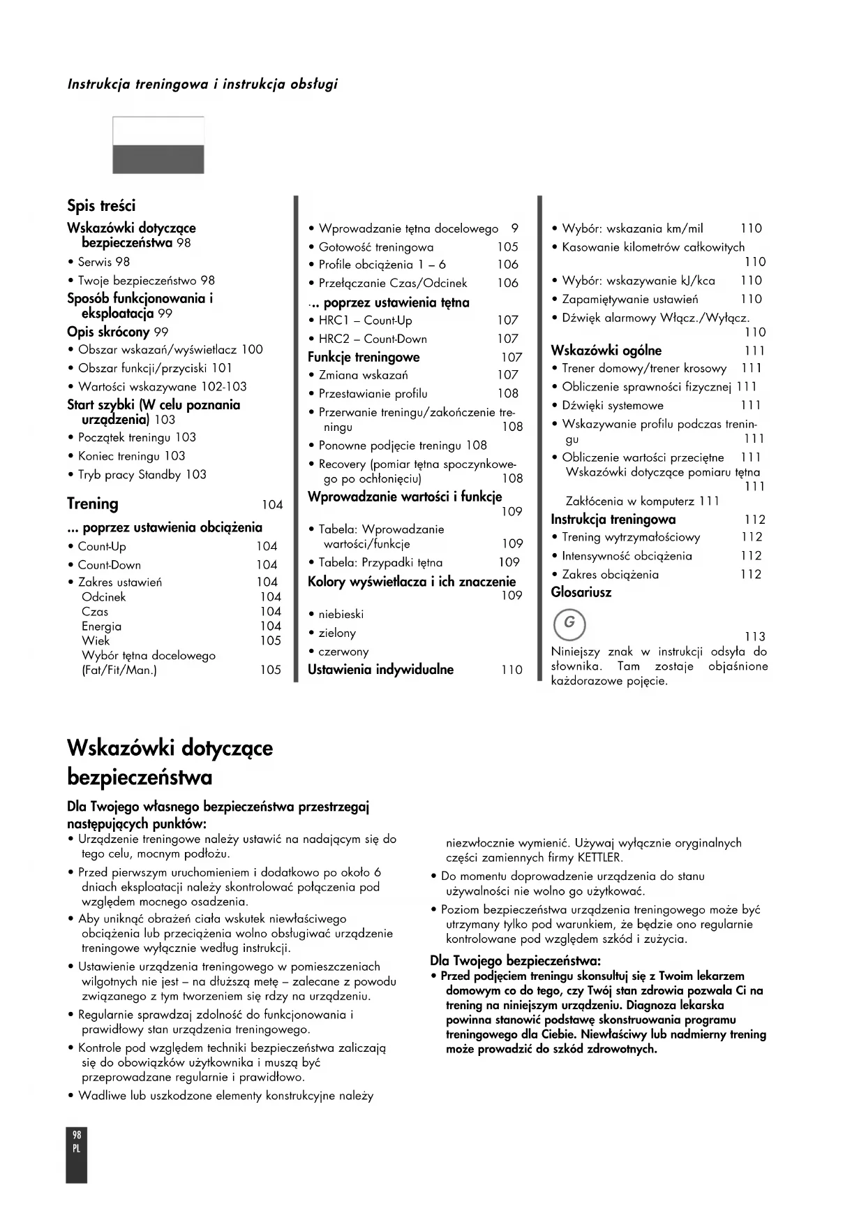 - Urządzenie treningowe należy ustawić na nadającym się dotego celu, mocnym podłożu.• Przed pierwszym uruchomieniem i dodatkowo po około 6dniach eksploatacji należy skontrolować połączenia podwzględem mocnego osadzenia.• Aby uniknąć obrażeń ciała wskutek niewłaściwegoobciążenia lub przeciążenia wolno obsługiwać urządzenietreningowe wyłącznie według instrukcji. • Ustawienie urządzenia treningowego w pomieszczeniachwilgotnych nie jest – na dłuższą metę – zalecane z powoduzwiązanego z tym tworzeniem się rdzy na urządzeniu. • Regularnie sprawdzaj zdolność do funkcjonowania iprawidłowy stan urządzenia treningowego.• Kontrole pod względem techniki bezpieczeństwa zaliczająsię do obowiązków użytkownika i muszą byćprzeprowadzane regularnie i prawidłowo. • Wadliwe lub uszkodzone elementy konstrukcyjne należyniezwłocznie wymienić. Używaj wyłącznie oryginalnychczęści zamiennych firmy KETTLER.• Do momentu doprowadzenie urządzenia do stanuużywalności nie wolno go użytkować. • Poziom bezpieczeństwa urządzenia treningowego może byćutrzymany tylko pod warunkiem, że będzie ono regularniekontrolowane pod względem szkód i zużycia. Dla Twojego bezpieczeństwa: