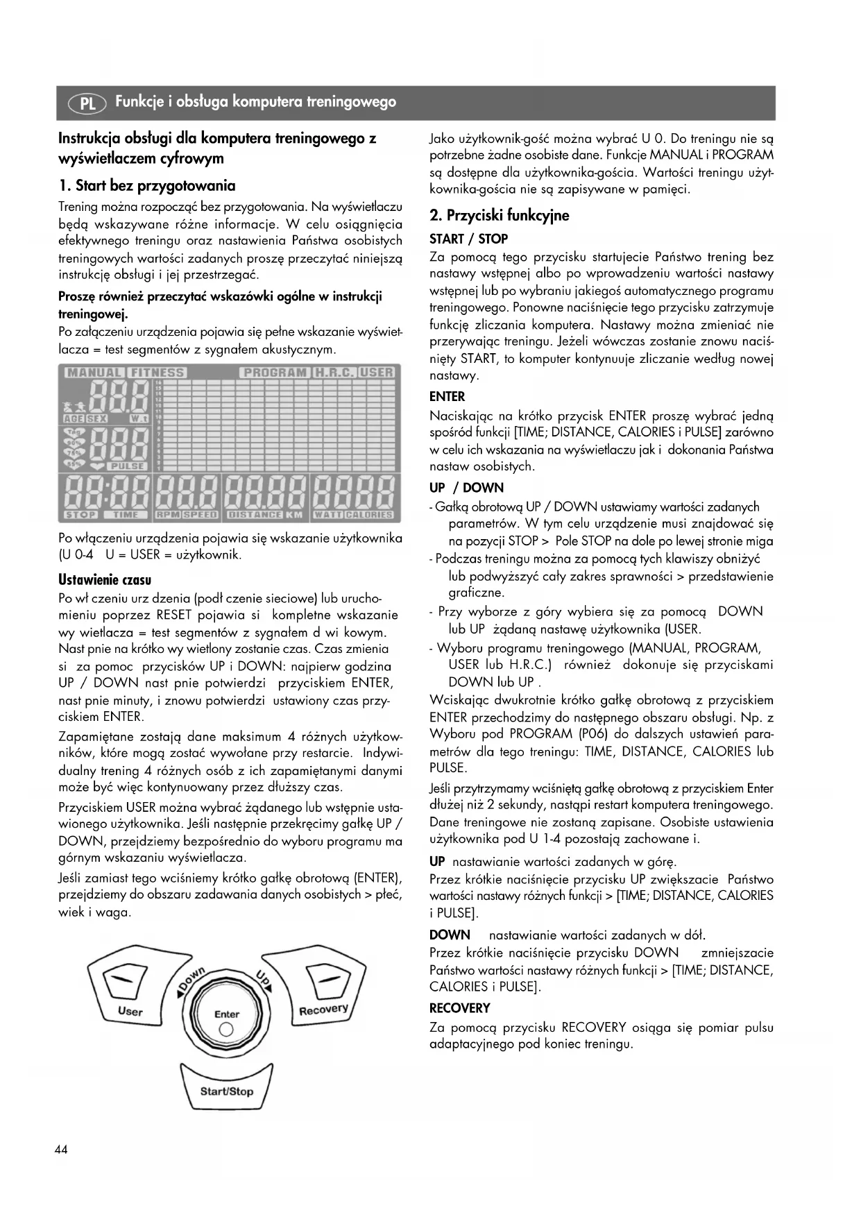 START / STOP Za pomocą tego przycisku startujecie Państwo trening bez nastawy wstępnej albo po wprowadzeniu wartości nastawy wstępnej lub po wybraniu jakiegoś automatycznego programu treningowego. Ponowne naciśnięcie tego przycisku zatrzymuje funkcję zliczania komputera. Nastawy można zmieniać nie przerywając treningu. Jeżeli wówczas zostanie znowu naciś- nięty START, to komputer kontynuuje zliczanie według nowej nastawy. ENTER Naciskając na krótko przycisk ENTER proszę wybrać jedną spośród funkcji [TIME; DISTANCE, CALORIES i PULSE] zarówno w celu ich wskazania na wyświetlaczu jak i dokonania Państwa nastaw osobistych. UP / DOWN - Gałką obrotową UP / DOWN ustawiamy wartości zadanych parametrów. W tym celu urządzenie musi znajdować się na pozycji STOP > Pole STOP na dole po lewej stronie miga - Podczas treningu można za pomocą tych klawiszy obniżyć lub podwyższyć cały zakres sprawności > przedstawienie graficzne. - Przy wyborze z góry wybiera się za pomocą DOWN lub UP żądaną nastawę użytkownika (USER. - Wyboru programu treningowego (MANUAL, PROGRAM, USER lub H.R.C.) również dokonuje się przyciskami DOWN lub UP . Wciskając dwukrotnie krótko gałkę obrotową z przyciskiem ENTER przechodzimy do następnego obszaru obsługi. Np. z Wyboru pod PROGRAM (P06) do dalszych ustawień para- metrów dla tego treningu: TIME, DISTANCE, CALORIES lub PULSE. Jeśli przytrzymamy wciśniętą gałkę obrotową z przyciskiem Enter dłużej niż 2 sekundy, nastąpi restart komputera treningowego. Dane treningowe nie zostaną zapisane. Osobiste ustawienia użytkownika pod U 1-4 pozostają zachowane i. UP nastawianie wartości zadanych w górę. Przez krótkie naciśnięcie przycisku UP zwiększacie Państwo wartości nastawy różnych funkcji > [TIME; DISTANCE, CALORIES i PULSE]. DOWN nastawianie wartości zadanych w dół. Przez krótkie naciśnięcie przycisku DOWN zmniejszacie Państwo wartości nastawy różnych funkcji > [TIME; DISTANCE, CALORIES i PULSE]. RECOVERY Za pomocą przycisku RECOVERY osiąga się pomiar pulsu adaptacyjnego pod koniec treningu.45