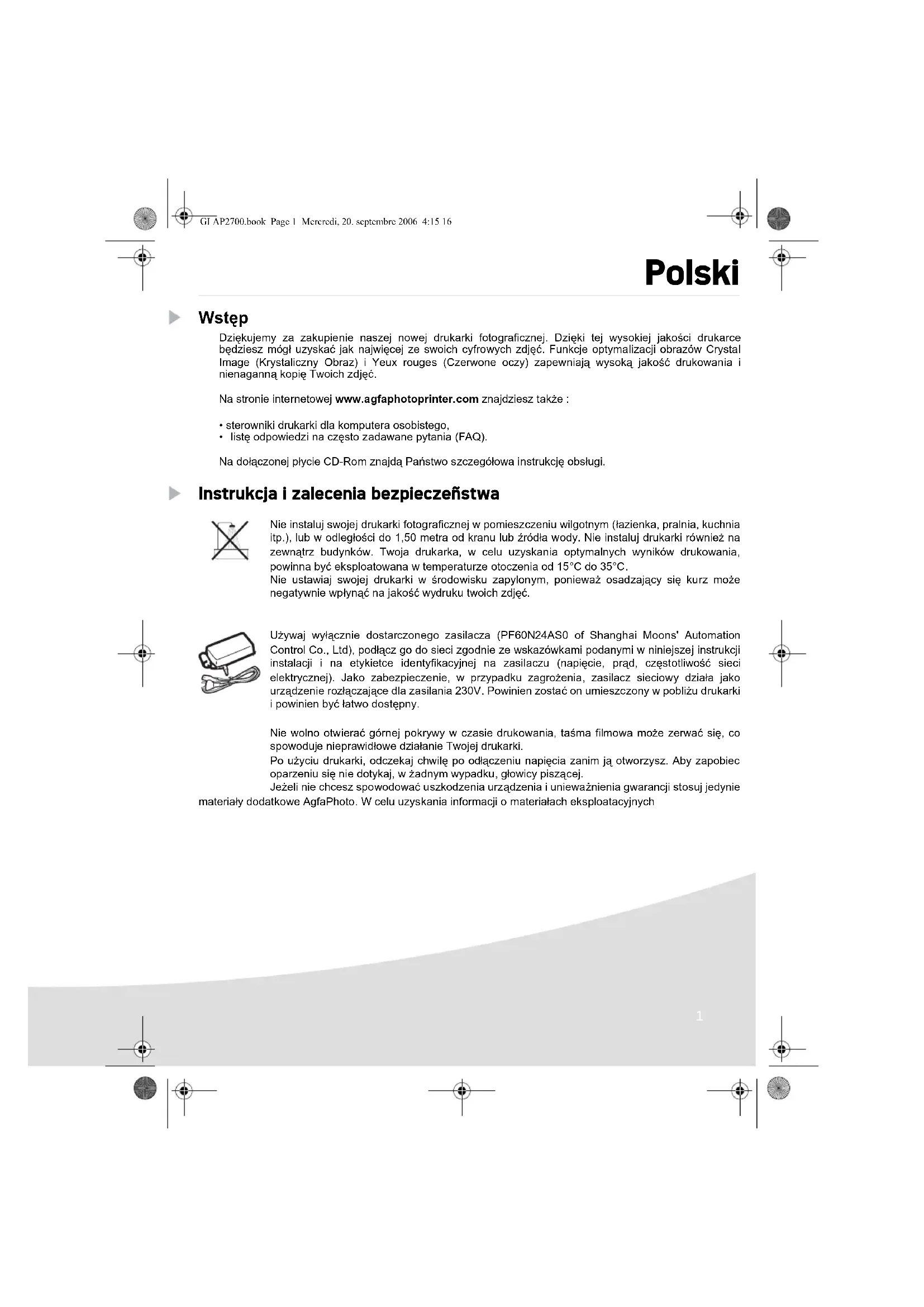 Dziekujemy za zakupienie naszej nowej drukarki fotograficznej. Dzięki tej wysokiej jakosci drukarce bedziesz mogu zyskać jak najwieczey ze swoich cyfrowych zdjeć. Funkcjé optymilazȩ obrazów Crystal Image (Kralsticyn Obraz) i Yeux rouges (Czerwone oczy) zapewniaja wysoka jakość drukowania i nienaganna kopie Twoich zdjeć.