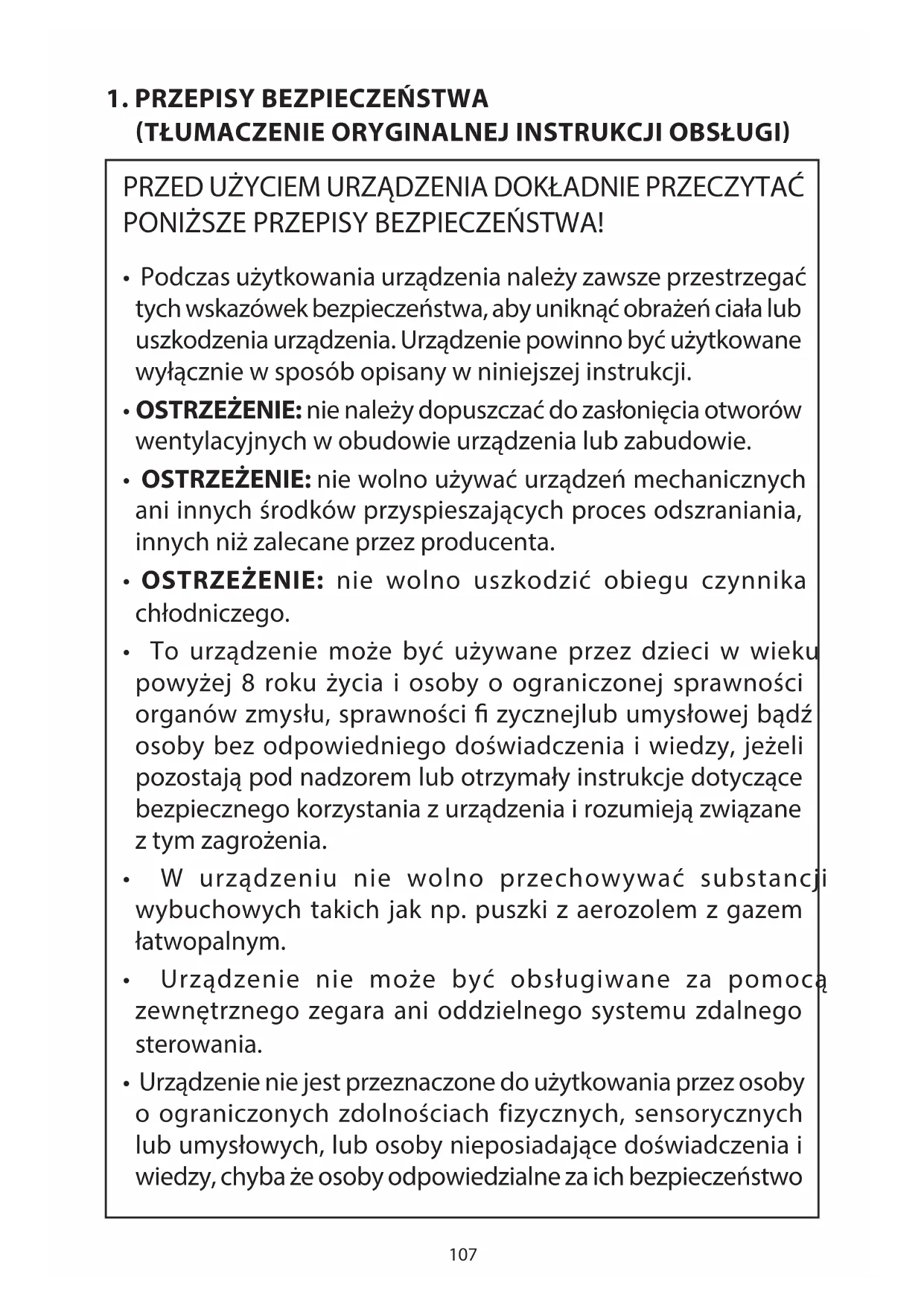 - OSTRZEŻENIE: nie wolno używać urządzeń mechanicznych ani innych środków przyspieszających proces odszraniania, innych niż zalecane przez producenta.