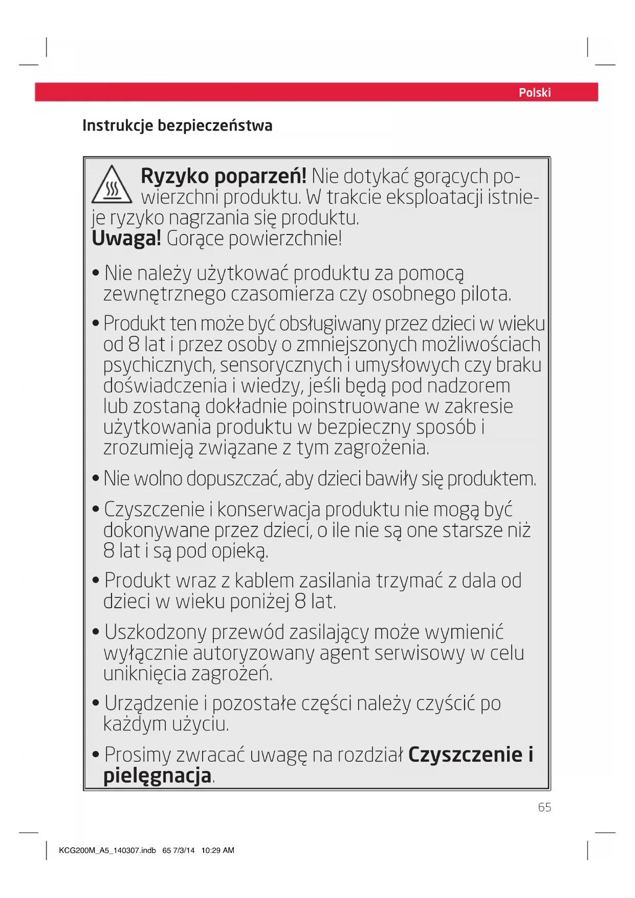 Rzyko poparzen! Nie dotykać gorących powierzchni produktu. W trakcie eksploataciystnieyko nagrzania są produktu.
