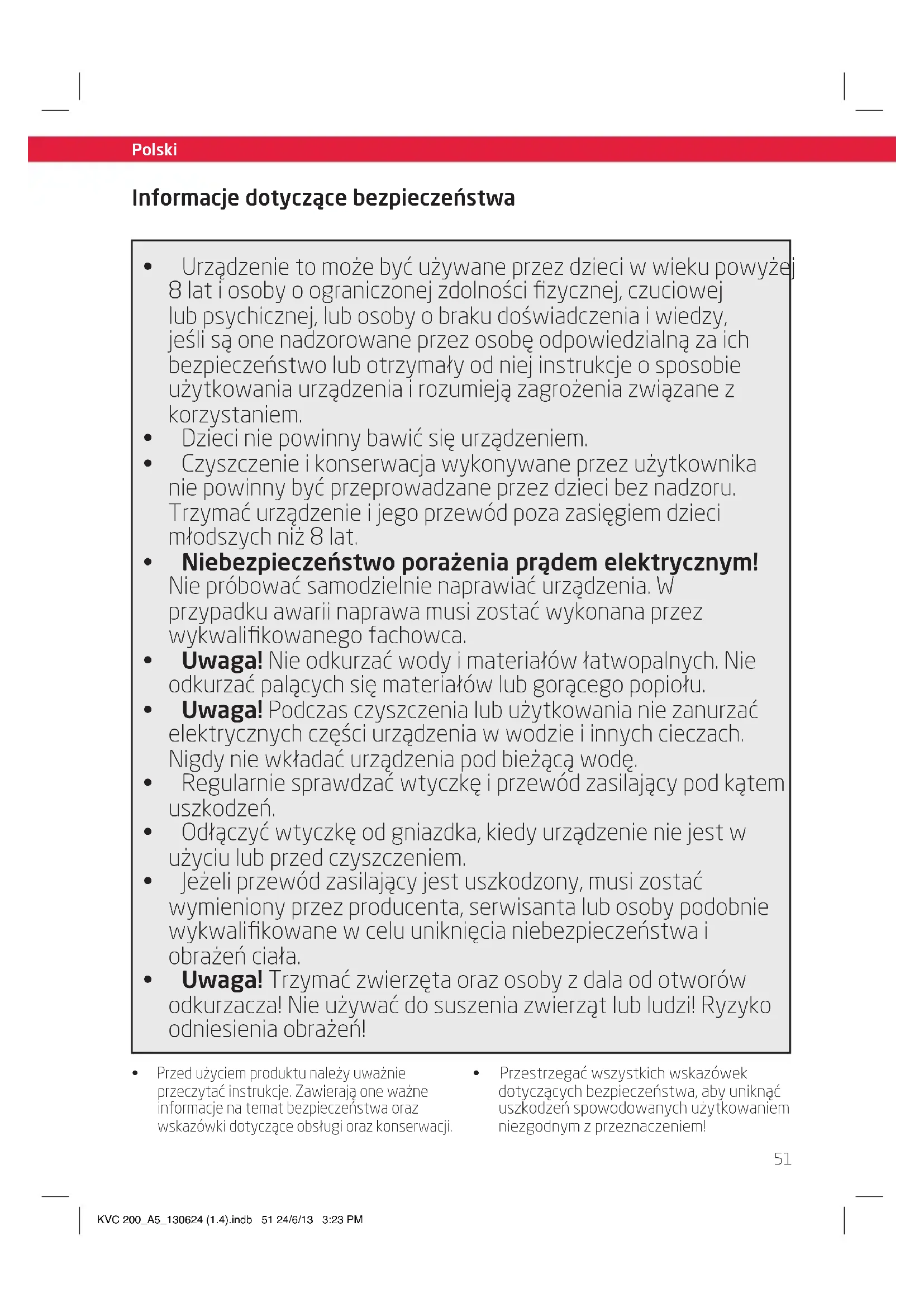 - Przestrzegaćwszystkichwskazówek dotyczącychbezpieczeństwa,abyuniknąć uszkodzeńspowodowanychużytkowaniem niezgodnymzprzeznaczeniem! KVC 200_A5_130624 (1.4).indb 51 24/6/13 3:23 PM52 Polski Polski Informacje dotyczące bezpieczeństwa Przestrzegaćostrzeżeńdotyczących bezpieczeństwaznajdującychsięna urządzeniuizawartychwniniejszej instrukcjiobsługi.