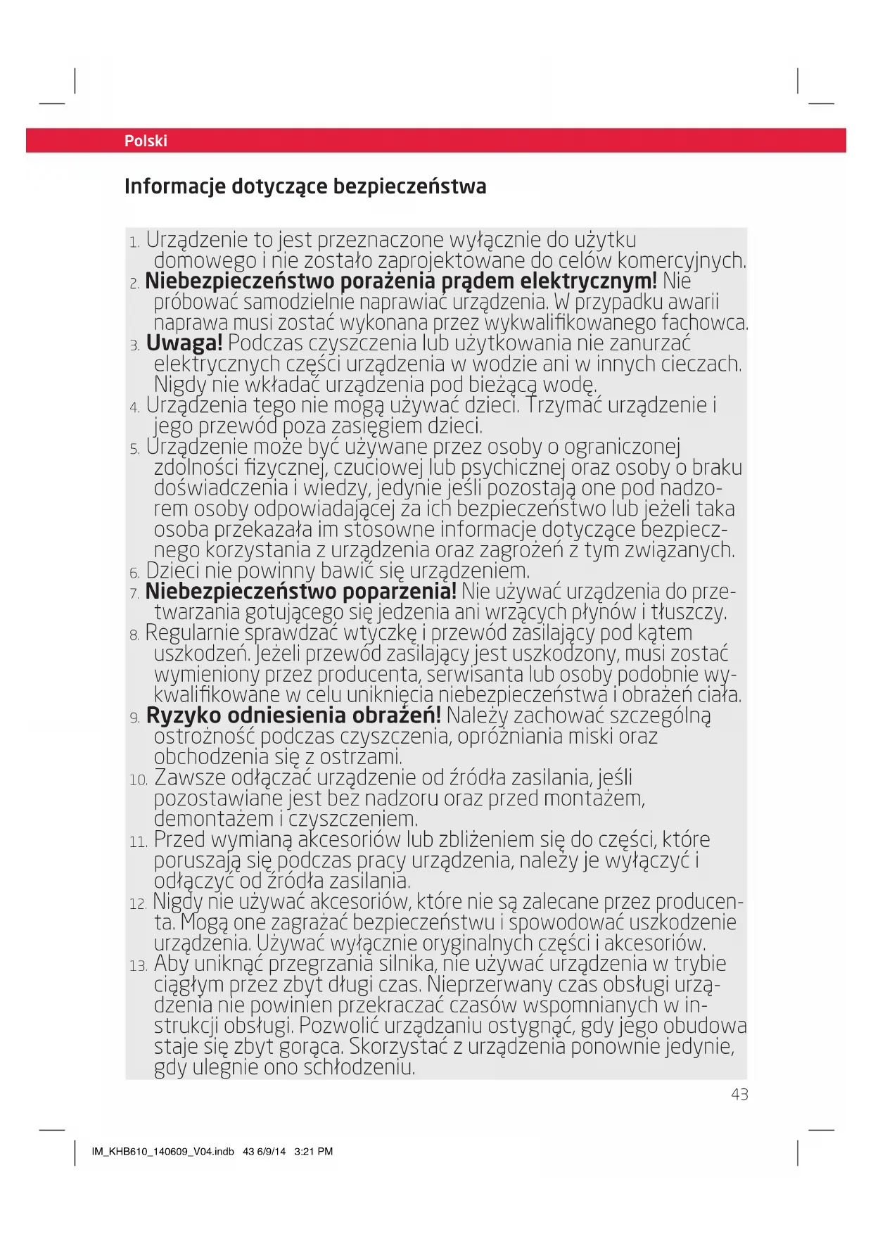 ciągłym przez zbyt długi czas. Nieprzerwany czas obsługi urzą- dzenia nie powinien przekraczać czasów wspomnianych w in- strukcji obsługi. Pozwolić urządzaniu ostygnąć, gdy jego obudowa staje się zbyt gorąca. Skorzystać z urządzenia ponownie jedynie, gdy ulegnie ono schłodzeniu. IM_KHB610_140609_V04.indb 43 6/9/14 3:21 PM44 Polski Polski Informacje dotyczące bezpieczeństwa