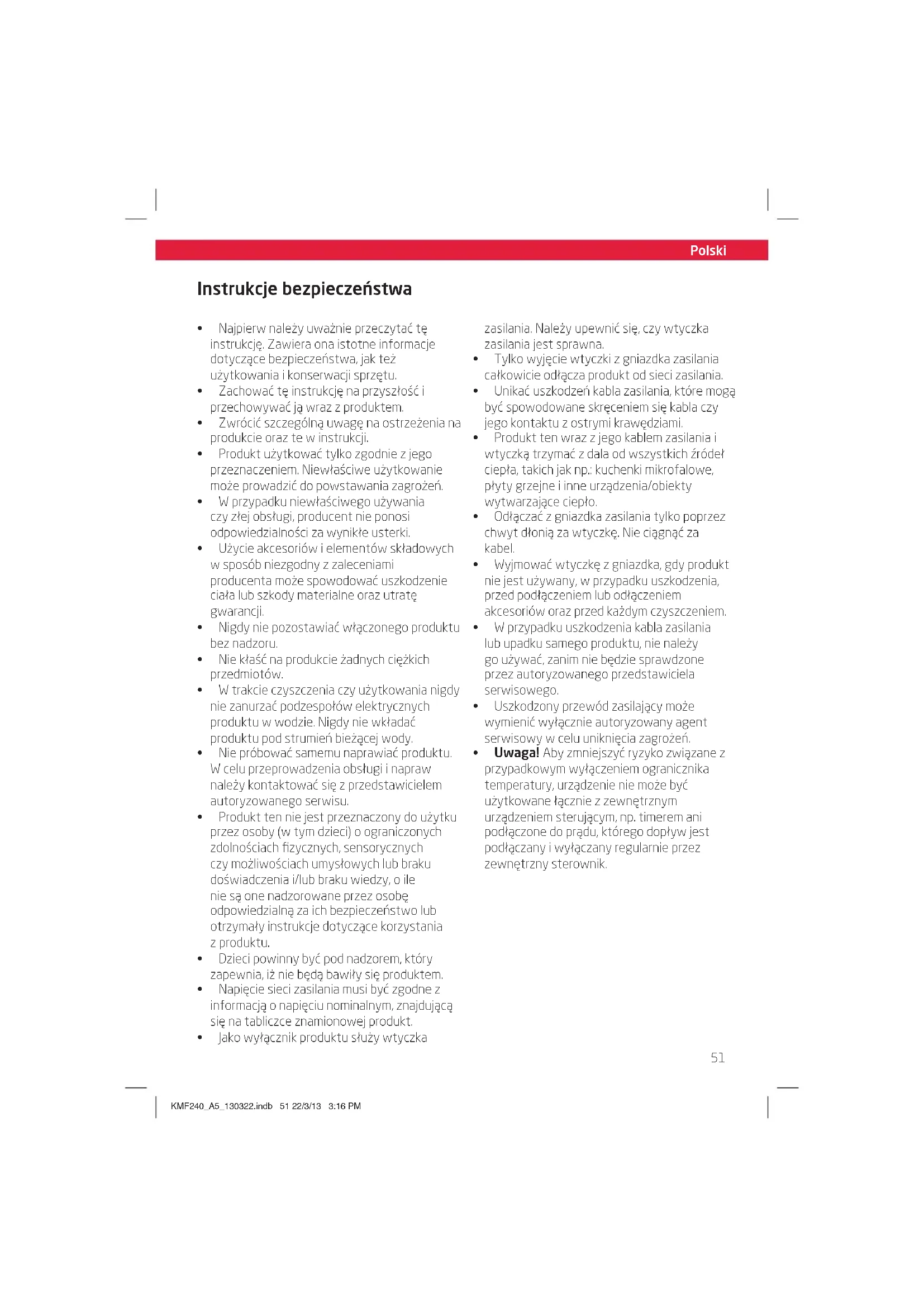 Œ Najpierw należy uważnie przeczytać tę instrukcję. Zawiera ona istotne informacje dotyczące bezpieczeństwa, jak też użytkowania i konserwacji sprzętu. Œ Zachować tę instrukcję na przyszłość i przechowywać ją wraz z produktem. Œ Zwrócić szczególną uwagę na ostrzeżenia na produkcie oraz te w instrukcji. Œ Produkt użytkować tylko zgodnie z jego przeznaczeniem. Niewłaściwe użytkowanie może prowadzić do powstawania zagrożeń. Œ W przypadku niewłaściwego używania czy złej obsługi, producent nie ponosi odpowiedzialności za wynikłe usterki. Œ Użycie akcesoriów i elementów składowych w sposób niezgodny z zaleceniami producenta może spowodować uszkodzenie ciała lub szkody materialne oraz utratę gwarancji. Œ Nigdy nie pozostawiać włączonego produktu bez nadzoru. Œ Nie kłaść na produkcie żadnych ciężkich przedmiotów. Œ W trakcie czyszczenia czy użytkowania nigdy nie zanurzać podzespołów elektrycznych produktu w wodzie. Nigdy nie wkładać produktu pod strumień bieżącej wody. Œ Nie próbować samemu naprawiać produktu. W celu przeprowadzenia obsługi i napraw należy kontaktować się z przedstawicielem autoryzowanego serwisu. Œ Produkt ten nie jest przeznaczony do użytku przez osoby (w tym dzieci) o ograniczonych zdolnościach fizycznych, sensorycznych czy możliwościach umysłowych lub braku doświadczenia i/lub braku wiedzy, o ile nie są one nadzorowane przez osobę odpowiedzialną za ich bezpieczeństwo lub otrzymały instrukcje dotyczące korzystania z produktu. Œ Dzieci powinny być pod nadzorem, który zapewnia, iż nie będą bawiły się produktem. Œ Napięcie sieci zasilania musi być zgodne z informacją o napięciu nominalnym, znajdującą się na tabliczce znamionowej produkt. Œ Jako wyłącznik produktu służy wtyczka zasilania. Należy upewnić się, czy wtyczka zasilania jest sprawna. Œ Tylko wyjęcie wtyczki z gniazdka zasilania całkowicie odłącza produkt od sieci zasilania. Œ Unikać uszkodzeń kabla zasilania, które mogą być spowodowane skręceniem się kabla czy jego kontaktu z ostrymi krawędziami. Œ Produkt ten wraz z jego kablem zasilania i wtyczką trzymać z dala od wszystkich źródeł ciepła, takich jak np.: kuchenki mikrofalowe, płyty grzejne i inne urządzenia/obiekty wytwarzające ciepło. Œ Odłączać z gniazdka zasilania tylko poprzez chwyt dłonią za wtyczkę. Nie ciągnąć za kabel. Œ Wyjmować wtyczkę z gniazdka, gdy produkt nie jest używany, w przypadku uszkodzenia, przed podłączeniem lub odłączeniem akcesoriów oraz przed każdym czyszczeniem. Œ W przypadku uszkodzenia kabla zasilania lub upadku samego produktu, nie należy go używać, zanim nie będzie sprawdzone przez autoryzowanego przedstawiciela serwisowego. Œ Uszkodzony przewód zasilający może wymienić wyłącznie autoryzowany agent serwisowy w celu uniknięcia zagrożeń. Œ Uwaga! Aby zmniejszyć ryzyko związane z przypadkowym wyłączeniem ogranicznika temperatury, urządzenie nie może być użytkowane łącznie z zewnętrznym urządzeniem sterującym, np. timerem ani podłączone do prądu, którego dopływ jest podłączany i wyłączany regularnie przez zewnętrzny sterownik. Instrukcje bezpieczeństwa KMF240_A5_130322.indb 51 22/3/13 3:16 PMPolski