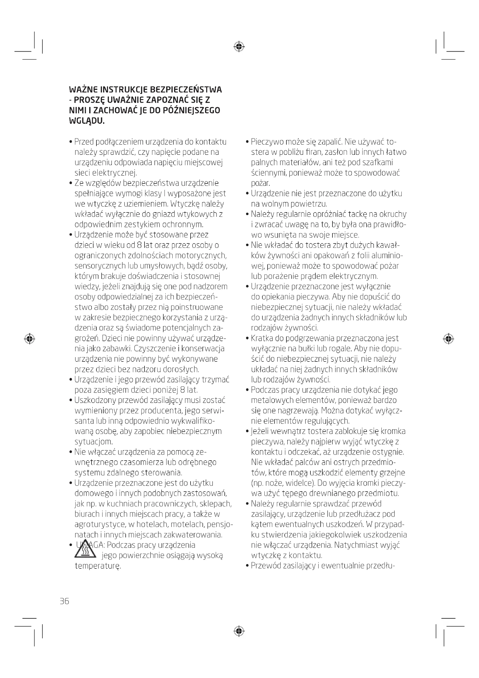 - Urządzenie przeznaczone jest wyłącznie do opiekania pieczywa. Aby nie dopuścić do niebezpiecznej sytuacji, nie należy wkładać do urządzenia żadnych innych składników lub rodzajów żywności.