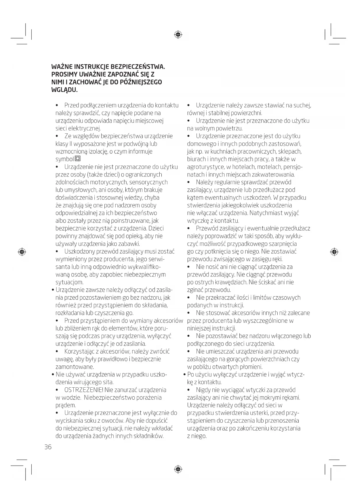 - Urządzenie przeznaczone jest wyłącznie do wyciskania soku z owoców. Aby nie dopuścić do niebezpiecznej sytuacji, nie należy wkładać do urządzenia żadnych innych składników.