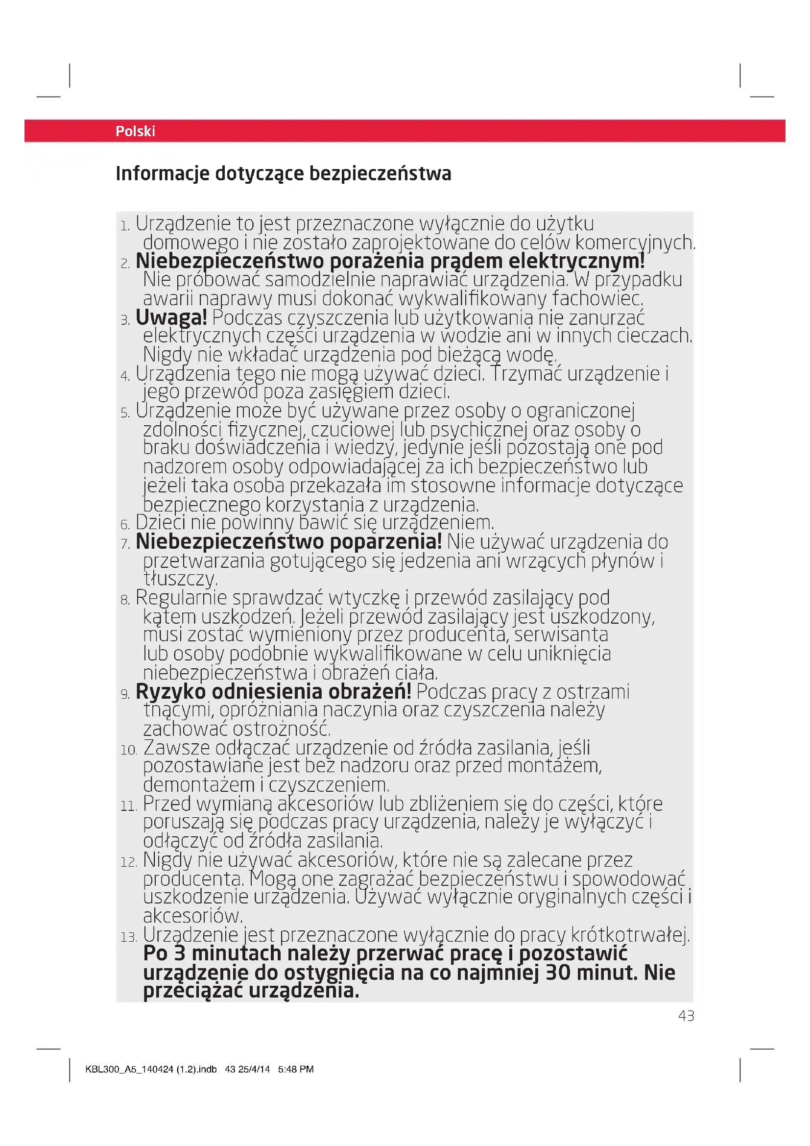 Czas pracy: Po 3 minutach nalezy przerwać prace i pozostawic urzadzenia do ostygnięcía na co najmiej 30 minut. Nie przyȩzać urzadzenia.