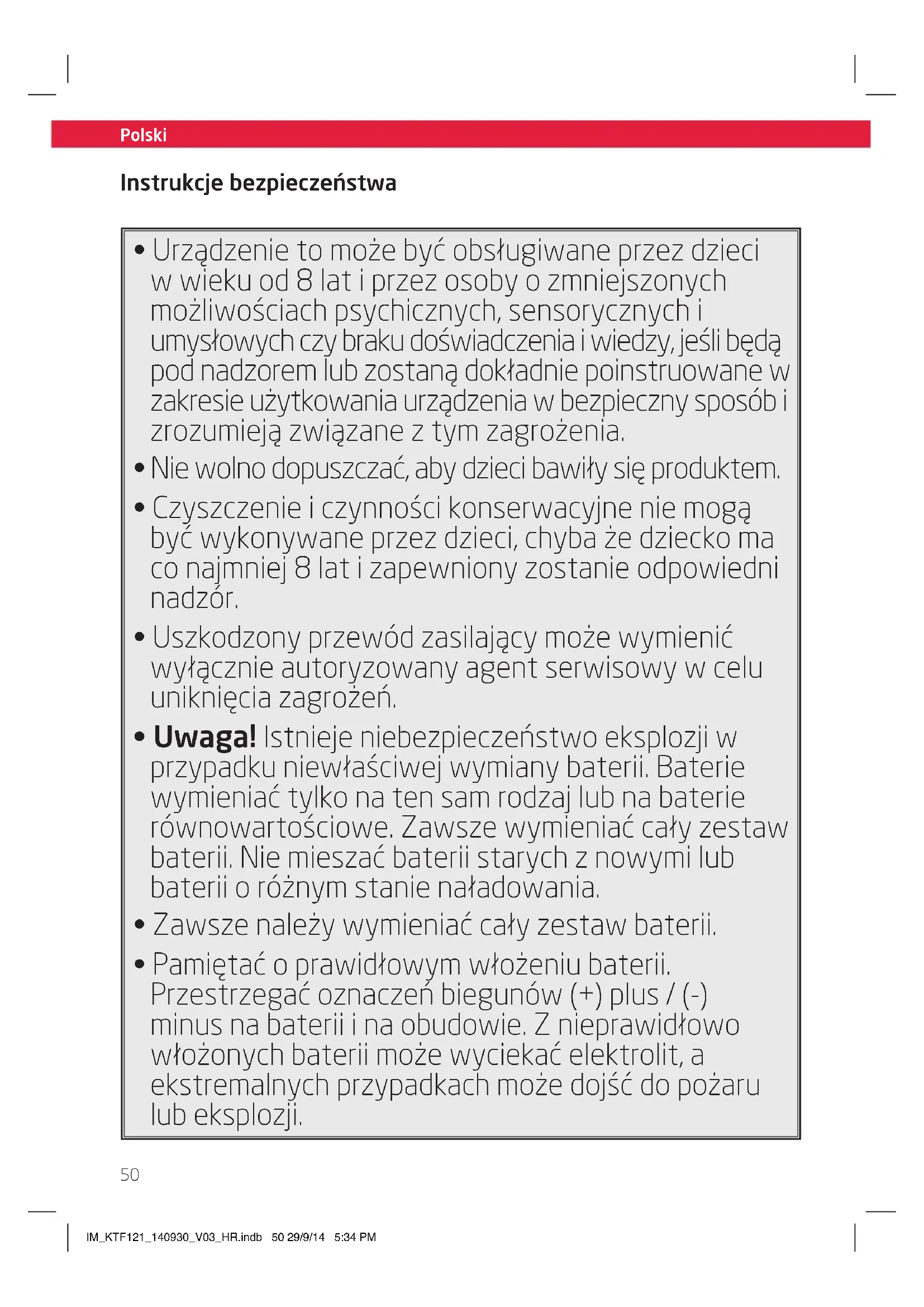 - Pamiętać o prawidłowym włożeniu baterii. Przestrzegać oznaczeń biegunów (+) plus / (-) minus na baterii i na obudowie. Z nieprawidłowo włożonych baterii może wyciekać elektrolit, a ekstremalnych przypadkach może dojść do pożaru lub eksplozji. IM_KTF121_140930_V03_HR.indb 50 29/9/14 5:34 PMPolski