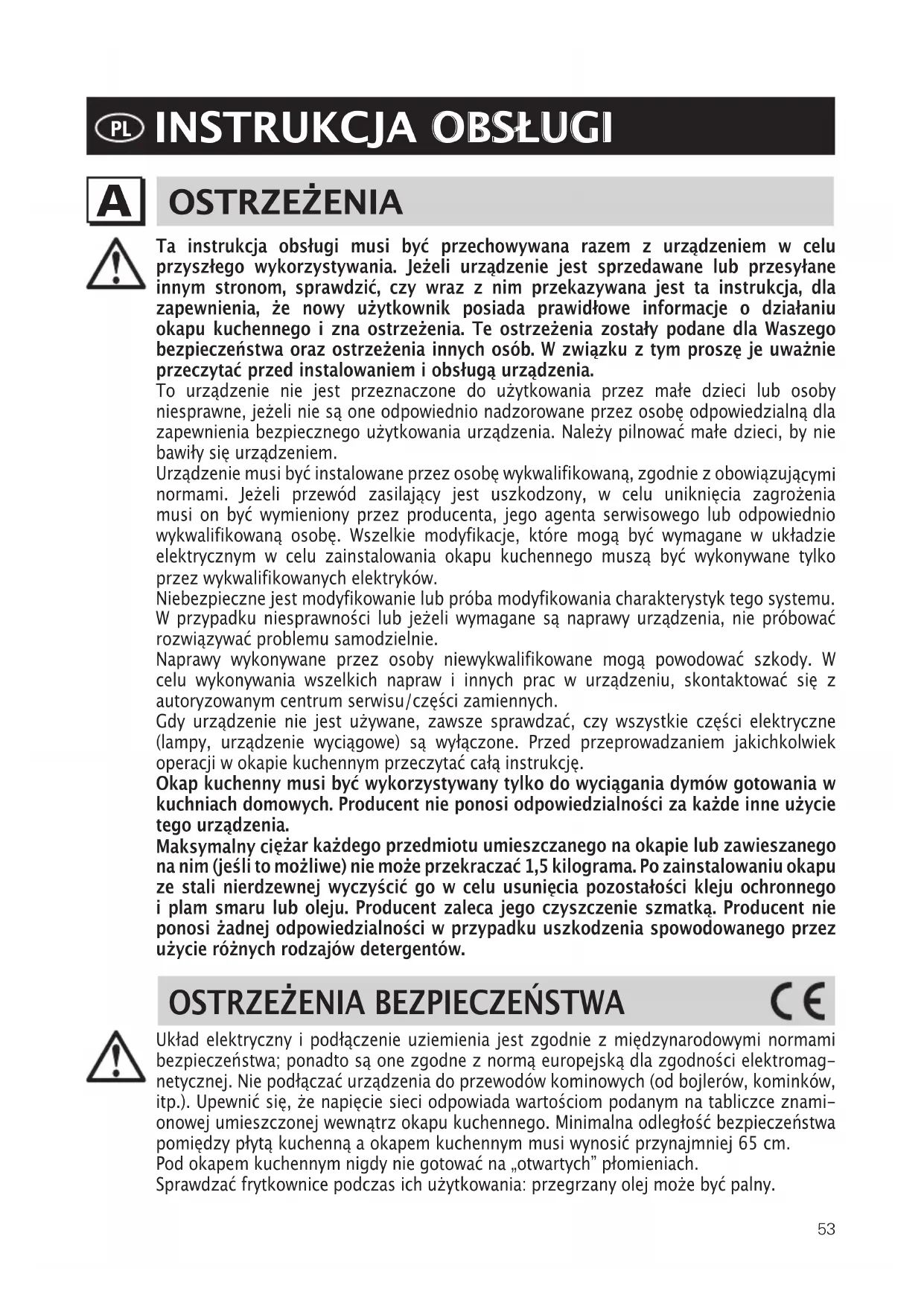 Ta instrukcja obsługi musi być przechowywana razem z urządzeniem w celu przyszłego wykorzystywania. Jeżeli urządzenie jest sprzedawane lub przesyłane innym stronom, sprawdzić, czy wraz z nim przekazywana jest ta instrukcja, dla zapewnienia, że nowy użytkownik posiada prawidłowe informacje o działaniu okapu kuchennego i zna ostrzeżenia. Te ostrzeżenia zostały podane dla Waszego bezpieczeństwa oraz ostrzeżenia innych osób. W związku z tym proszę je uważnie przeczytać przed instalowaniem i obsługą urządzenia. To urządzenie nie jest przeznaczone do użytkowania przez małe dzieci lub osoby niesprawne, jeżeli nie są one odpowiednio nadzorowane przez osobę odpowiedzialną dla zapewnienia bezpiecznego użytkowania urządzenia. Należy pilnować małe dzieci, by nie bawiły się urządzeniem. Urządzenie musi być instalowane przez osobę wykwalifikowaną, zgodnie z obowiązują cymi normami. Jeżeli przewód zasilający jest uszkodzony, w celu uniknięcia zagrożenia musi on być wymieniony przez producenta, jego agenta serwisowego lub odpowiednio wykwalifikowaną osobę. Wszelkie modyfikacje, które mogą być wymagane w układzie elektrycznym w celu zainstalowania okapu kuchennego muszą być wykonywane tylko przez wykwalifikowanych elektryków. Niebezpieczne jest modyfikowanie lub próba modyfikowania charakterystyk tego systemu. W przypadku niesprawności lub jeżeli wymagane są naprawy urządzenia, nie próbować rozwiązywać problemu samodzielnie. Naprawy wykonywane przez osoby niewykwalifikowane mogą powodować szkody. W celu wykonywania wszelkich napraw i innych prac w urządzeniu, skontaktować się z autoryzowanym centrum serwisu/części zamiennych. Gdy urządzenie nie jest używane, zawsze sprawdzać, czy wszystkie części elektryczne (lampy, urządzenie wyciągowe) są wyłączone. Przed przeprowadzaniem jakichkolwiek operacji w okapie kuchennym przeczytać całą instrukcję. Okap kuchenny musi być wykorzystywany tylko do wyciągania dymów gotowania w kuchniach domowych. Producent nie ponosi odpowiedzialności za każde inne użycie tego urządzenia. Maksymalny ci ężar każdego przedmiotu umieszczanego na okapie lub zawieszanego na nim (jeśli to możliwe) nie może przekraczać 1,5 kilograma. Po zainstalowaniu okapu ze stali nierdzewnej wyczyścić go w celu usunięcia pozostałości kleju ochronnego i plam smaru lub oleju. Producent zaleca jego czyszczenie szmatką. Producent nie ponosi żadnej odpowiedzialności w przypadku uszkodzenia spowodowanego przez użycie różnych rodzajów detergentów.