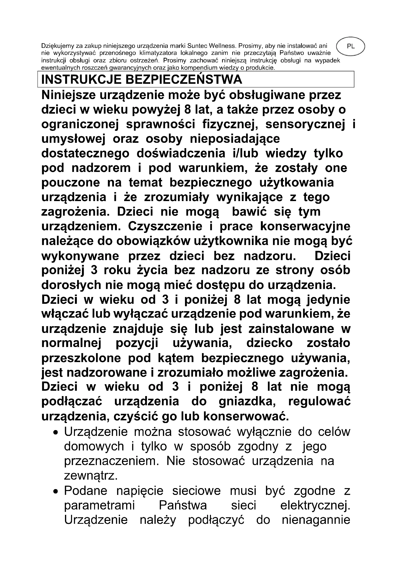 IMPULS Eco R290 SUNTEC WELLNESS GMBH / HOLZSTRASSE 2 / 40 221 DÜSSELDORF / GERMANYDziękujemy za zakup niniejszego urządzenia marki Suntec Wellness. Prosimy, aby nie instalować ani nie wykorzystywać przenośnego klimatyzatora lokalnego zanim nie przeczytają Państwo uważnie instrukcji obsługi oraz zbioru ostrzeżeń. Prosimy zachować niniejszą instrukcję obsługi na wypadek ewentualnych roszczeń gwarancyjnych oraz jako kompendium wiedzy o produkcie.
