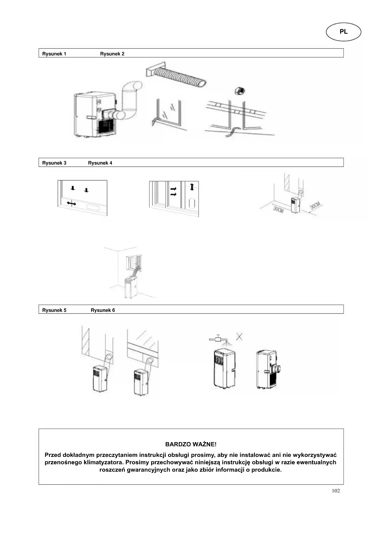 BARDZO WAŻNE! Przed dokładnym przeczytaniem instrukcji obsługi prosimy, aby nie instalować ani nie wykorzystywać przenośnego klimatyzatora. Prosimy przechowywać niniejszą instrukcję obsługi w razie ewentualnych roszczeń gwarancyjnych oraz jako zbiór informacji o produkcie. PL103 Uwaga! To urządzenie może być używane przez dzieci w wieku od 8 lat i powyżej oraz osób o ograniczonej sprawności fizycznej, sensorycznej i psychicznych lub braku doświadczenia i wiedzy, jeśli zostały one nadzorowane lub zostaną poinstruowane na temat korzystania z urządzenia w sposób bezpieczny i zrozumieć zagrożenia zaangażować. Czyszczenie i konserwacja użytkownik nie musi być wykonane przez dzieci bez nadzoru. Urządzenie jest przeznaczone tylko do użytku w pomieszczeniach. Urządzenia nie wolno podłączać do uszkodzonego gniazda elektrycznego. Przed uruchomieniem należy upewnić się, że urządzenie jest prawidłowo zainstalowane. Urządzenia nie należy używać w pobliżu otwartych źródeł ognia. Urządzenia nie należy używać w otoczeniu, w którym może dochodzić do rozpryskiwania oleju lub wody. Nie należy wystawiać urządzenia na bezpośrednie działanie promieni słonecznych. Nie należy użytkować urządzenia w pobliżu łazienki, natrysku, basenu kąpielowego lub w salonie kąpielowym. Nigdy nie wkładaj palców, ołówków lub innych przedmiotów, choć strażnik, gdy jest podłączony wtyk zasilania, szczególnie podczas jazdy. Klimatyzator należy zawsze przechowywać i transportować w pozycji pionowej. W razie wątpliwości zalecamy, aby odczekać przynajmniej 24 godziny z ponownym włączeniem klimatyzatora. Znaleźć miejsce do ustawienia w bezpośrednim sąsiedztwie gniazdka wtykowego Przed czyszczeniem urządzenia lub filtra należy upewnić się, że urządzenie jest wyłączone i odłączone od sieci elektrycznej.104 Przed transportem należy opróżnić urządzenie ze znajdującej się w nim wody. Prosimy zapewnić, aby otwór wlotowy i wylotowy wentylacji nie został zablokowany. Urządzenie należy zainstalować zgodnie z krajowymi przepisami obowiązującymi w przypadku urządzeń elektrycznych. Urządzenie należy użytkować zawsze na poziomej powierzchni. Zachować odstęp 30 cm wokół urządzenia zgodnie z rysunkiem przedstawionym obok. Nigdy nie należy używać wtyczki z gniazdka jako przełącznik, aby uruchomić i wyłączyć urządzenie klimatyzatora. Użyj dostarczonego POWER przełącznik znajdujący się na panelu sterowania. Upewnij się, że przewód zasilania jest prawidłowo uziemione. Jeśli przewód zasilający jest uszkodzony, musi zostać wymieniony przez sprzedawcę lub jego przedstawiciela serwisowego lub osobę o podobnych kwalifikacjach w celu uniknięcia zagrożenia. Oznaczenie części zamiennych / komponentów