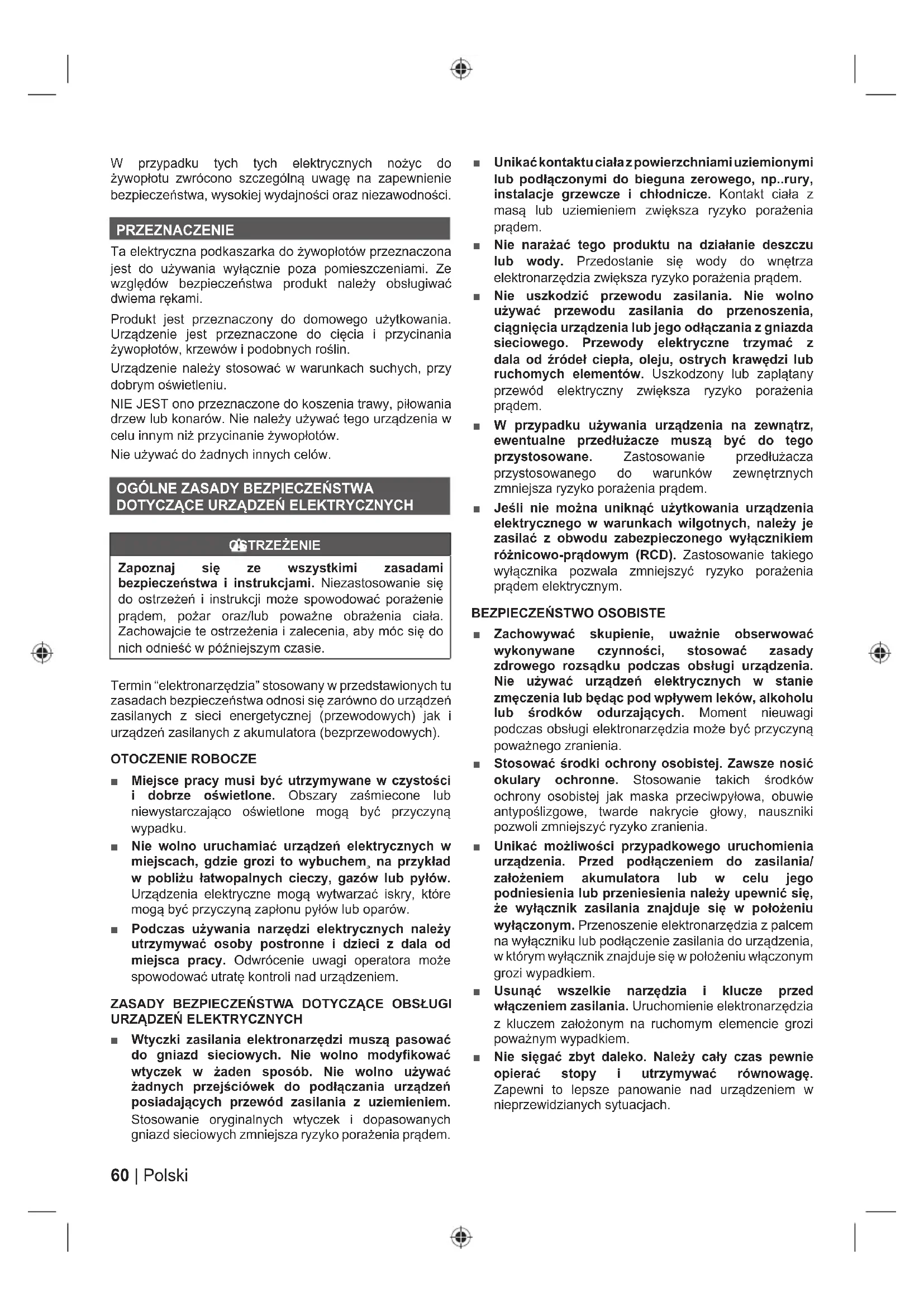 OBSŁUGI NOŻYC DO ŻYWOPŁOTU ■ Wszystkie kończyny należy trzymać z dala od ostrza. Nie usuwać nagromadzonej ścinki ani nie trzymać gałęzi do przecięcia w rękach gdy ostrza pracują. Przed przystąpieniem do usuwania nagromadzonego materiału upewnić się, że urządzenie jest wyłączone. Chwila nieuwagi podczas obsługi urządzenia może spowodować poważne urazy ciała. ■ Przycinarkę należy przenosić trzymając za rękojeść, ostrza nie mogą pracować. Do transportu lub przechowywania zakładać osłonę na element tnący. Odpowiednie obchodzenie się z przycinarką pozwoli zmniejszyć ryzyko zranienia przez jej ostrza. ■ Elektronarzędzie należy trzymać wyłącznie za przewidziane do tego celu izolowane uchwyty, ponieważ istnieje ryzyko przypadkowego zetknięcia się ostrza z niewidocznym przewodem elektrycznym lub własnym przewodem. Kontakt ostrza z przewodem pod napięciem może spowodować przepływ prądu przez metalowe elementy urządzenia i porażenie operatora. ■ Przewód zasilania trzymać z dala od obszaru cięcia. Podczas pracy kabel może być ukryty w krzakach i można go przypadkowo przeciąć ostrzem.