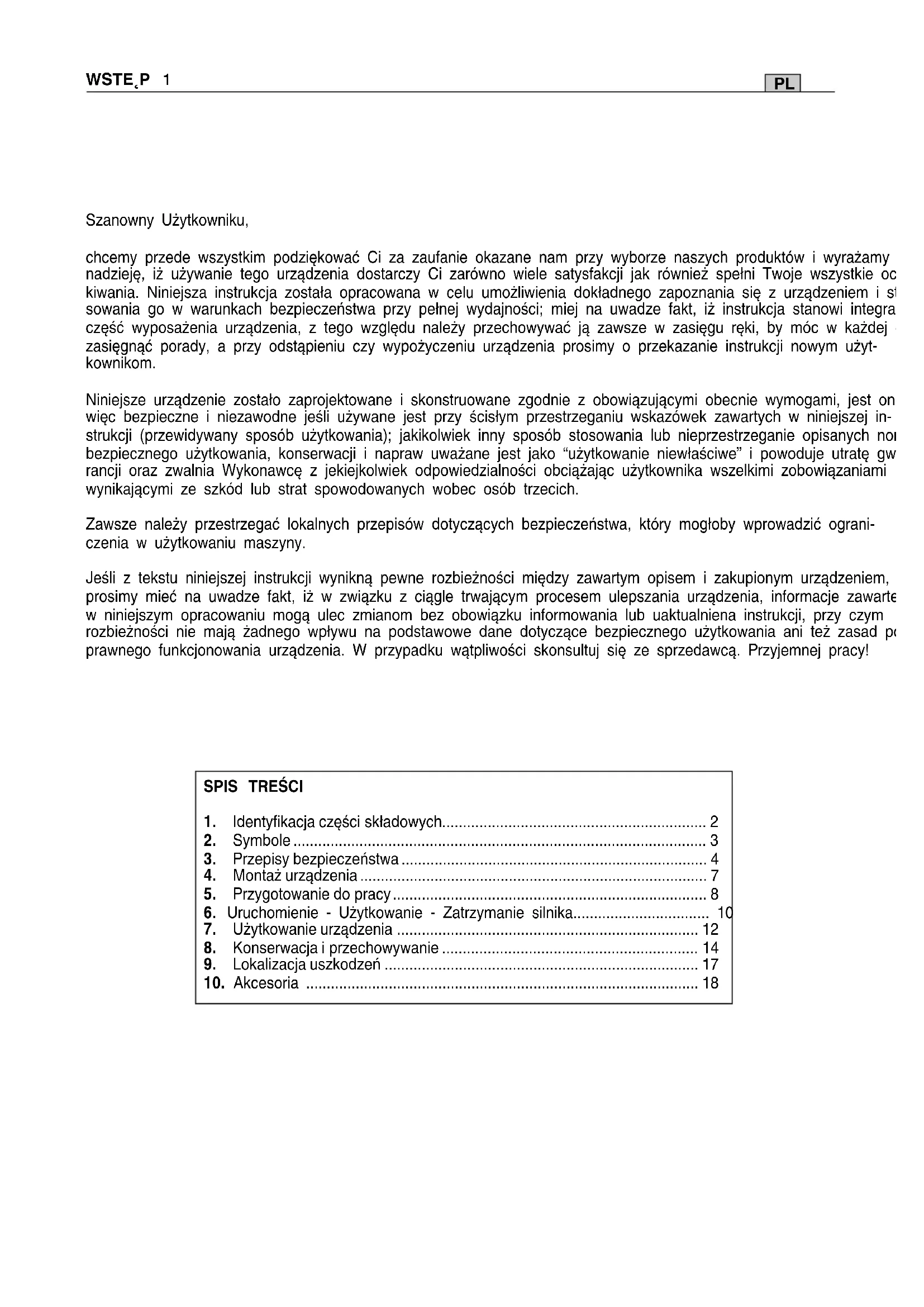 WSTE˛P 1 Szanowny Użytkowniku, chcemy przede wszystkim podziękować Ci za zaufanie okazane nam przy wyborze naszych produktów i wyrażamy nadzieję, iż używanie tego urządzenia dostarczy Ci zarówno wiele satysfakcji jak również spełni Twoje wszystkie ocze- kiwania. Niniejsza instrukcja została opracowana w celu umożliwienia dokładnego zapoznania się z urządzeniem i sto- sowania go w warunkach bezpieczeństwa przy pełnej wydajności; miej na uwadze fakt, iż instrukcja stanowi integralną część wyposażenia urządzenia, z tego względu należy przechowywać ją zawsze w zasięgu ręki, by móc w każdej chwili zasięgnąć porady, a przy odstąpieniu czy wypożyczeniu urządzenia prosimy o przekazanie instrukcji nowym użyt- kownikom. Niniejsze urządzenie zostało zaprojektowane i skonstruowane zgodnie z obowiązującymi obecnie wymogami, jest ono więc bezpieczne i niezawodne jeśli używane jest przy ścisłym przestrzeganiu wskazówek zawartych w niniejszej in- strukcji (przewidywany sposób użytkowania); jakikolwiek inny sposób stosowania lub nieprzestrzeganie opisanych norm bezpiecznego użytkowania, konserwacji i napraw uważane jest jako “użytkowanie niewłaściwe” i powoduje utratę gwa- rancji oraz zwalnia Wykonawcę z jekiejkolwiek odpowiedzialności obciążając użytkownika wszelkimi zobowiązaniami wynikającymi ze szkód lub strat spowodowanych wobec osób trzecich. Zawsze należy przestrzegać lokalnych przepisów dotyczących bezpieczeństwa, który mogłoby wprowadzić ograni- czenia w użytkowaniu maszyny. Jeśli z tekstu niniejszej instrukcji wynikną pewne rozbieżności między zawartym opisem i zakupionym urządzeniem, prosimy mieć na uwadze fakt, iż w związku z ciągle trwającym procesem ulepszania urządzenia, informacje zawarte w niniejszym opracowaniu mogą ulec zmianom bez obowiązku informowania lub uaktualniena instrukcji, przy czym rozbieżności nie mają żadnego wpływu na podstawowe dane dotyczące bezpiecznego użytkowania ani też zasad po- prawnego funkcjonowania urządzenia. W przypadku wątpliwości skonsultuj się ze sprzedawcą. Przyjemnej pracy!