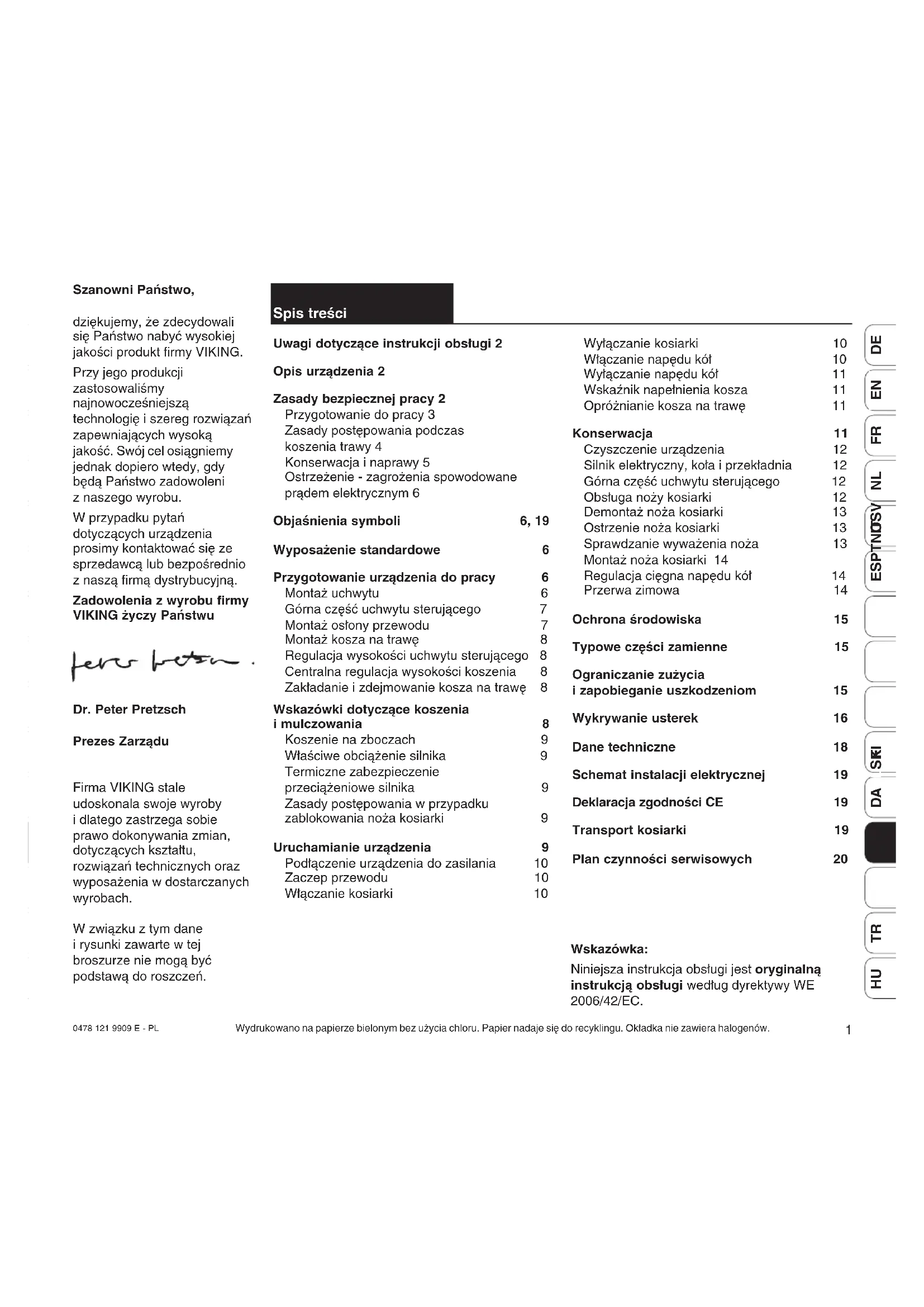 Szanowni Państwo, dziękujemy, że zdecydowali się Państwo nabyć wysokiej jakości produkt firmy VIKING. Przy jego produkcji zastosowaliśmy najnowocześniejszą technologię i szereg rozwiązań zapewniających wysoką jakość. Swój cel osiągniemy jednak dopiero wtedy, gdy będą Państwo zadowoleni z naszego wyrobu. W przypadku pytań dotyczących urządzenia prosimy kontaktować się ze sprzedawcą lub bezpośrednio z naszą firmą dystrybucyjną. Zadowolenia z wyrobu firmy VIKING życzy Państwu Dr. Peter Pretzsch Prezes Zarządu Firma VIKING stale udoskonala swoje wyroby i dlatego zastrzega sobie prawo dokonywania zmian, dotyczących kształtu, rozwiązań technicznych oraz wyposażenia w dostarczanych wyrobach. W związku z tym dane i rysunki zawarte w tej broszurze nie mogą być podstawą do roszczeń. Spis treści Uwagi dotyczące instrukcji obsługi 2 Opis urządzenia 2 Zasady bezpiecznej pracy 2 Przygotowanie do pracy 3 Zasady postępowania podczas koszenia trawy 4 Konserwacja i naprawy 5 Ostrzeżenie - zagrożenia spowodowane prądem elektrycznym 6 Objaśnienia symboli 6, 19 Wyposażenie standardowe 6 Przygotowanie urządzenia do pracy 6 Montaż uchwytu 6 Górna część uchwytu sterującego 7 Montaż osłony przewodu 7 Montaż kosza na trawę 8 Regulacja wysokości uchwytu sterującego 8 Centralna regulacja wysokości koszenia 8 Zakładanie i zdejmowanie kosza na trawę 8 Wskazówki dotyczące koszenia i mulczowania 8 Koszenie na zboczach 9 Właściwe obciążenie silnika 9 Termiczne zabezpieczenie przeciążeniowe silnika 9 Zasady postępowania w przypadku zablokowania noża kosiarki 9 Uruchamianie urządzenia 9 Podłączenie urządzenia do zasilania 10 Zaczep przewodu 10 Włączanie kosiarki 10 Wyłączanie kosiarki 10 Włączanie napędu kół 10 Wyłączanie napędu kół 11 Wskaźnik napełnienia kosza 11 Opróżnianie kosza na trawę 11 Konserwacja 11 Czyszczenie urządzenia 12 Silnik elektryczny, koła i przekładnia 12 Górna część uchwytu sterującego 12 Obsługa noży kosiarki 12 Demontaż noża kosiarki 13 Ostrzenie noża kosiarki 13 Sprawdzanie wyważenia noża 13 Montaż noża kosiarki 14 Regulacja cięgna napędu kół 14 Przerwa zimowa 14 Ochrona środowiska 15 Typowe części zamienne 15 Ograniczanie zużycia i zapobieganie uszkodzeniom 15 Wykrywanie usterek 16 Dane techniczne 18 Schemat instalacji elektrycznej 19 Deklaracja zgodności CE 19 Transport kosiarki 19 Plan czynności serwisowych 20 Wskazówka: Niniejsza instrukcja obsługi jest oryginalną instrukcją obsługi według dyrektywy WE 2006/42/EC. Wydrukowano na papierze bielonym bez użycia chloru. Papier nadaje się do recyklingu. Okładka nie zawiera halogenów. 0478_121_9909_e:0478_121_9909_e 05.12.2012 15:13 Seite 12 0478 121 9909 E - PL Symbol ten ułatwia połączenie rysunków do określonych części tekstu w instrukcji obsługi. Symbole graficzne Uwagi dotyczące instrukcji obsługi