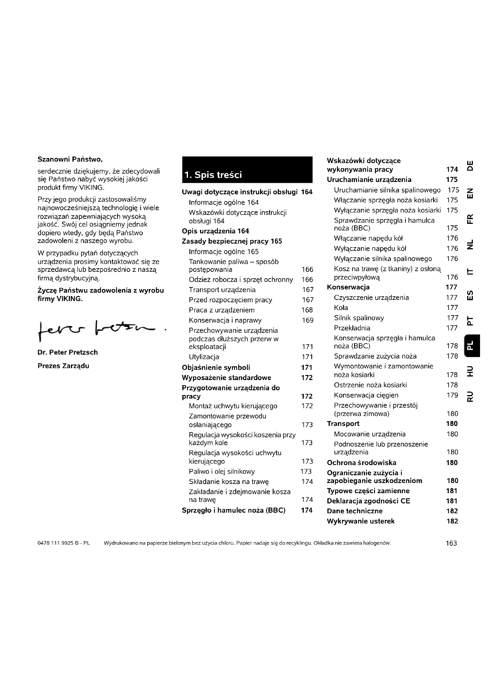 Uwagi dotyczące instrukcji obsługi 164 Informacje ogólne 164 Wskazówki dotyczące instrukcji obsługi 164 Opis urządzenia 164 Zasady bezpiecznej pracy 165 Informacje ogólne 165 Tankowanie paliwa – sposób postępowania 166 Odzież robocza i sprzęt ochronny 166 Transport urządzenia 167 Przed rozpoczęciem pracy 167 Praca z urządzeniem 168 Konserwacja i naprawy 169 Przechowywanie urządzenia podczas dłuższych przerw w eksploatacji 171 Utylizacja 171 Objaśnienie symboli 171 Wyposażenie standardowe 172 Przygotowanie urządzenia do pracy 172 Montaż uchwytu kierującego 172 Zamontowanie przewodu osłaniającego 173 Regulacja wysokości koszenia przy każdym kole 173 Regulacja wysokości uchwytu kierującego 173 Paliwo i olej silnikowy 173 Składanie kosza na trawę 174 Zakładanie i zdejmowanie kosza na trawę 174 Sprzęgło i hamulec noża (BBC) 174 Wskazówki dotyczące wykonywania pracy 174 Uruchamianie urządzenia 175 Uruchamianie silnika spalinowego 175 Włączanie sprzęgła noża kosiarki 175 Wyłączanie sprzęgła noża kosiarki 175 Sprawdzanie sprzęgła i hamulca noża (BBC) 175 Włączanie napędu kół 176 Wyłączanie napędu kół 176 Wyłączanie silnika spalinowego 176 Kosz na trawę (z tkaniny) z osłoną przeciwpyłową 176 Konserwacja 177 Czyszczenie urządzenia 177 Koła177 Silnik spalinowy 177 Przekładnia 177 Konserwacja sprzęgła i hamulca noża (BBC) 178 Sprawdzanie zużycia noża178 Wymontowanie i zamontowanie noża kosiarki 178 Ostrzenie noża kosiarki 178 Konserwacja cięgien 179 Przechowywanie i przestój (przerwa zimowa) 180 Transport 180 Mocowanie urządzenia 180 Podnoszenie lub przenoszenie urządzenia 180 Ochrona środowiska 180 Ograniczanie zużycia i zapobieganie uszkodzeniom 180 Typowe części zamienne 181 Deklaracja zgodności CE 181 Dane techniczne 182 Wykrywanie usterek 1820478 111 9925 B - PL