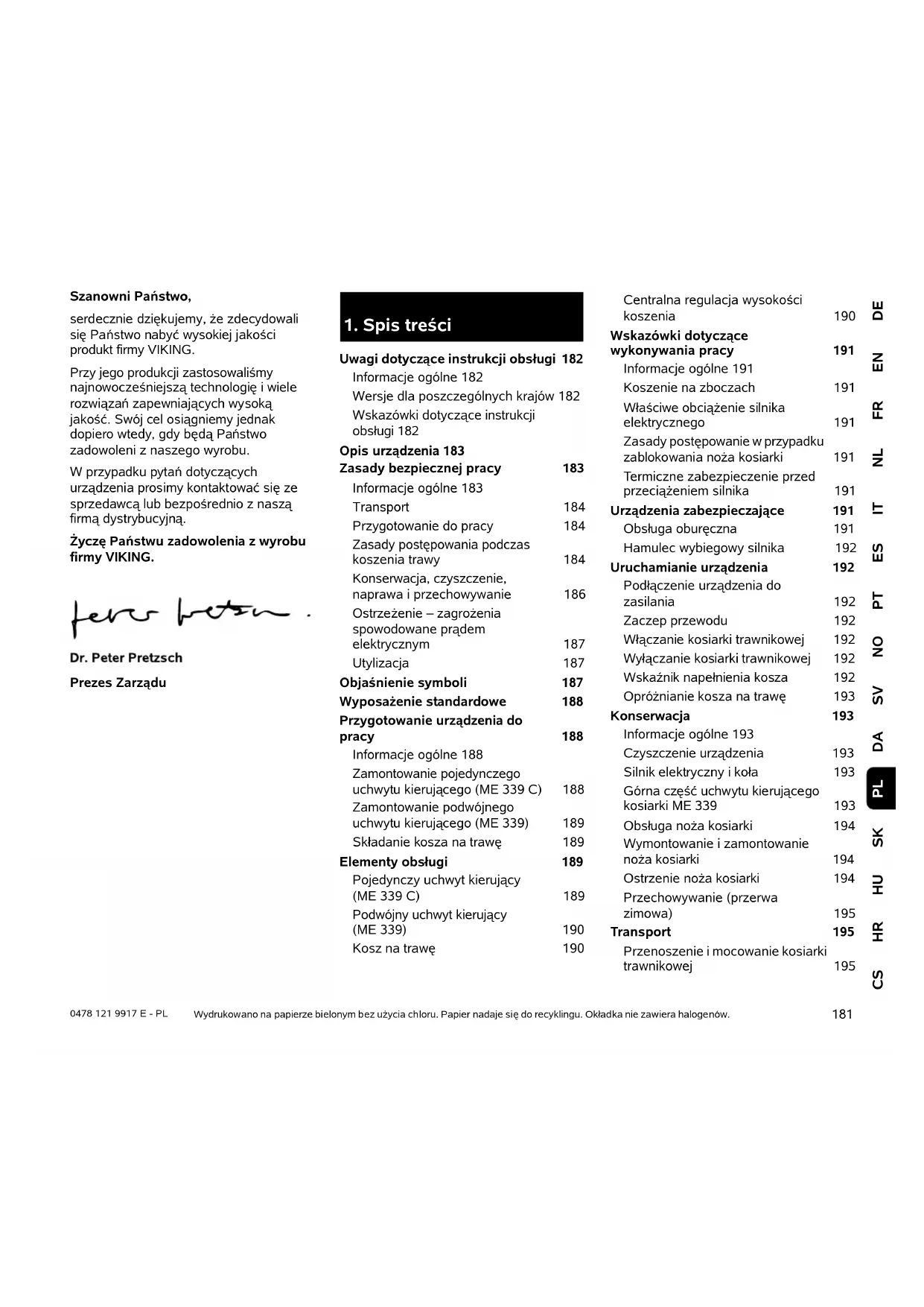 DEENFRNLITESPTNOSVDASKHUHRCS PL 0478 121 9917 E - PL Szanowni Państwo, serdecznie dziękujemy, że zdecydowali się Państwo nabyć wysokiej jakości produkt firmy VIKING. Przy jego produkcji zastosowaliśmy najnowocześniejszą technologię i wiele rozwiązań zapewniających wysoką jakość. Swój cel osiągniemy jednak dopiero wtedy, gdy będą Państwo zadowoleni z naszego wyrobu. W przypadku pytań dotyczących urządzenia prosimy kontaktować się ze sprzedawcą lub bezpośrednio z naszą firmą dystrybucyjną. Życzę Państwu zadowolenia z wyrobu firmy VIKING. Prezes Zarządu Wydrukowano na papierze bielonym bez użycia chloru. Papier nadaje się do recyklingu. Okładka nie zawiera halogenów.