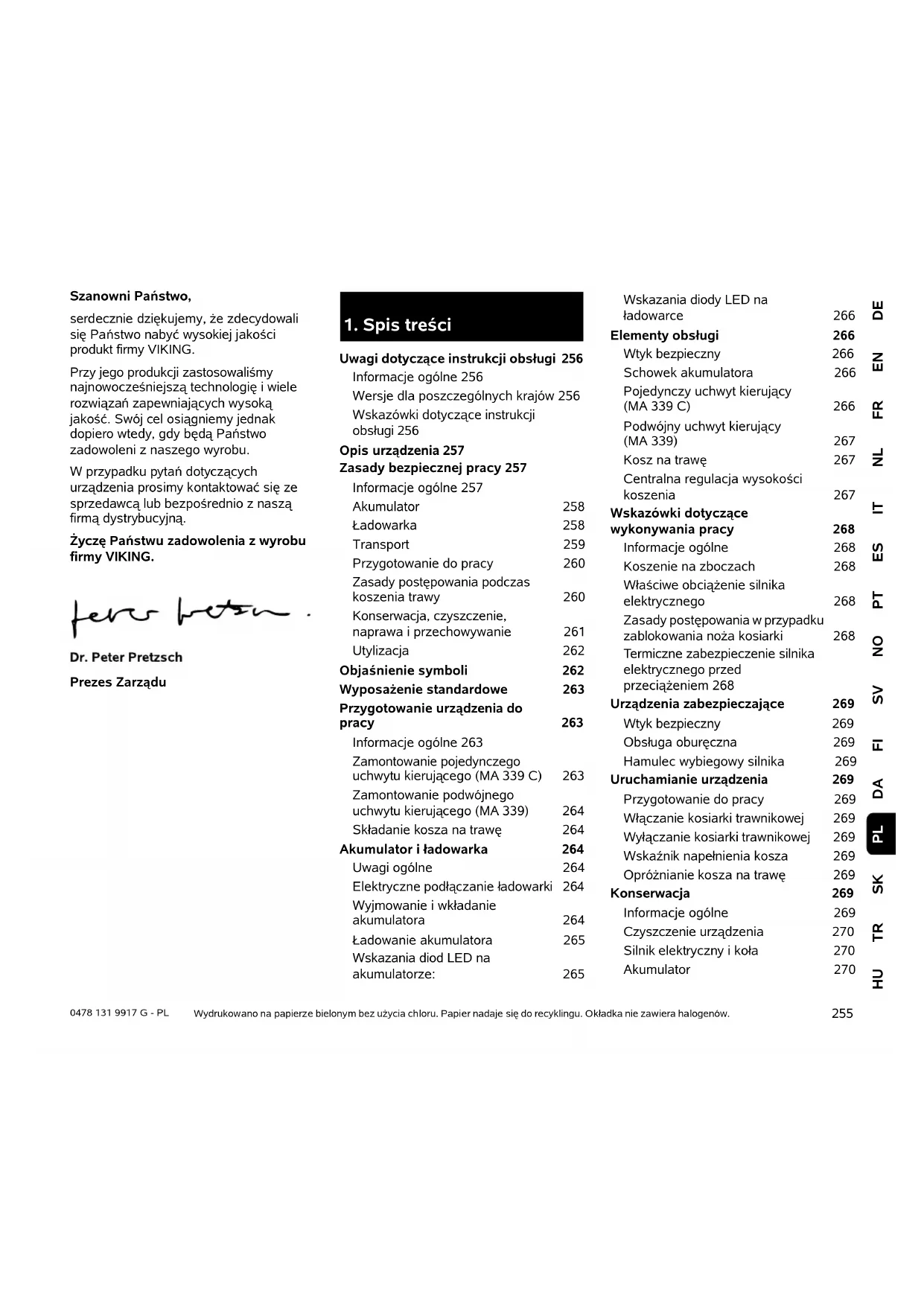 Uwagi dotyczące instrukcji obsługi 256 Informacje ogólne 256 Wersje dla poszczególnych krajów 256 Wskazówki dotyczące instrukcji obsługi 256 Opis urządzenia 257 Zasady bezpiecznej pracy 257 Informacje ogólne 257 Akumulator 258 Ładowarka 258 Transport 259 Przygotowanie do pracy 260 Zasady postępowania podczas koszenia trawy 260 Konserwacja, czyszczenie, naprawa i przechowywanie 261 Utylizacja 262 Objaśnienie symboli 262 Wyposażenie standardowe 263 Przygotowanie urządzenia do pracy 263 Informacje ogólne 263 Zamontowanie pojedynczego uchwytu kierującego (MA 339 C) 263 Zamontowanie podwójnego uchwytu kierującego (MA 339) 264 Składanie kosza na trawę 264 Akumulator i ładowarka 264 Uwagi ogólne 264 Elektryczne podłączanie ładowarki 264 Wyjmowanie i wkładanie akumulatora 264 Ładowanie akumulatora 265 Wskazania diod LED na akumulatorze: 265 Wskazania diody LED na ładowarce 266 Elementy obsługi 266 Wtyk bezpieczny 266 Schowek akumulatora 266 Pojedynczy uchwyt kierujący (MA 339 C) 266 Podwójny uchwyt kierujący (MA 339) 267 Kosz na trawę 267 Centralna regulacja wysokości koszenia 267 Wskazówki dotyczące wykonywania pracy 268 Informacje ogólne 268 Koszenie na zboczach 268 Właściwe obciążenie silnika elektrycznego 268 Zasady postępowania w przypadku zablokowania noża kosiarki 268 Termiczne zabezpieczenie silnika elektrycznego przed przeciążeniem 268 Urządzenia zabezpieczające 269 Wtyk bezpieczny 269 Obsługa oburęczna 269 Hamulec wybiegowy silnika 269 Uruchamianie urządzenia 269 Przygotowanie do pracy 269 Włączanie kosiarki trawnikowej 269 Wyłączanie kosiarki trawnikowej 269 Wskaźnik napełnienia kosza 269 Opróżnianie kosza na trawę 269 Konserwacja 269 Informacje ogólne 269 Czyszczenie urządzenia 270 Silnik elektryczny i koła270 Akumulator 2700478 131 9917 G - PL