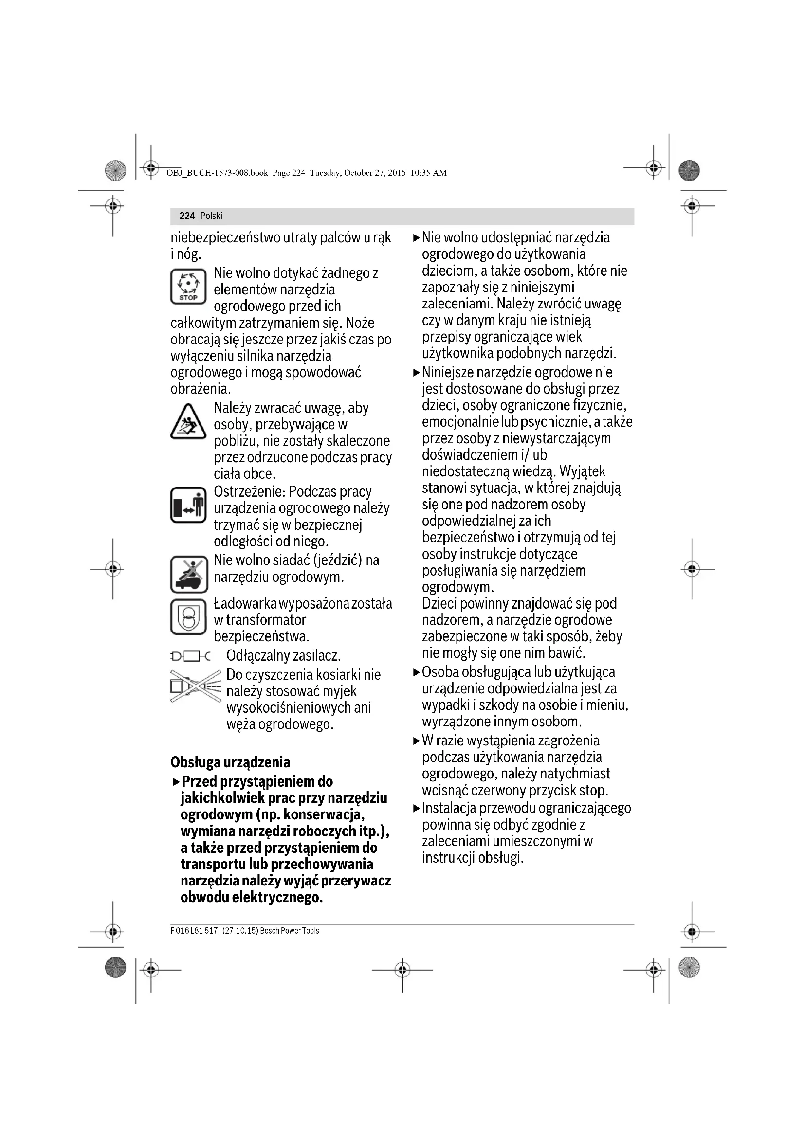 Denizli Tel.: 0258 2620666 Bulut Elektrik İstasyon Cad. No: 52/B Devlet Tiyatrosu Karşısı Elazığ Tel.: 0424 2183559 Körfez Elektrik Sanayi Çarşısı 770 Sok. No: 71 Erzincan Tel.: 0446 2230959 Ege Elektrik İnönü Bulvaro No: 135 Muğla Makasarası Fethiye Fethiye Tel.: 0252 6145701 Değer İş Bobinaj İsmetpaşa Mah. İlk Belediye Başkan Cad. 5/C Şahinbey Gaziantep Tel.: 0342 2316432 Çözüm Bobinaj İsmetpaşa Mah. Eski Şahinbey Belediyesi altı Cad. No: 3/C Gaziantep Tel.: 0342 2319500 Onarım Bobinaj Raifpaşa Cad. No: 67 İskenderun Hatay Tel.: 0326 6137546 Günşah Otomotiv Beylikdüzü Sanayi Sit. No: 210 Beylikdüzü İstanbul Tel.: 0212 8720066 Aygem 10021 Sok. No: 11 AOSB Çiğli İzmir Tel.: 0232 3768074 Sezmen Bobinaj Ege İş Merkezi 1201/4 Sok. No: 4/B Yenişehir İzmir Tel.: 0232 4571465 Ankaralı Elektrik Eski Sanayi Bölgesi 3. Cad. No: 43 Kayseri Tel.: 0352 3364216 Şarj istasyonundaki LED yanıp sönüyor Sınırlandırma teli kopuk, çok uzun veya çok kısa Sınırlandırma telinin kopuk olup olmadığını ve 20 ile 450 m arasında bir uzunlukta olup olmadığını kontrol edin. Daha sonra gerilim beslemesini kapatın ve tekrar açın. Şarj istasyonundaki gösterge yanmıyor Akım besleme cihazının şebeke fişi takılı (doğru) değil Şebeke fişini tam olarak prize takın Muhtemelen priz veya şebeke kablosu hasarlı Şebeke gerilimini yetkili bir elektrik teknisyenine kontrol ettirin Akım besleme cihazı veya şarj istasoyonu arızalı Akım besleme cihazını veya şarj istasyonunu bir Bosch Müşteri Servisinde kontrol ettirin Hata göstergesi Olası neden Giderilme yolu OBJ_BUCH-1573-008.book Page 222 Tuesday, October 27, 2015 10:35 AMPolski | 223 Bosch Power Tools F 016 L81 517 | (27.10.15) Asal Bobinaj Eski Sanayi Sitesi Barbaros Cad. No: 24 Samsun Tel.: 0362 2289090 Üstündağ Elektrikli Aletler Nusretiye Mah. Boyacılar Aralığı No: 9 Tekirdağ Tel.: 0282 6512884 Nakliye Alet içindeki lityum iyon (Li-Ion) aküler tehlikeli madde taşıma yönetmeliği hükümlerine tabidir. Aküler başka bir yükümlülük olmaksızın kullanıcı tarafından caddeler üzerinde taşınabilir. Üçüncü kişiler eliyle yollanma durumunda (örneğin hava yolu ile veya nakliye şirketleri ile) paketleme ve etiketlemeye ilişkin özel hükümlere uyulmalıdır. Bu nedenle gönderi paketlenirken bir tehlikeli madde uzmanından yardım alınmalıdır. Tasfiye Bahçe aletlerini, şarj cihazlarını ve aküleri/bataryaları evsel çöplerin içine atmayın! Sadece AB üyesi ülkeler için: 2012/19/EU yönetmeliği uyarınca kullanım ömrünü tamamlamış elektronik ve elektrikli aletler ve 2006/66/EC yönetmeliği uyarınca arızalı veya kullanım ömrünü tamamlamış aküler/bataryalar ayrı ayrı toplanmak ve çevre dostu tasfiye için geri kazanım merkezlerine gönderilmek zorundadır. Alete entegre aküler sadece tasfiye amacıyla çıkarılabilirler. Gövdenin açılmasıyla bahçe aleti tahrip edilebilir. Entegre aküler tasfiye edilmek üzere sadece müşteri servisi tarafından alınabilir. Aküler/Bataryalar: Li-Ion: Lütfen “Nakliye” bölümündeki uyarı ve açıklamalara uyun. Değişiklik haklarımız saklıdır. Polski Dziękujemy za zakup kosiarki automatycznej Indego. Przed przystąpieniem do instalacji kosiarki Indego należy koniecznie przeczytać poniższe wskazówki bezpieczeństwa. Wskazówki bezpieczeństwa Uwaga! Poniższe wskazówki należy dokładnie przeczytać. Należy zapoznać się z elementami sterującymi i prawidłową obsługą narzędzia ogrodowego. Instrukcję eksploatacji należy zachować i starannie przechowywać w celu dalszego zastosowania. Wyjaśnienie symboli umieszczonych na narzędziu ogrodowym Ogólna wskazówka ostrzegająca przed potencjalnym zagrożeniem. Upewnić się, że narzędzie ogrodowe nie blokuje żadnych dróg komunikacyjnych. Ostrzeżenie: Przed rozpoczęciem użytkowania narzędzia ogrodowego należy przeczytać instrukcję obsługiwania. Ostrzeżenie: Przed przystąpieniem do jakichkolwiek prac przy narzędziu ogrodowym lub przed podniesieniem narzędzia należy uruchomić mechanizm wyłączający. Uwaga: Nie dotykać obracających się noży. Noże są bardzo ostre. Istnieje OBJ_BUCH-1573-008.book Page 223 Tuesday, October 27, 2015 10:35 AM224 | Polski F 016 L81 517 | (27.10.15) Bosch Power Tools niebezpieczeństwo utraty palców u rąk i nóg. Nie wolno dotykać żadnego z elementów narzędzia ogrodowego przed ich całkowitym zatrzymaniem się. Noże obracają się jeszcze przez jakiś czas po wyłączeniu silnika narzędzia ogrodowego i mogą spowodować obrażenia. Należy zwracać uwagę, aby osoby, przebywające w pobliżu, nie zostały skaleczone przez odrzucone podczas pracy ciała obce. Ostrzeżenie: Podczas pracy urządzenia ogrodowego należy trzymać się w bezpiecznej odległości od niego. Nie wolno siadać (jeździć) na narzędziu ogrodowym. Ładowarka wyposażona została w transformator bezpieczeństwa. Odłączalny zasilacz. Do czyszczenia kosiarki nie należy stosować myjek wysokociśnieniowych ani węża ogrodowego. Obsługa urządzenia Przed przystąpieniem do jakichkolwiek prac przy narzędziu ogrodowym (np. konserwacja, wymiana narzędzi roboczych itp.), a także przed przystąpieniem do transportu lub przechowywania narzędzia należy wyjąć przerywacz obwodu elektrycznego. Nie wolno udostępniać narzędzia ogrodowego do użytkowania dzieciom, a także osobom, które nie zapoznały się z niniejszymi zaleceniami. Należy zwrócić uwagę czy w danym kraju nie istnieją przepisy ograniczające wiek użytkownika podobnych narzędzi. Niniejsze narzędzie ogrodowe nie jest dostosowane do obsługi przez dzieci, osoby ograniczone fizycznie, emocjonalnie lub psychicznie, a także przez osoby z niewystarczającym doświadczeniem i/lub niedostateczną wiedzą. Wyjątek stanowi sytuacja, w której znajdują się one pod nadzorem osoby odpowiedzialnej za ich bezpiecz