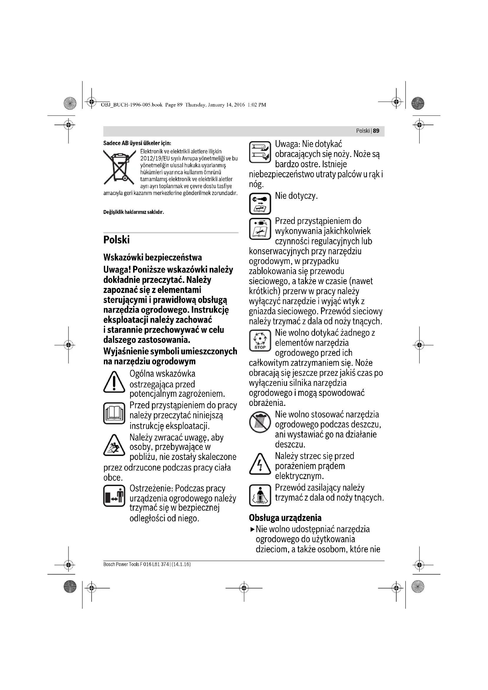 Denizli Tel.: 0258 2620666 Bulut Elektrik İstasyon Cad. No: 52/B Devlet Tiyatrosu Karşısı Elazığ Tel.: 0424 2183559 Körfez Elektrik Sanayi Çarşısı 770 Sok. No: 71 Erzincan Tel.: 0446 2230959 Ege Elektrik İnönü Bulvaro No: 135 Muğla Makasarası Fethiye Fethiye Tel.: 0252 6145701 Değer İş Bobinaj İsmetpaşa Mah. İlk Belediye Başkan Cad. 5/C Şahinbey Gaziantep Tel.: 0342 2316432 Çözüm Bobinaj İsmetpaşa Mah. Eski Şahinbey Belediyesi altı Cad. No: 3/C Gaziantep Tel.: 0342 2319500 Onarım Bobinaj Raifpaşa Cad. No: 67 İskenderun Hatay Tel.: 0326 6137546 Günşah Otomotiv Beylikdüzü Sanayi Sit. No: 210 Beylikdüzü İstanbul Tel.: 0212 8720066 Aygem 10021 Sok. No: 11 AOSB Çiğli İzmir Tel.: 0232 3768074 Sezmen Bobinaj Ege İş Merkezi 1201/4 Sok. No: 4/B Yenişehir İzmir Tel.: 0232 4571465 Ankaralı Elektrik Eski Sanayi Bölgesi 3. Cad. No: 43 Kayseri Tel.: 0352 3364216 Asal Bobinaj Eski Sanayi Sitesi Barbaros Cad. No: 24 Samsun Tel.: 0362 2289090 Üstündağ Elektrikli Aletler Nusretiye Mah. Boyacılar Aralığı No: 9 Tekirdağ Tel.: 0282 6512884 Tasfiye Bahçe aletleri, aksesuar ve ambalaj malzemesi çevre dostu bir biçimde tasfiye edilmek üzere geri dönüşüm merkezine yollanmak zorundadır. Bahçe aletlerini evsel çöplerin içine atmayın! Bahçe aleti açıldıktan sonra bıçak dönmüyor Bıçakların dönmesi çim tarafından engelleniyor Bahçe aletini kapatın Tıkanmaya giderin (daima bahçe eldivenleri kullanın) Bıçak somunu/-cıvatası gevşek Bıçak somununu/-cıvatasını sıkın (17 Nm) Aşırı titreşim ve gürültü var Bıçak somunu/-cıvatası gevşek Bıçak somununu/-cıvatasını sıkın (17 Nm) Bıçaklar hasarlı Bıçak değiştirme Hata göstergesi Olası neden Giderilme yolu OBJ_BUCH-1996-005.book Page 88 Thursday, January 14, 2016 1:02 PMPolski | 89 Bosch Power Tools F 016 L81 374 | (14.1.16) Sadece AB üyesi ülkeler için: Elektronik ve elektrikli aletlere ilişkin 2012/19/EU sıyılı Avrupa yönetmeliği ve bu yönetmeliğin ulusal hukuka uyarlanmış hükümleri uyarınca kullanım ömrünü tamamlamış elektronik ve elektrikli aletler ayrı ayrı toplanmak ve çevre dostu tasfiye amacıyla geri kazanım merkezlerine gönderilmek zorundadır. Değişiklik haklarımız saklıdır. Polski Wskazówki bezpieczeństwa Uwaga! Poniższe wskazówki należy dokładnie przeczytać. Należy zapoznać się z elementami sterującymi i prawidłową obsługą narzędzia ogrodowego. Instrukcję eksploatacji należy zachować i starannie przechowywać w celu dalszego zastosowania. Wyjaśnienie symboli umieszczonych na narzędziu ogrodowym Ogólna wskazówka ostrzegająca przed potencjalnym zagrożeniem. Przed przystąpieniem do pracy należy przeczytać niniejszą instrukcję eksploatacji. Należy zwracać uwagę, aby osoby, przebywające w pobliżu, nie zostały skaleczone przez odrzucone podczas pracy ciała obce. Ostrzeżenie: Podczas pracy urządzenia ogrodowego należy trzymać się w bezpiecznej odległości od niego. Uwaga: Nie dotykać obracających się noży. Noże są bardzo ostre. Istnieje niebezpieczeństwo utraty palców u rąk i nóg. Nie dotyczy. Przed przystąpieniem do wykonywania jakichkolwiek czynności regulacyjnych lub konserwacyjnych przy narzędziu ogrodowym, w przypadku zablokowania się przewodu sieciowego, a także w czasie (nawet krótkich) przerw w pracy należy wyłączyć narzędzie i wyjąć wtyk z gniazda sieciowego. Przewód sieciowy należy trzymać z dala od noży tnących. Nie wolno dotykać żadnego z elementów narzędzia ogrodowego przed ich całkowitym zatrzymaniem się. Noże obracają się jeszcze przez jakiś czas po wyłączeniu silnika narzędzia ogrodowego i mogą spowodować obrażenia. Nie wolno stosować narzędzia ogrodowego podczas deszczu, ani wystawiać go na działanie deszczu. Należy strzec się przed porażeniem prądem elektrycznym. Przewód zasilający należy trzymać z dala od noży tnących. Obsługa urządzenia Nie wolno udostępniać narzędzia ogrodowego do użytkowania dzieciom, a także osobom, które nie OBJ_BUCH-1996-005.book Page 89 Thursday, January 14, 2016 1:02 PM90 | Polski F 016 L81 374 | (14.1.16) Bosch Power Tools zapoznały się z niniejszymi zaleceniami. Należy zwrócić uwagę, czy w danym kraju nie istnieją przepisy, ograniczające wiek użytkownika podobnych narzędzi. Nieużywane narzędzie ogrodowe należy przechowywać w miejscu niedostępnym dla dzieci. Niniejsze narzędzie ogrodowe nie jest dostosowane do obsługi przez dzieci, osoby ograniczone fizycznie, emocjonalnie lub psychicznie, a także przez osoby z niewystarczającym doświadczeniem i/lub niedostateczną wiedzą. Wyjątek stanowi sytuacja, w której znajdują się one pod nadzorem osoby odpowiedzialnej za ich bezpieczeństwo i otrzymują od tej osoby instrukcje dotyczące posługiwania się narzędziem ogrodowym. Dzieci powinny znajdować się pod nadzorem, a narzędzie ogrodowe zabezpieczone w taki sposób, żeby nie mogły się one nim bawić. Nie wolno nigdy kosić trawy, jeżeli w pobliżu znajdują się osoby postronne, w szczególności dzieci lub zwierzęta domowe. Osoba obsługująca lub użytkująca urządzenie odpowiedzialna jest za wypadki i szkody na osobie i mieniu, wyrządzone innym osobom. Nie wolno używać narzędzia ogrodowego boso ani w odkrytym obuwiu. Podczas pracy należy zawsze zakładać stabilne obuwie robocze i długie spodnie. Przed przystąpieniem do pracy dokładnie zbadać teren, na którym będzie użyte urządzenie i usunąć z niego wszystkie kamienie, gałęzie, druty, kości i inne przedmioty. Przed każdym przystąpieniem do pracy należy sprawdzić stan techniczny noży, śrub i zespołów tnących pod kątem ich zużycia lub uszkodzenia. Zużyte bądź uszkodzone noże, jak i śruby, przytrzymujące noże należy wymieniać całymi zestawami dla zachowania prawidłowego wyważenia. Pracować tylko w ciągu dnia lub przy dobrym sztucznym oświet