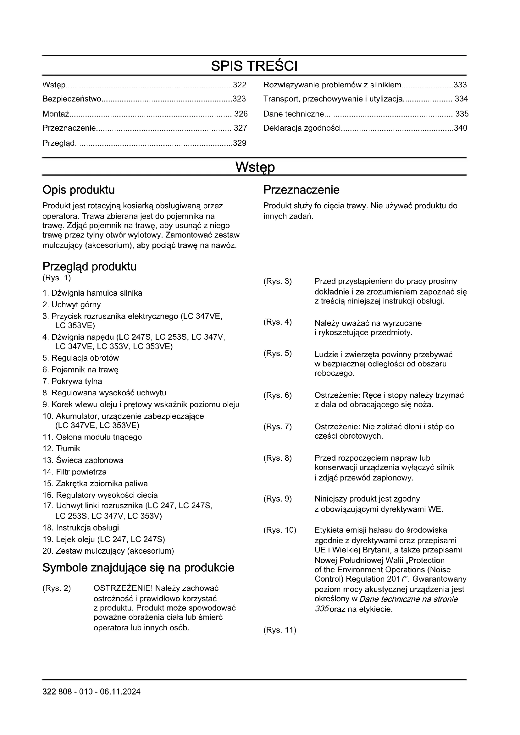 oraz na etykiecie. (Rys. 11) 322 808 - 010 - 06.11.2024Ten produkt jest zgodny z przepisami obowiązującymi w Wielkiej Brytanii. (Rys. 12) Ryzyko pożaru. (Rys. 13) Nie wdychać oparów spalin. Spaliny z silnika zawierają tlenek węgla, który jest bezwonnym, trującym i niebezpiecznym gazem. Nie należy uruchamiać silnika wewnątrz pomieszczeń lub w zamkniętych przestrzeniach. (Rys. 14) Gorąca powierzchnia. (Rys. 16) Przed uruchomieniem urzą- dzenia należy napełnić silnik olejem. (Rys. 17) Wykonać czynności rozrucho- we dla LC247, LC247S, LC253S, LC347V, LC353V: Popchnąć dźwignię hamulca silnika w dół i pociągnąć rącz- kę linki rozrusznika. (Rys. 18) Wykonać czynności rozrucho- we dla LC347VE, LC353VE: Popchnąć dźwignię hamulca silnika w dół i nacisnąć włącz- nik. (Rys. 15) Kod do przeskanowania Uwaga: Pozostałe symbole/naklejki samoprzylepne umieszczone na produkcie dotyczą wymogów związanych z certyfikatami w innych obszarach komercyjnych. Emisje Euro V OSTRZEŻENIE: Ingerencja w silnik powoduje unieważnienie europejskiego zatwierdzenia typu produktu. Uszkodzenie produktu Nie odpowiadamy za uszkodzenia naszego produktu, w przypadku gdy: