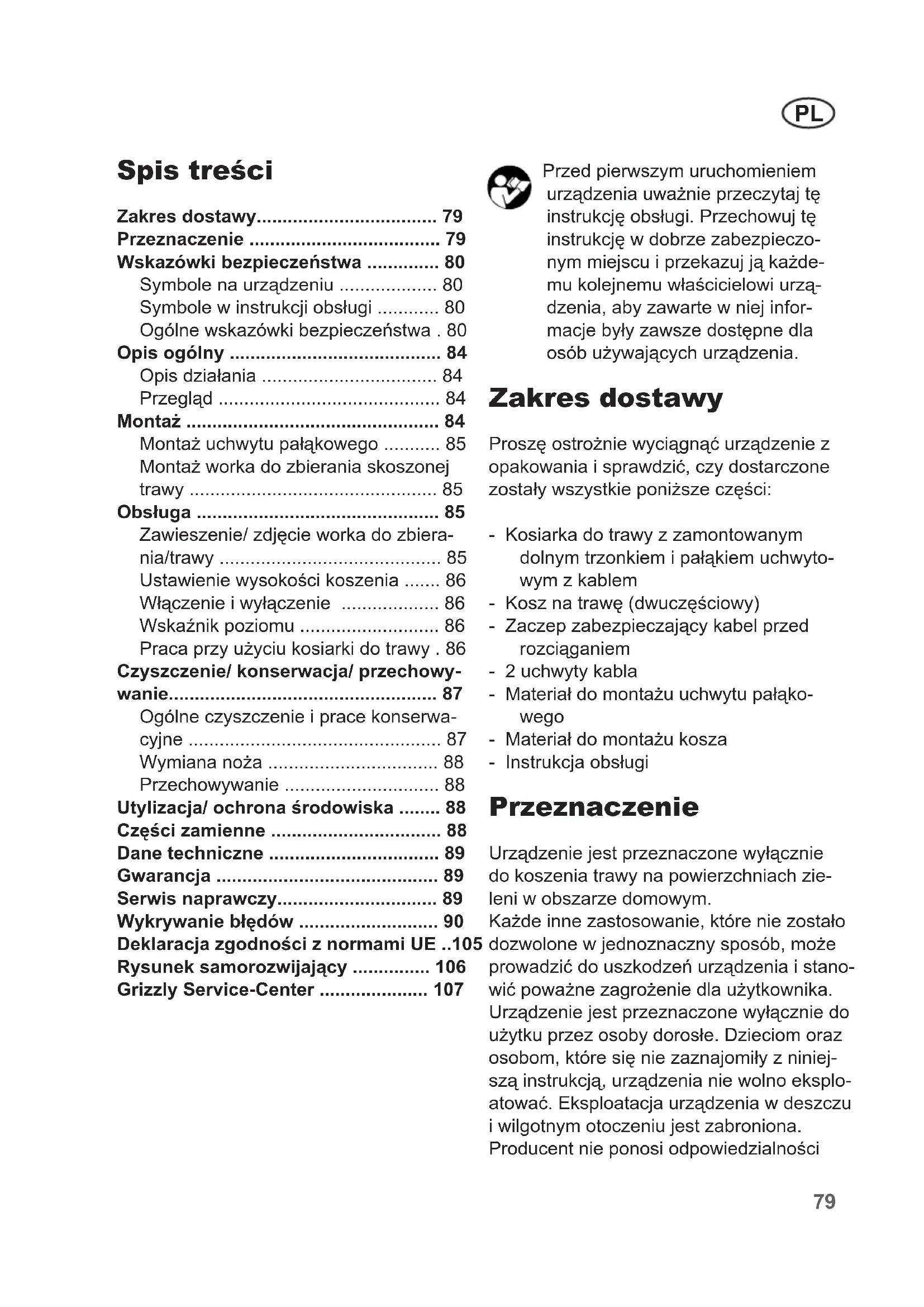 - Grizzly Service-Center Przed pierwszym uruchomieniem urządzenia uważnie przeczytaj tę instrukcję obsługi. Przechowuj tę instrukcję w dobrze zabezpieczo- nym miejscu i przekazuj ją każde- mu kolejnemu właścicielowi urzą- dzenia, aby zawarte w niej infor- macje były zawsze dostępne dla osób używających urządzenia. Zakres dostawy Proszę ostrożnie wyciągnąć urządzenie z opakowania i sprawdzić, czy dostarczone zostały wszystkie poniższe części: - Kosiarka do trawy z zamontowanym dolnym trzonkiem i pałąkiem uchwyto- wym z kablem - Kosz na trawę (dwuczęściowy) - Zaczep zabezpieczający kabel przed rozciąganiem - 2 uchwyty kabla - Materiał do montażu uchwytu pałąko- wego - Materiał do montażu kosza - Instrukcja obsługi Przeznaczenie Urządzenie jest przeznaczone wyłącznie do koszenia trawy na powierzchniach zie- leni w obszarze domowym. Każde inne zastosowanie, które nie zostało dozwolone w jednoznaczny sposób, może prowadzić do uszkodzeń urządzenia i stano- wić poważne zagrożenie dla użytkownika. Urządzenie jest przeznaczone wyłącznie do użytku przez osoby dorosłe. Dzieciom oraz osobom, które się nie zaznajomiły z niniej- szą instrukcją, urządzenia nie wolno eksplo- atować. Eksploatacja urządzenia w deszczu i wilgotnym otoczeniu jest zabroniona. Producent nie ponosi odpowiedzialności80 p. 107