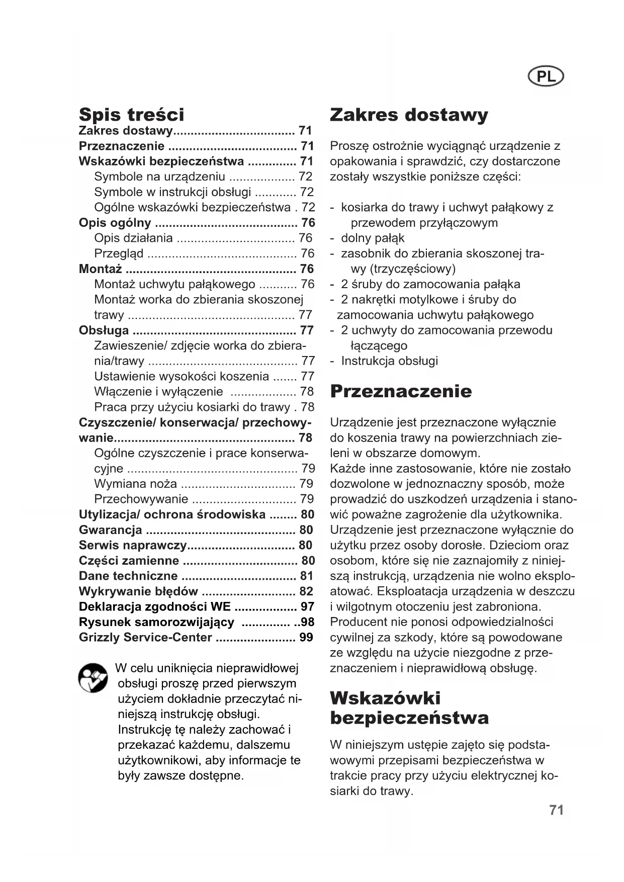 - Grizzly Service-Center W celu uniknięcia nieprawidłowej obsługi proszę przed pierwszym użyciem dokładnie przeczytać ni- niejszą instrukcję obsługi. Instrukcję tę należy zachować i przekazać każdemu, dalszemu użytkownikowi, aby informacje te były zawsze dostępne. Zakres dostawy Proszę ostrożnie wyciągnąć urządzenie z opakowania i sprawdzić, czy dostarczone zostały wszystkie poniższe części: - kosiarka do trawy i uchwyt pałąkowy z przewodem przyłączowym - dolny pałąk - zasobnik do zbierania skoszonej tra- wy (trzyczęściowy) - 2 śruby do zamocowania pałąka - 2 nakrętki motylkowe i śruby do zamocowania uchwytu pałąkowego - 2 uchwyty do zamocowania przewodu łączącego - Instrukcja obsługi Przeznaczenie Urządzenie jest przeznaczone wyłącznie do koszenia trawy na powierzchniach zie- leni w obszarze domowym. Każde inne zastosowanie, które nie zostało dozwolone w jednoznaczny sposób, może prowadzić do uszkodzeń urządzenia i stano- wić poważne zagrożenie dla użytkownika. Urządzenie jest przeznaczone wyłącznie do użytku przez osoby dorosłe. Dzieciom oraz osobom, które się nie zaznajomiły z niniej- szą instrukcją, urządzenia nie wolno eksplo- atować. Eksploatacja urządzenia w deszczu i wilgotnym otoczeniu jest zabroniona. Producent nie ponosi odpowiedzialności cywilnej za szkody, które są powodowane ze względu na użycie niezgodne z prze- znaczeniem i nieprawidłową obsługę. Wskazówki bezpieczeństwa W niniejszym ustępie zajęto się podsta- wowymi przepisami bezpieczeństwa w trakcie pracy przy użyciu elektrycznej ko- siarki do trawy.PL p. 99