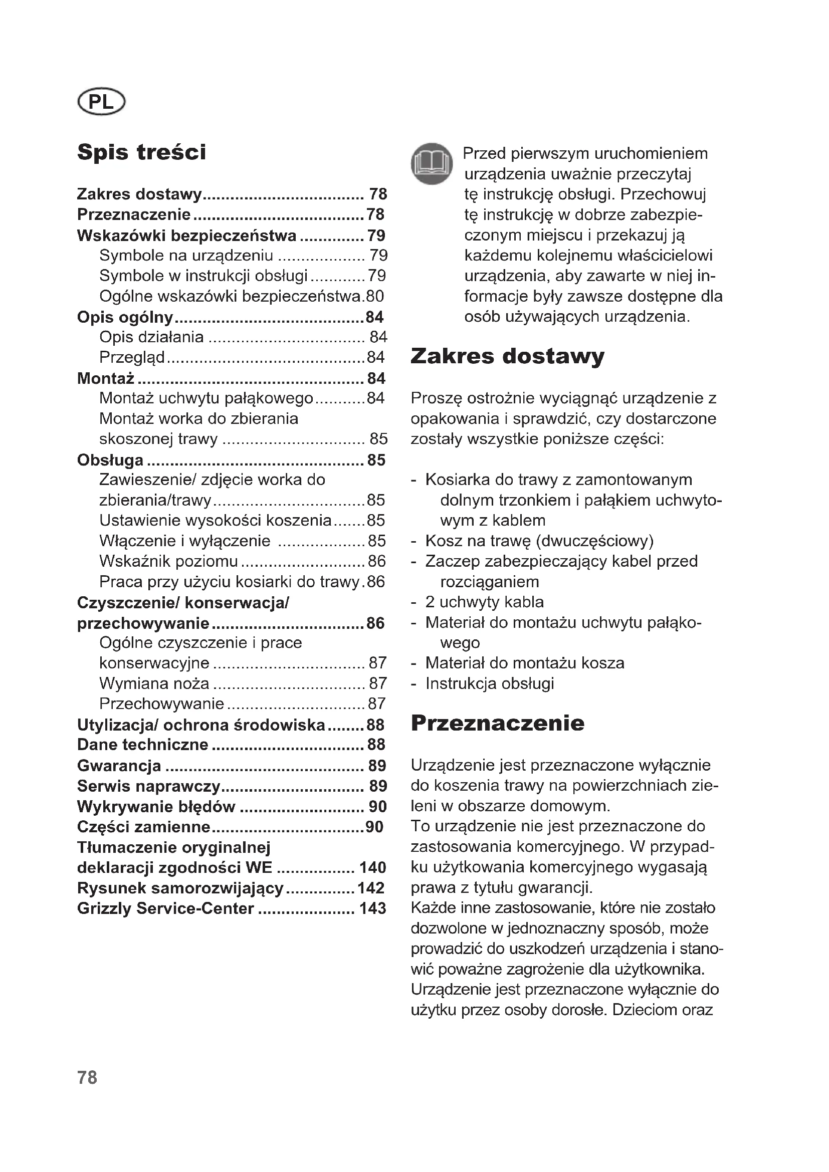 - Grizzly Service-Center Przed pierwszym uruchomieniem urządzenia uważnie przeczytaj tę instrukcję obsługi. Przechowuj tę instrukcję w dobrze zabezpie- czonym miejscu i przekazuj ją każdemu kolejnemu właścicielowi urządzenia, aby zawarte w niej in- formacje były zawsze dostępne dla osób używających urządzenia. Zakres dostawy Proszę ostrożnie wyciągnąć urządzenie z opakowania i sprawdzić, czy dostarczone zostały wszystkie poniższe części: - Kosiarka do trawy z zamontowanym dolnym trzonkiem i pałąkiem uchwyto- wym z kablem - Kosz na trawę (dwuczęściowy) - Zaczep zabezpieczający kabel przed rozciąganiem - 2 uchwyty kabla - Materiał do montażu uchwytu pałąko- wego - Materiał do montażu kosza - Instrukcja obsługi Przeznaczenie Urządzenie jest przeznaczone wyłącznie do koszenia trawy na powierzchniach zie- leni w obszarze domowym. To urządzenie nie jest przeznaczone do zastosowania komercyjnego. W przypad- ku użytkowania komercyjnego wygasają prawa z tytułu gwarancji. Każde inne zastosowanie, które nie zostało dozwolone w jednoznaczny sposób, może prowadzić do uszkodzeń urządzenia i stano- wić poważne zagrożenie dla użytkownika. Urządzenie jest przeznaczone wyłącznie do użytku przez osoby dorosłe. Dzieciom oraz79 p. 143