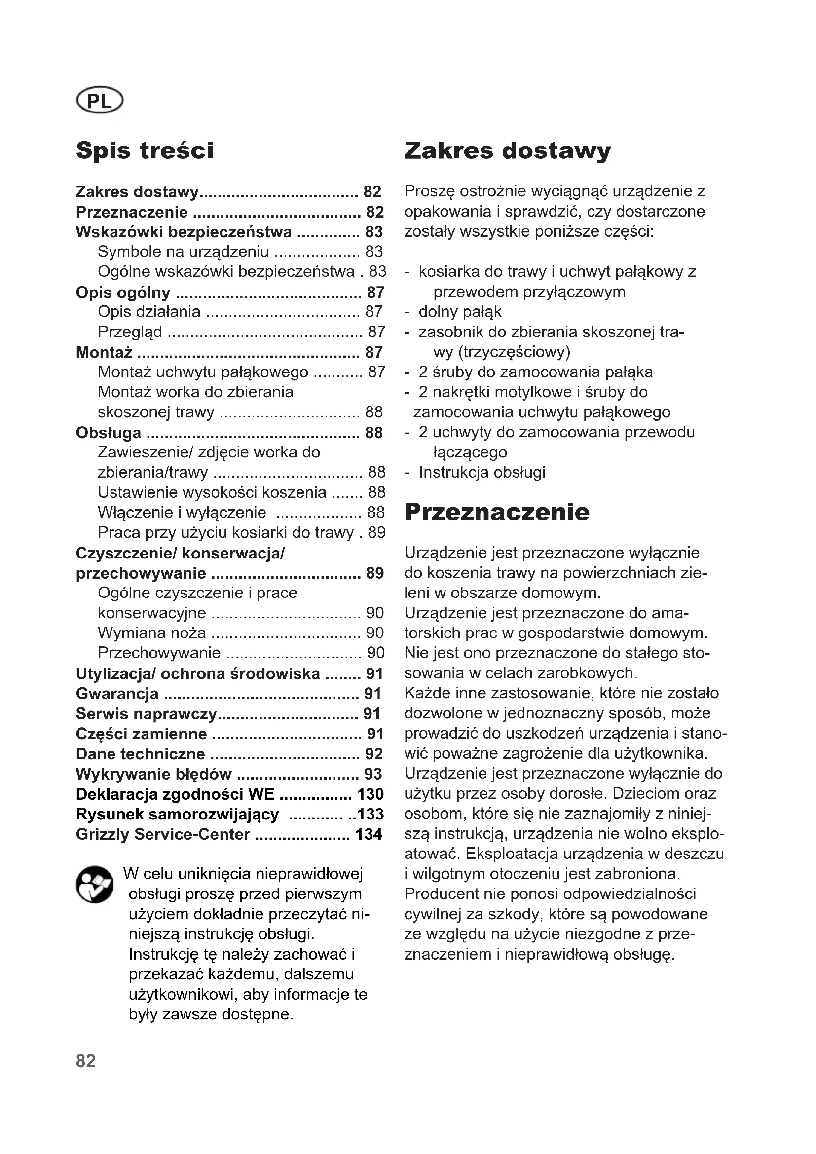 - Grizzly Service-Center W celu uniknięcia nieprawidłowej obsługi proszę przed pierwszym użyciem dokładnie przeczytać ni- niejszą instrukcję obsługi. Instrukcję tę należy zachować i przekazać każdemu, dalszemu użytkownikowi, aby informacje te były zawsze dostępne. Zakres dostawy Proszę ostrożnie wyciągnąć urządzenie z opakowania i sprawdzić, czy dostarczone zostały wszystkie poniższe części: - kosiarka do trawy i uchwyt pałąkowy z przewodem przyłączowym - dolny pałąk - zasobnik do zbierania skoszonej tra- wy (trzyczęściowy) - 2 śruby do zamocowania pałąka - 2 nakrętki motylkowe i śruby do zamocowania uchwytu pałąkowego - 2 uchwyty do zamocowania przewodu łączącego - Instrukcja obsługi Przeznaczenie Urządzenie jest przeznaczone wyłącznie do koszenia trawy na powierzchniach zie- leni w obszarze domowym. Urządzenie jest przeznaczone do ama- torskich prac w gospodarstwie domowym. Nie jest ono przeznaczone do stałego sto- sowania w celach zarobkowych. Każde inne zastosowanie, które nie zostało dozwolone w jednoznaczny sposób, może prowadzić do uszkodzeń urządzenia i stano- wić poważne zagrożenie dla użytkownika. Urządzenie jest przeznaczone wyłącznie do użytku przez osoby dorosłe. Dzieciom oraz osobom, które się nie zaznajomiły z niniej- szą instrukcją, urządzenia nie wolno eksplo- atować. Eksploatacja urządzenia w deszczu i wilgotnym otoczeniu jest zabroniona. Producent nie ponosi odpowiedzialności cywilnej za szkody, które są powodowane ze względu na użycie niezgodne z prze- znaczeniem i nieprawidłową obsługę.PL p. 134