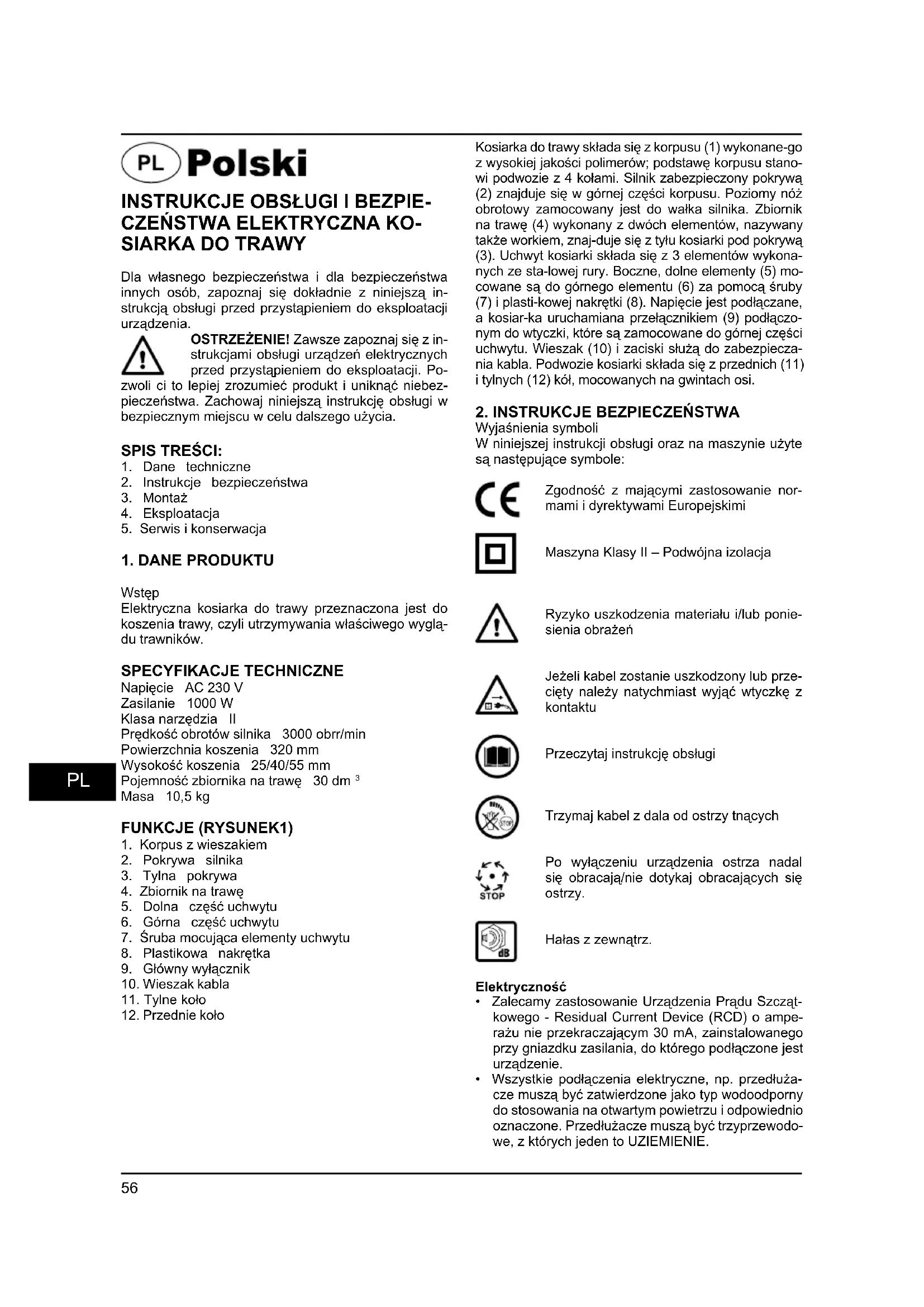 Wstęp Elektryczna kosiarka do trawy przeznaczona jest do koszenia trawy, czyli utrzymywania właściwego wyglą- du trawników. SPECYFIKACJE TECHNICZNE Napięcie AC 230 V Zasilanie 1000 W Klasa narzędzia II Prędkość obrotów silnika 3000 obrr/min Powierzchnia koszenia 320 mm Wysokość koszenia 25/40/55 mm Pojemność zbiornika na trawę 30 dm