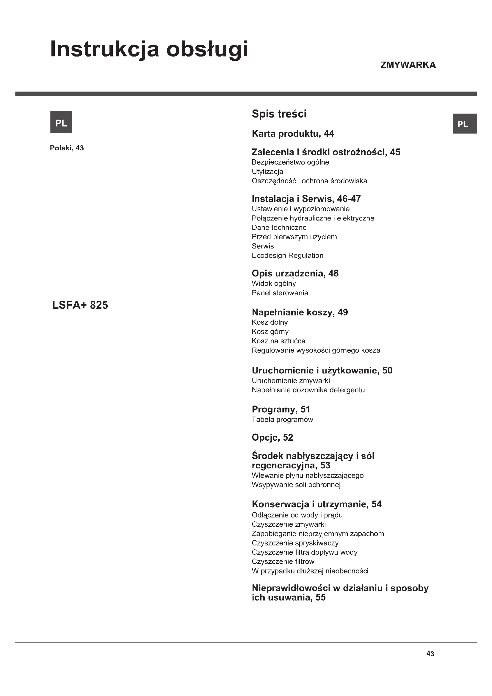 LSFA+ 825 ZMYWARKA Spis treści Karta produktu, 44 Zalecenia i środki ostrożności, 45 Bezpieczeństwo ogólne Utylizacja Oszczędność i ochrona środowiska Instalacja i Serwis, 46-47 Ustawienie i wypoziomowanie Połączenie hydrauliczne i elektryczne Dane techniczne Przed pierwszym użyciem Serwis Ecodesign Regulation Opis urządzenia, 48 Widok ogólny Panel sterowania Napełnianie koszy, 49 Kosz dolny Kosz górny Kosz na sztućce Regulowanie wysokości górnego kosza Uruchomienie i użytkowanie, 50 Uruchomienie zmywarki Napełnianie dozownika detergentu Programy, 51 Tabela programów Opcje, 52 Środek nabłyszczający i sól regeneracyjna, 53 Wlewanie płynu nabłyszczającego Wsypywanie soli ochronnej Konserwacja i utrzymanie, 54 Odłączenie od wody i prądu Czyszczenie zmywarki Zapobieganie nieprzyjemnym zapachom Czyszczenie spryskiwaczy Czyszczenie ltra dopływu wody Czyszczenie ltrów W przypadku dłuższej nieobecności Nieprawidłowości w działaniu i sposoby ich usuwania, 55PL