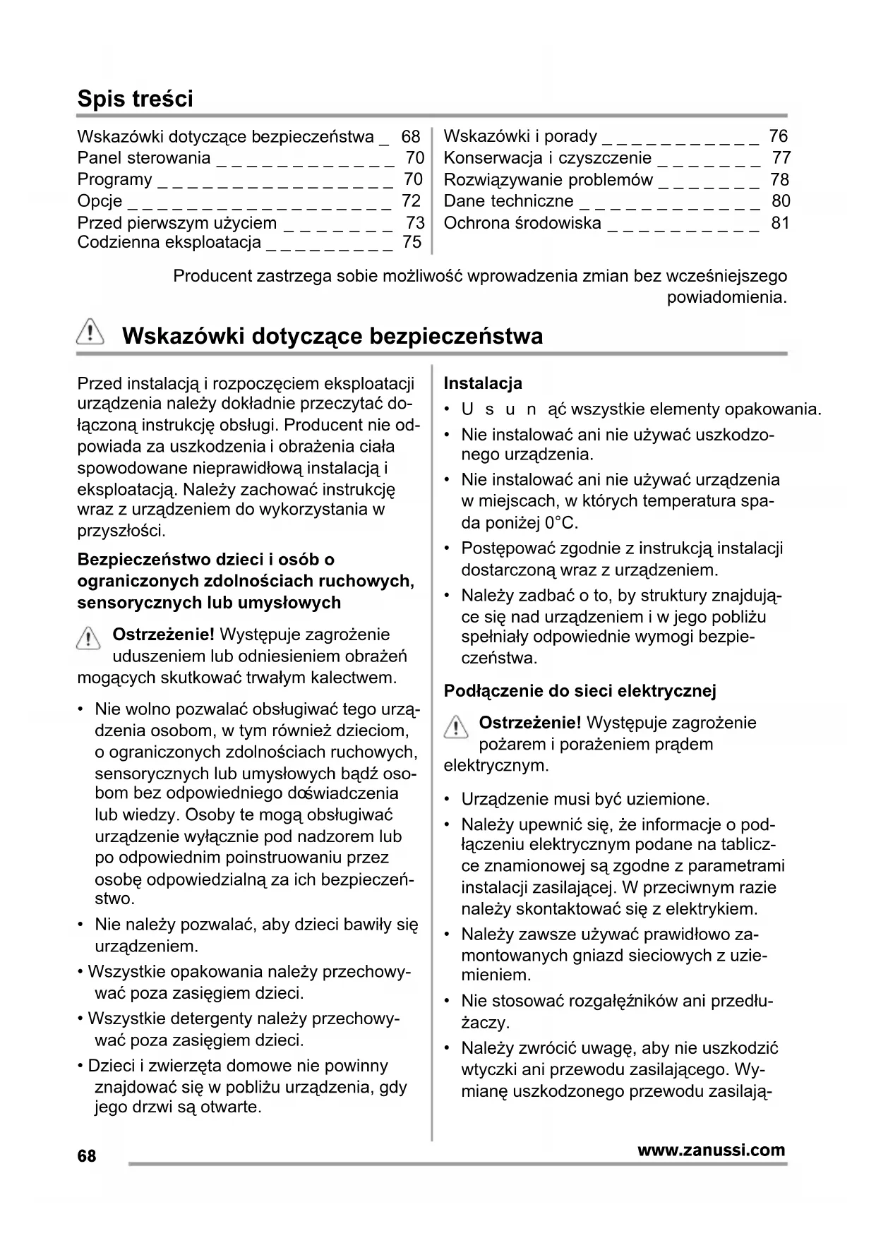 www.zanussi.comSpis treści Wskazówki dotyczące bezpieczeństwa _ 68 Panel sterowania _ _ _ _ _ _ _ _ _ _ _ _ 70 Programy _ _ _ _ _ _ _ _ _ _ _ _ _ _ _ _ 70 Opcje _ _ _ _ _ _ _ _ _ _ _ _ _ _ _ _ _ _ 72 Przed pierwszym użyciem _ _ _ _ _ _ _ 73 Codzienna eksploatacja _ _ _ _ _ _ _ _ _ 75 Wskazówki i porady _ _ _ _ _ _ _ _ _ _ _ 76 Konserwacja i czyszczenie _ _ _ _ _ _ _ 77 Rozwiązywanie problemów _ _ _ _ _ _ _ 78 Dane techniczne _ _ _ _ _ _ _ _ _ _ _ _ 80 Ochrona środowiska _ _ _ _ _ _ _ _ _ _ 81 Producent zastrzega sobie możliwość wprowadzenia zmian bez wcześniejszego powiadomienia. Wskazówki dotyczące bezpieczeństwa Przed instalacją i rozpoczęciem eksploatacji urządzenia należy dokładnie przeczytać do- łączoną instrukcję obsługi. Producent nie od- powiada za uszkodzenia i obrażenia ciała spowodowane nieprawidłową instalacją i eksploatacją. Należy zachować instrukcję wraz z urządzeniem do wykorzystania w przyszłości. Bezpieczeństwo dzieci i osób o ograniczonych zdolnościach ruchowych, sensorycznych lub umysłowych Ostrzeżenie! Występuje zagrożenie uduszeniem lub odniesieniem obrażeń mogących skutkować trwałym kalectwem.