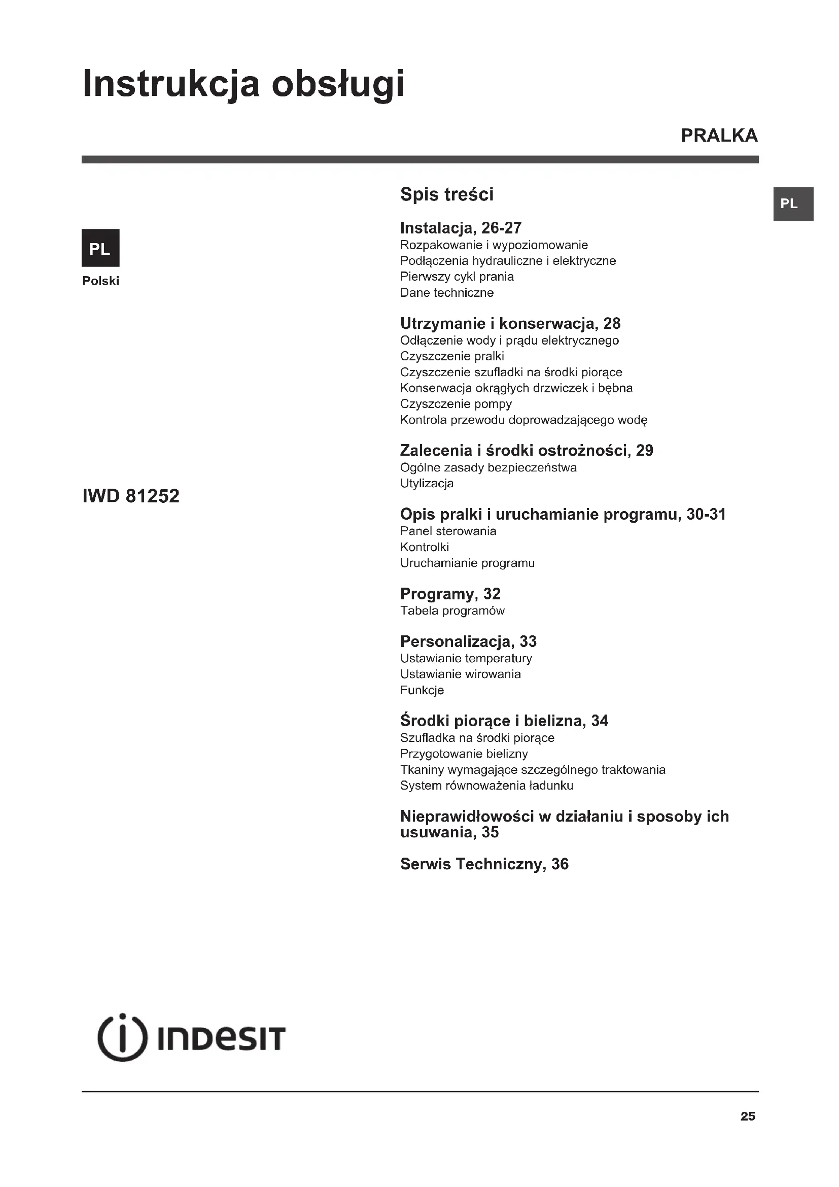 Spis treści Instalacja, 26-27 Rozpakowanie i wypoziomowanie Podłączenia hydrauliczne i elektryczne Pierwszy cykl prania Dane techniczne Utrzymanie i konserwacja, 28 Odłączenie wody i prądu elektrycznego Czyszczenie pralki Czyszczenie szuadki na środki piorące Konserwacja okrągłych drzwiczek i bębna Czyszczenie pompy Kontrola przewodu doprowadzającego wodę Zalecenia i środki ostrożności, 29 Ogólne zasady bezpieczeństwa Utylizacja Opis pralki i uruchamianie programu, 30-31 Panel sterowania Kontrolki Uruchamianie programu Programy, 32 Tabela programów Personalizacja, 33 Ustawianie temperatury Ustawianie wirowania Funkcje Środki piorące i bielizna, 34 Szuadka na środki piorące Przygotowanie bielizny Tkaniny wymagające szczególnego traktowania System równoważenia ładunku Nieprawidłowości w działaniu i sposoby ich usuwania, 35 Serwis Techniczny, 36 IWD 81252 Instrukcja obsługi PRALKA Polski PL26