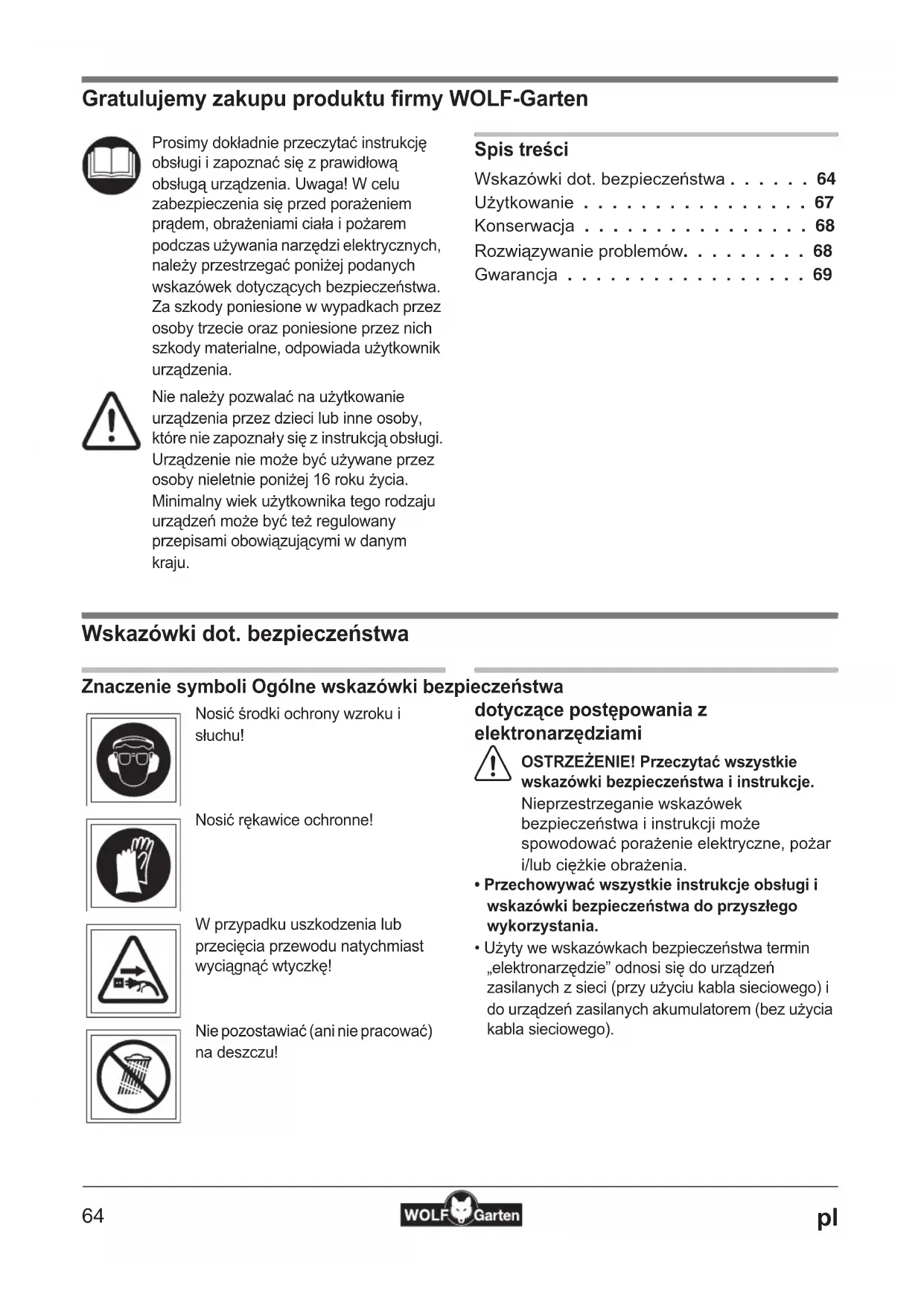 - Gratulujemy zakupu produktu firmy WOLF-Garten Spis treci Wskazówki dot. bezpieczestwa p. 64