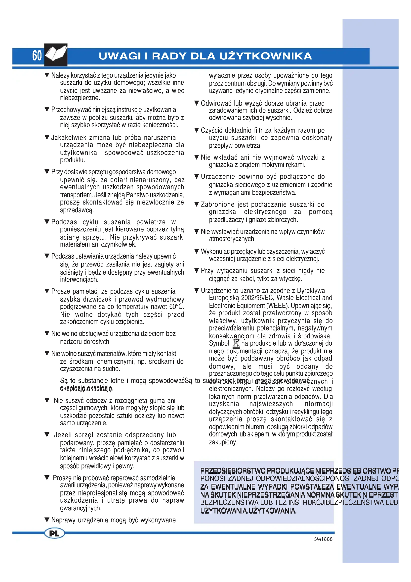 ▼ Nale˝y korzystaç z tego urzàdzenia jedynie jako suszarki do u˝ytku domowego; wszelkie inne u˝ycie jest uwa˝ane za niew∏aÊciwe, a wi´c niebezpieczne. ▼ Przechowywaç niniejszà instrukcj´ u˝ytkowania zawsze w pobli˝u suszarki, aby mo˝na by∏o z niej szybko skorzystaç w razie koniecznoÊci. ▼ Jakakolwiek zmiana lub próba naruszenia urzàdzenia mo˝e byç niebezpieczna dla u˝ytkownika i spowodowaç uszkodzenia produktu. ▼ Przy dostawie sprz´tu gospodarstwa domowego upewniç si´, ˝e dotar∏ nienaruszony, bez ewentualnych uszkodzeƒ spowodowanych transportem. JeÊli znajdà Paƒstwo uszkodzenia, prosz´ skontaktowaç si´ niezw∏ocznie ze sprzedawcà. ▼ Podczas cyklu suszenia powietrze w pomieszczeniu jest kierowane poprzez tylnà Êcian´ sprz´tu. Nie przykrywaç suszarki materia∏em ani czymkolwiek. ▼ Podczas ustawiania urzàdzenia nale˝y upewniç si´, ˝e przewód zasilania nie jest zagi´ty ani ÊciÊni´ty i b´dzie dost´pny przy ewentualnych interwencjach. ▼ Prosz´ pami´taç, ˝e podczas cyklu suszenia szybka drzwiczek i przewód wydmuchowy podgrzewane sà do temperatury nawet 60°C. Nie wolno dotykaç tych cz´Êci przed zakoƒczeniem cyklu ozi´bienia. ▼ Nie wolno obs∏ugiwaç urzàdzenia dzieciom bez nadzoru doros∏ych. ▼ Nie wolno suszyç materia∏ów, które mia∏y kontakt ze Êrodkami chemicznymi, np. Êrodkami do czyszczenia na sucho. Sà to substancje lotne i mogà spowodowaçSà to substancje lotne i mogà spowodowaç Sà to substancje lotne i mogà spowodowaçSà to substancje lotne i mogà spowodowaç Sà to substancje lotne i mogà spowodowaç eksplozj´.eksplozj´. eksplozj´.eksplozj´. eksplozj´. ▼ Nie suszyç odzie˝y z rozciàgni´tà gumà ani cz´Êci gumowych, które mog∏yby stopiç si´ lub uszkodziç pozosta∏e sztuki odzie˝y lub nawet samo urzàdzenie. ▼ Je˝eli sprz´t zostanie odsprzedany lub podarowany, prosz´ pami´taç o dostarczeniu tak˝e niniejszego podr´cznika, co pozwoli kolejnemu w∏aÊcicielowi korzystaç z suszarki w sposób prawid∏owy i pewny. ▼ Prosz´ nie próbowaç reperowaç samodzielnie awarii urzàdzenia, poniewa˝ naprawy wykonane przez nieprofesjonalist´ mogà spowodowaç uszkodzenia i utrat´ prawa do napraw gwarancyjnych. ▼ Naprawy urzàdzenia mogà byç wykonywane wy∏àcznie przez osoby upowa˝nione do tego przez centrum obs∏ugi. Do wymiany powinny byç u˝ywane jedynie oryginalne cz´Êci zamienne. ▼ Odwirowaç lub wy˝àç dobrze ubrania przed za∏adowaniem ich do suszarki. Odzie˝ dobrze odwirowana szybciej wyschnie. ▼ CzyÊciç dok∏adnie filtr za ka˝dym razem po u˝yciu suszarki, co zapewnia doskona∏y przep∏yw powietrza. ▼ Nie wk∏adaç ani nie wyjmowaç wtyczki z gniazdka z pràdem mokrymi r´kami. ▼ Urzàdzenie powinno byç pod∏àczone do gniazdka sieciowego z uziemieniem i zgodnie z wymaganiami bezpieczeƒstwa. ▼ Zabronione jest pod∏àczanie suszarki do gniazdka elektrycznego za pomocà przed∏u˝aczy i gniazd zbiorczych. ▼ Nie wystawiaç urzàdzenia na wp∏yw czynników atmosferycznych. ▼ Wykonujàc przeglàdy lub czyszczenia, wy∏àczyç wczeÊniej urzàdzenie z sieci elektrycznej. ▼ Przy wy∏àczaniu suszarki z sieci nigdy nie ciàgnàç za kabel, tylko za wtyczk´. ▼ Urzàdzenie to uznano za zgodne z Dyrektywà Europejskà 2002/96/EC, Waste Electrical and Electronic Equipment (WEEE). Upewniajàc si´, ˝e produkt zosta∏ przetworzony w sposób w∏aÊciwy, u˝ytkownik przyczynia si´ do przeciwdzia∏aniu potencjalnym, negatywnym konsekwencjom dla zdrowia i Êrodowiska. Symbol na produkcie lub w do∏àczonej do niego dokumentacji oznacza, ˝e produkt nie mo˝e byç poddawany obróbce jak odpad domowy, ale musi byç oddany do przeznaczonego do tego celu punktu zbiorczego do recyklingu urzàdzeƒ elektrycznych i elektronicznych. Nale˝y go roz∏o˝yç wed∏ug lokalnych norm przetwarzania odpadów. Dla uzyskania najÊwie˝szych informacji dotyczàcych obróbki, odzysku i recyklingu tego urzàdzenia prosz´ skontaktowaç si´ z odpowiednim biurem, obs∏ugà zbiórki odpadów domowych lub sklepem, w którym produkt zosta∏ zakupiony.