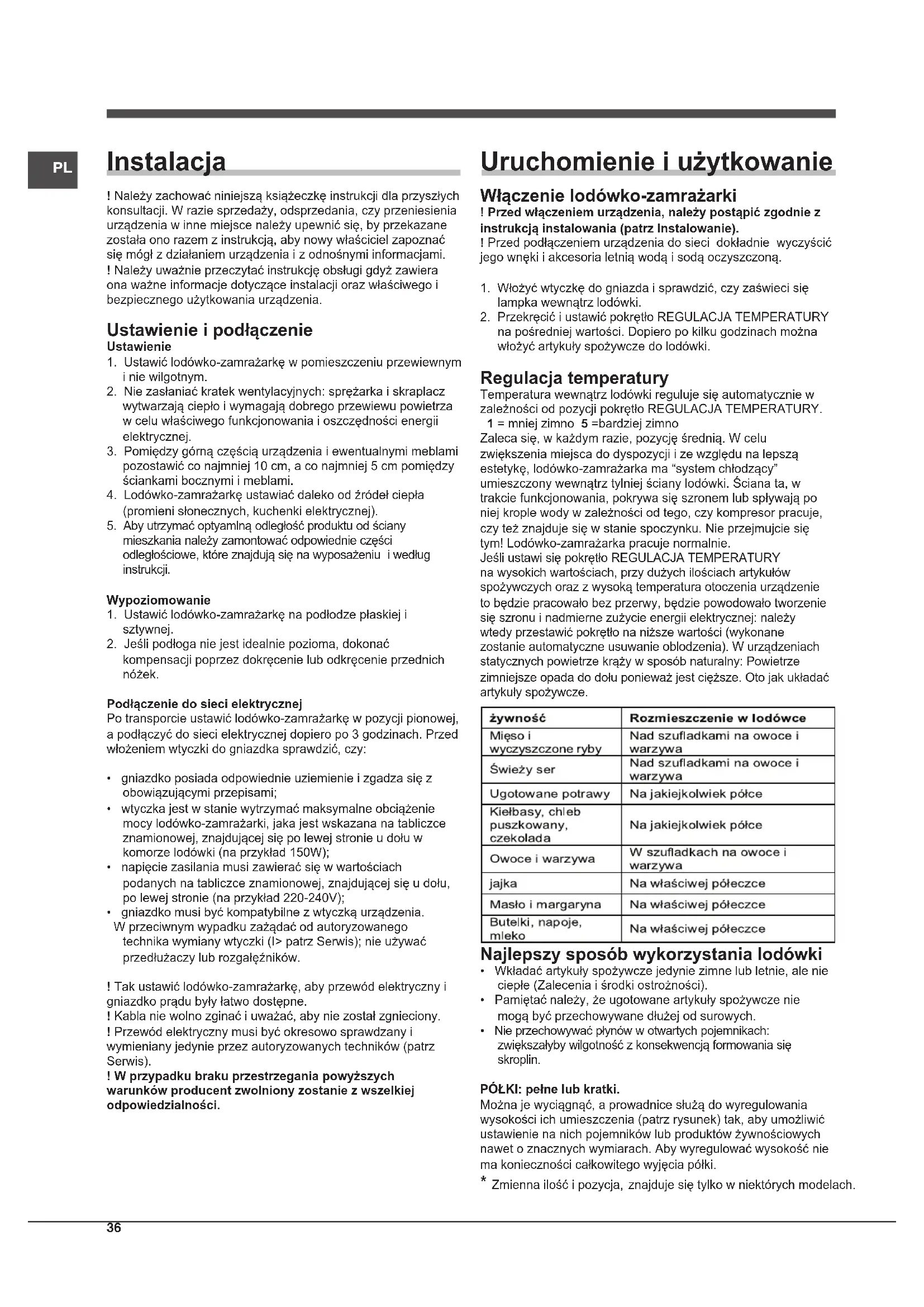 kompensacji poprzez dokręcenie lub odkręcenie przednich nóżek. Podłączenie do sieci elektrycznej Po transporcie ustawić lodówko-zamrażarkę w pozycji pionowej, a podłączyć do sieci elektrycznej dopiero po 3 godzinach. Przed włożeniem wtyczki do gniazdka sprawdzić, czy: