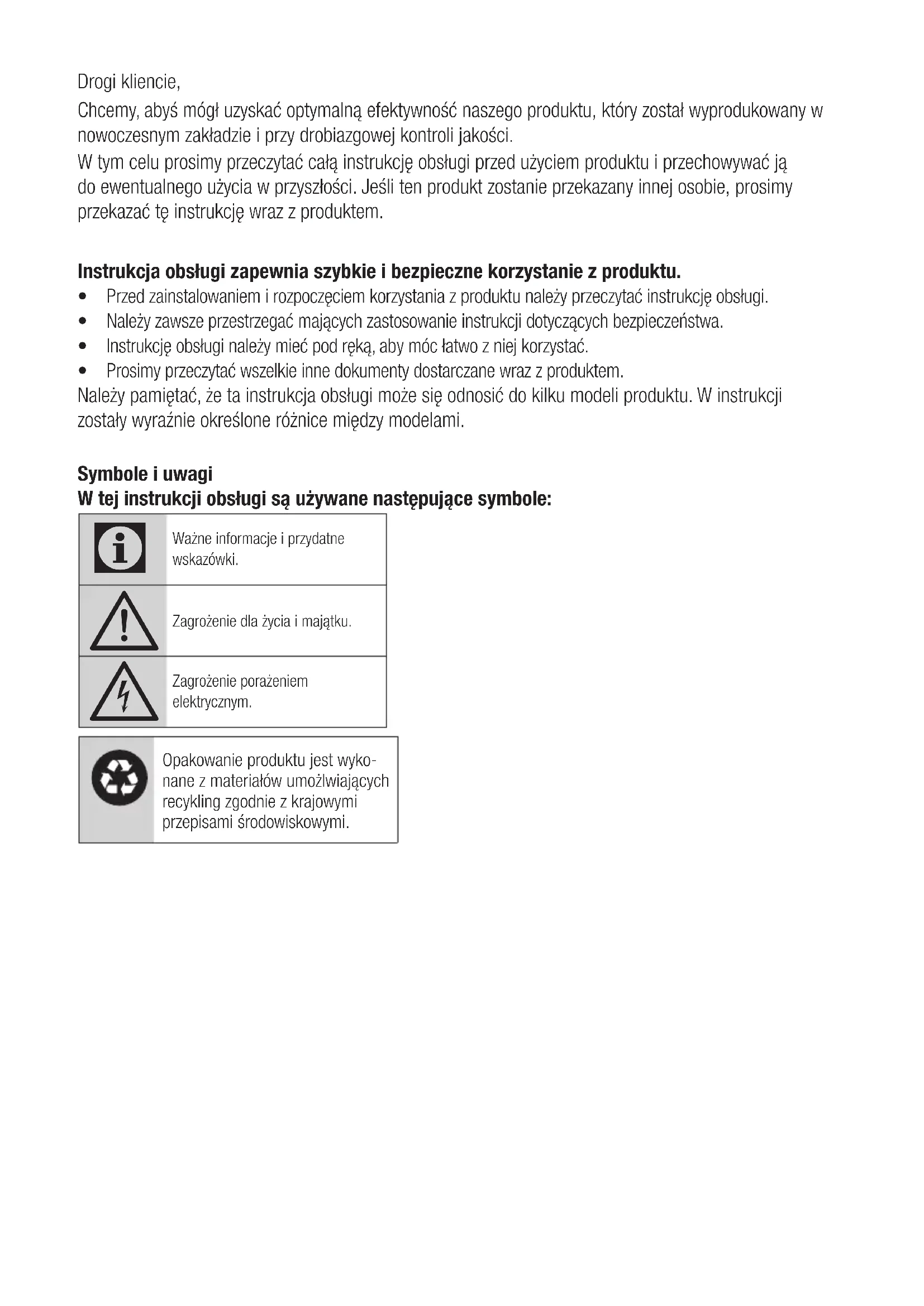 dans cette partie, contactez votre fournisseur ou un service de maintenance agréé. N’essayez pas de réparer vous-même l’appareil.Drogi kliencie, Chcemy, abyś mógł uzyskać optymalną efektywność naszego produktu, który został wyprodukowany w nowoczesnym zakładzie i przy drobiazgowej kontroli jakości. W tym celu prosimy przeczytać całą instrukcję obsługi przed użyciem produktu i przechowywać ją do ewentualnego użycia w przyszłości. Jeśli ten produkt zostanie przekazany innej osobie, prosimy przekazać tę instrukcję wraz z produktem. Instrukcja obsługi zapewnia szybkie i bezpieczne korzystanie z produktu. t Przed zainstalowaniem i rozpoczęciem korzystania z produktu należy przeczytać instrukcję obsługi. t Należy zawsze przestrzegać mających zastosowanie instrukcji dotyczących bezpieczeństwa. t Instrukcję obsługi należy mieć pod ręką, aby móc łatwo z niej korzystać. t Prosimy przeczytać wszelkie inne dokumenty dostarczane wraz z produktem. Należy pamiętać, że ta instrukcja obsługi może się odnosić do kilku modeli produktu. W instrukcji zostały wyraźnie określone różnice między modelami. Symbole i uwagi W tej instrukcji obsługi są używane następujące symbole:
