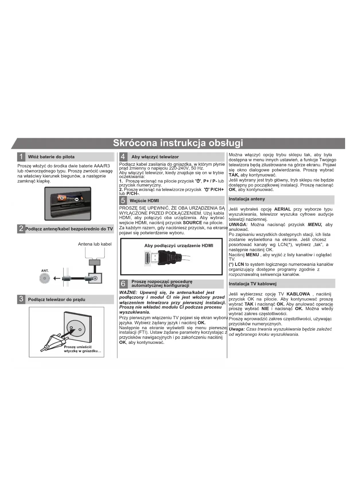 Włóż baterie do pilota Podłącz antenę/kabel bezpośrednio do TV Podłącz telewizor do prądu Wejście HDMI Aby włączyć telewizor