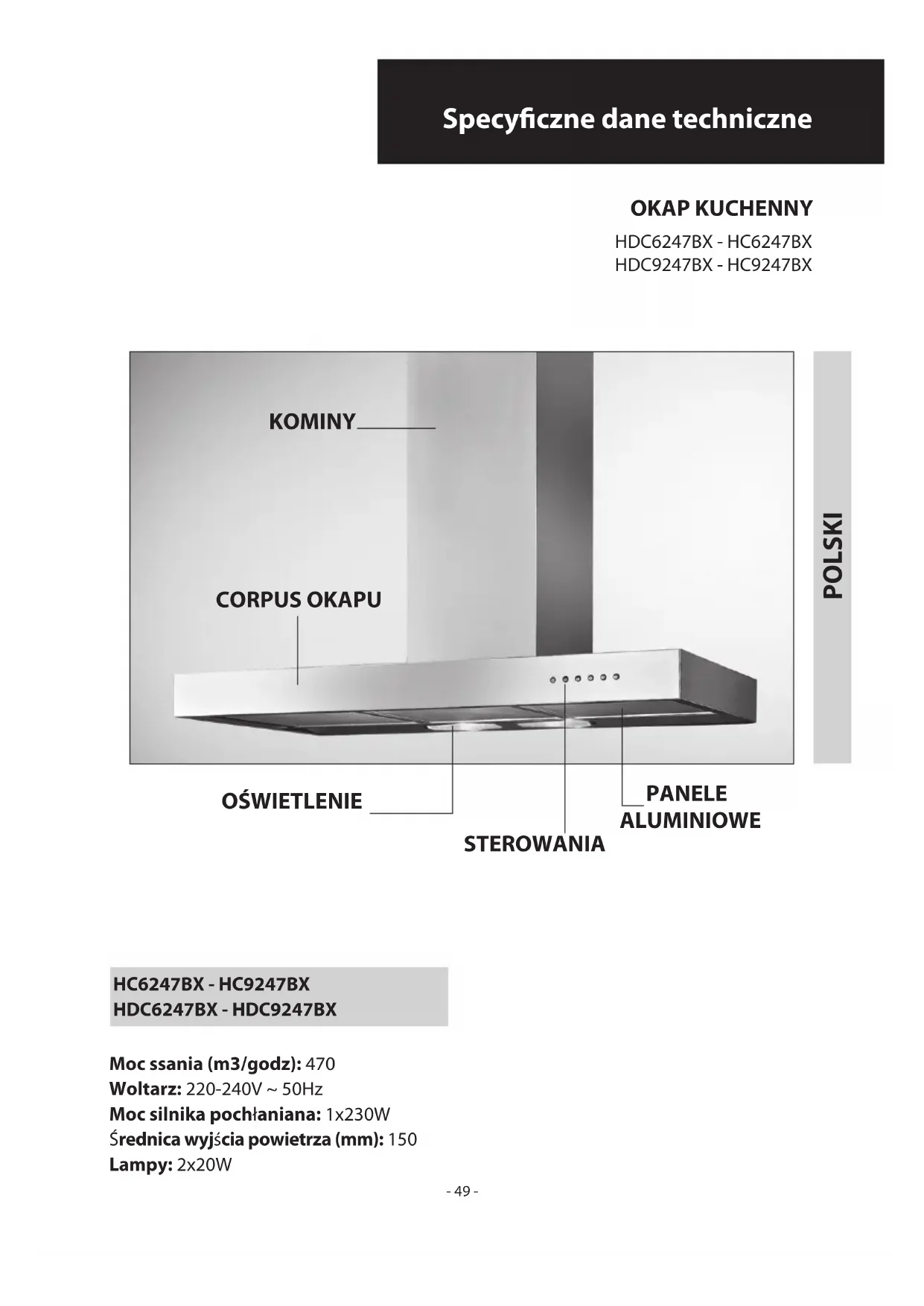 HDC9190BX - HC9190BX - HDC6190BB - HDC9190BB - HDC6190BW- HDC9190BW Specyczne dane techniczne KOMINY STEROWANIA PANELE ALUMINIOWE OŚWIETLENIE OKAP KUCHENNY POLSKI CORPUS OKAPU Moc ssania (m3/godz): 470 Woltarz: 220-240V ~ 50Hz Moc silnika pochłaniana: 1x230W Średnica wyjścia powietrza (mm): 150 Lampy: 2x20W Moc ssania (m3/godz): 900 Woltarz: 220-240V ~ 50Hz Moc silnika pochłaniana: 1x250W Średnica wyjścia powietrza (mm): 150 Lampy: 2x20W- 49 -