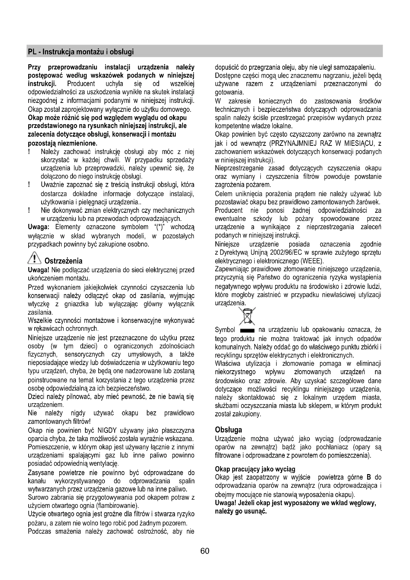 Celem unikniecia porazenia pradem nie nalezy uzywać lub pozostawić okapu bez prawidłowo zamontowych zarowek. Producent nie ponosi zadnej odpowiedzialnosci za ewentualne szkody lub poźary spowodOWane przye urzadzenie awynikAJce z nieprzestrzegania zalecen podanych w niniejszej instrukcji.